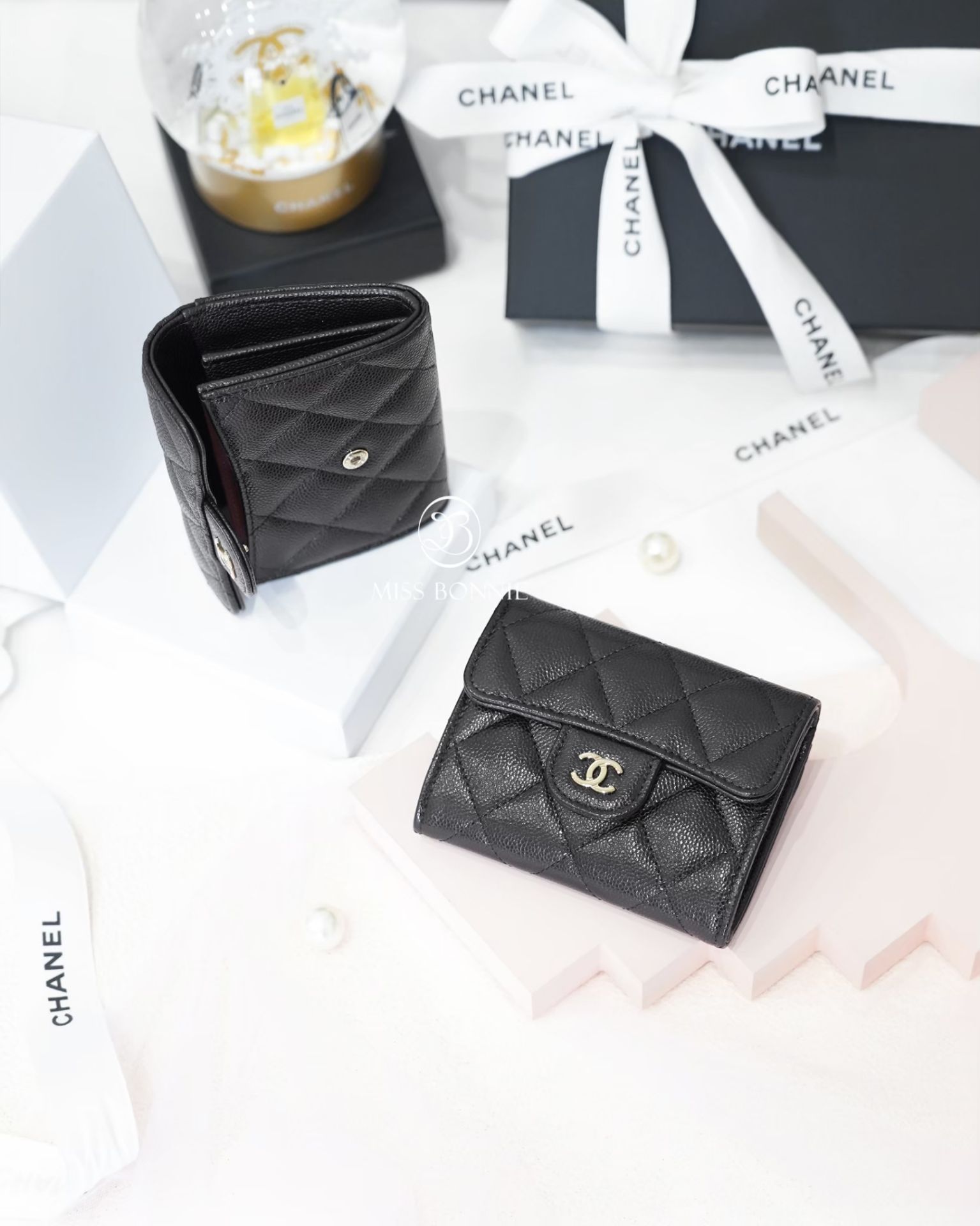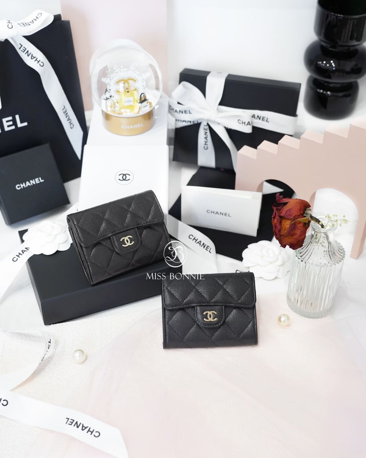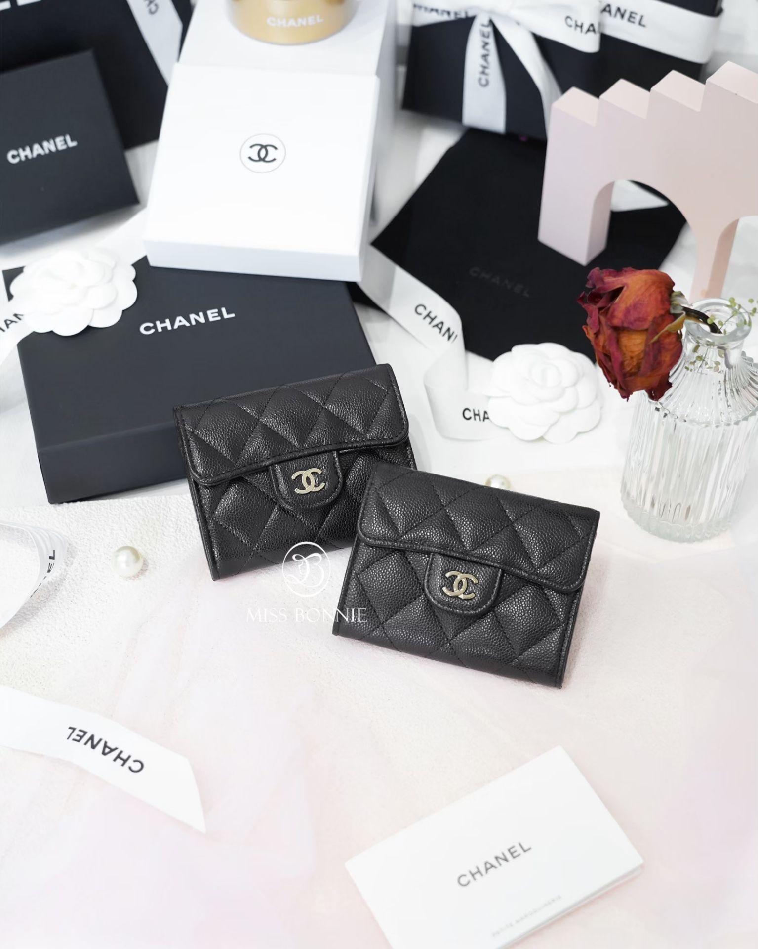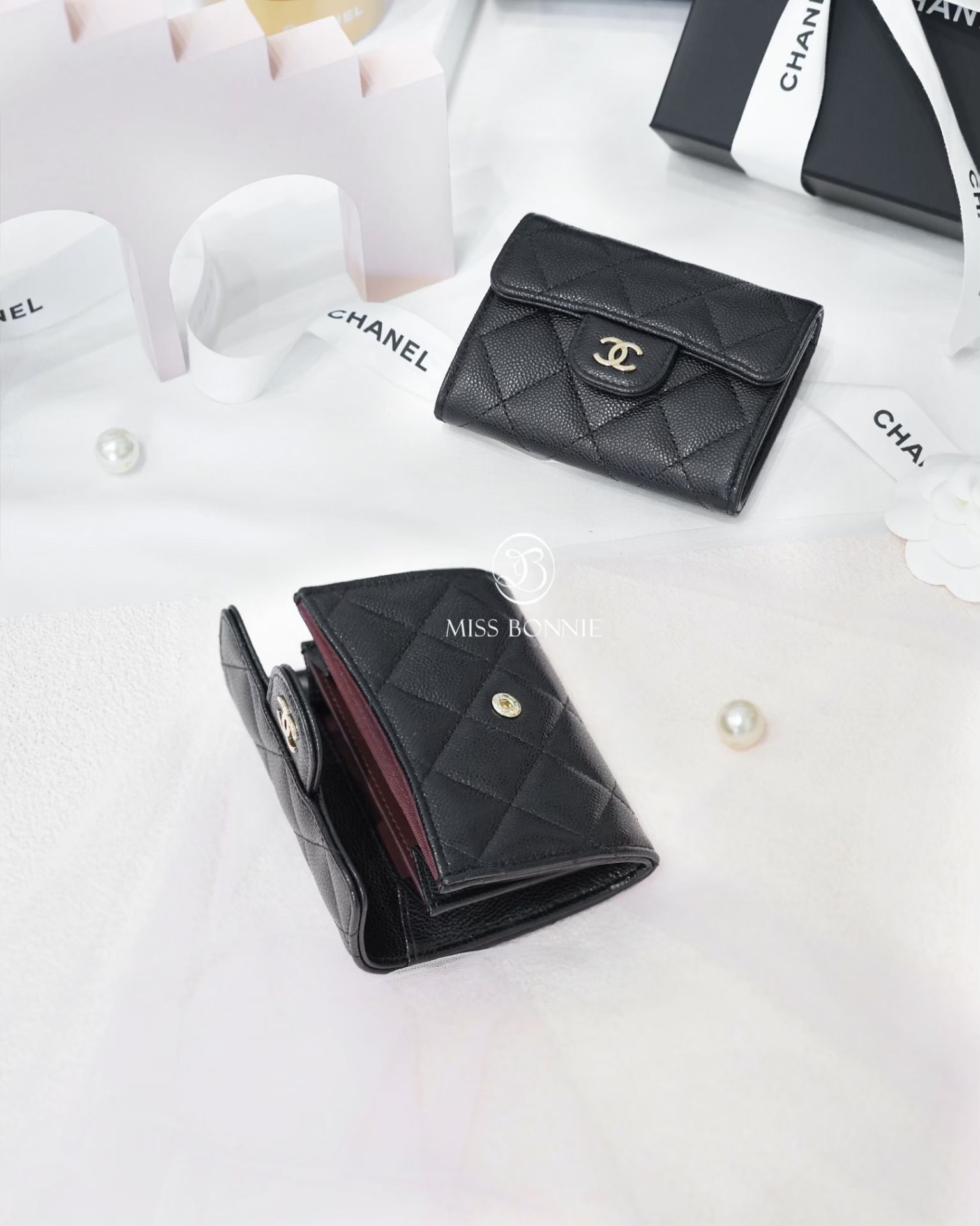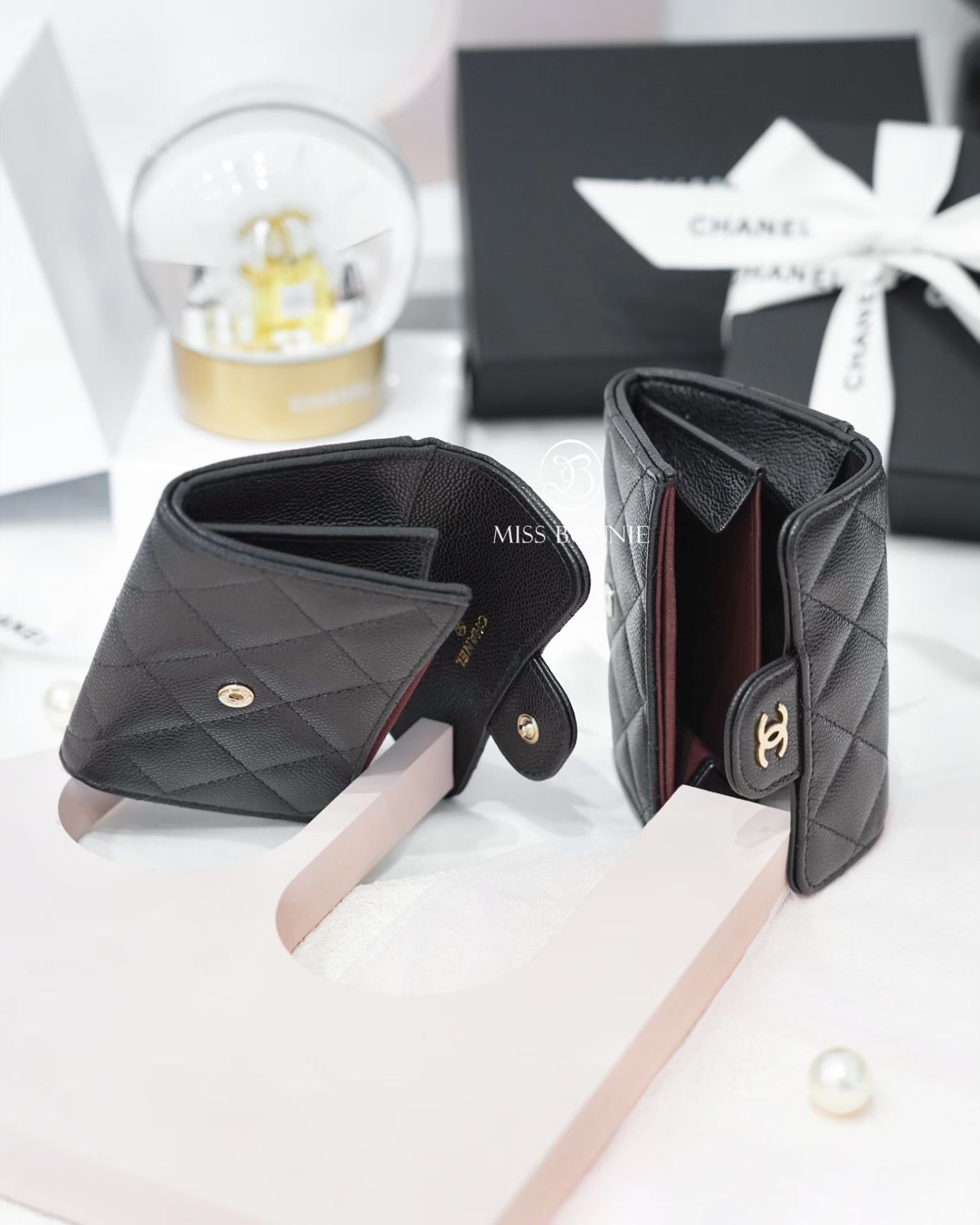 CHANEL Coco荔枝牛皮雙層卡包-黑色/淡金釦-