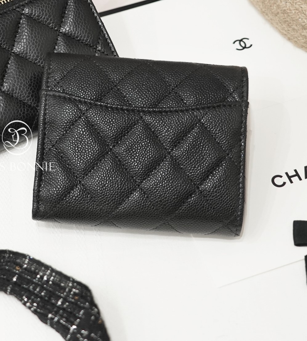 CHANEL Coco菱格紋荔枝牛皮短夾(側拉鍊款)-黑色淡金釦(預購)
