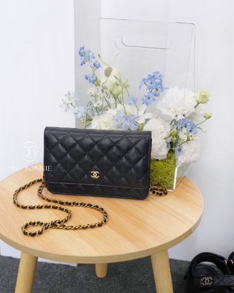 CHANEL Coco菱格紋荔枝牛皮WOC-黑色/金釦