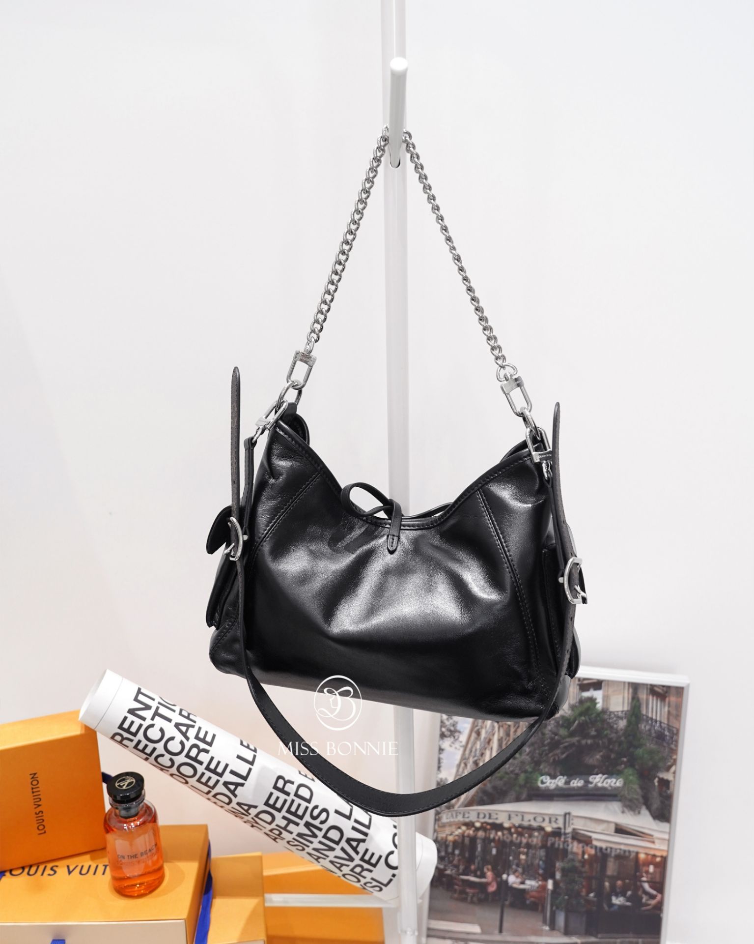 全黑柔軟小羊皮,搭配銀色鍊條點綴