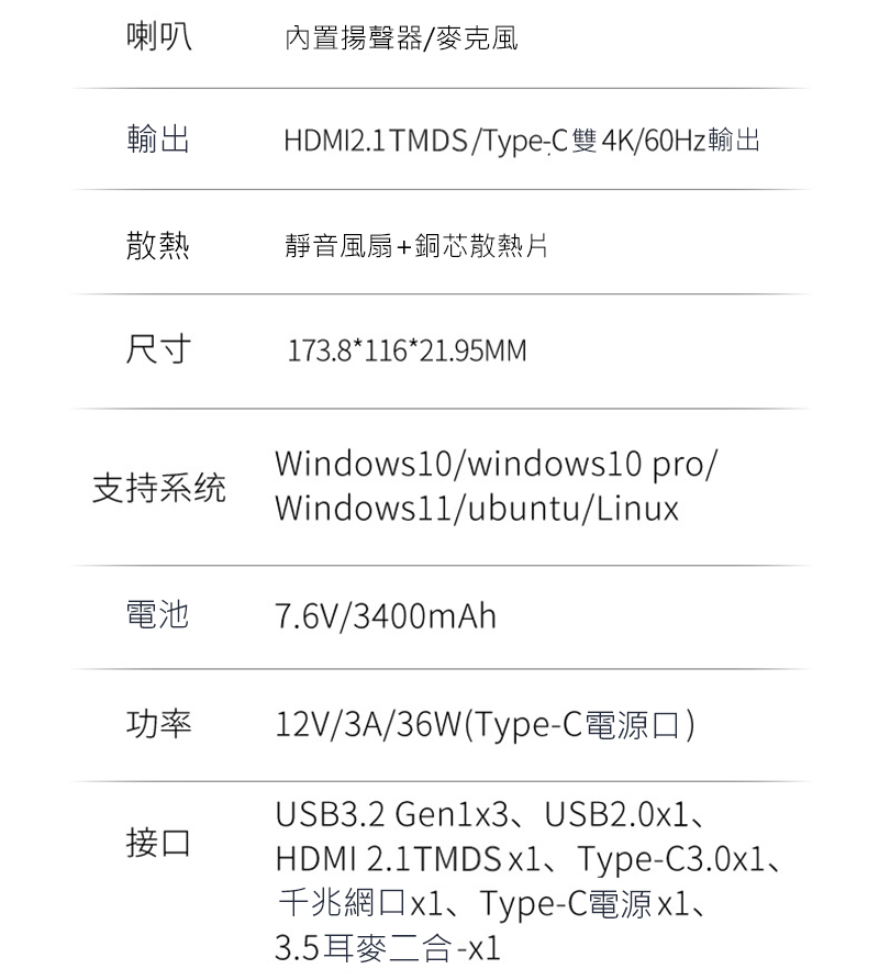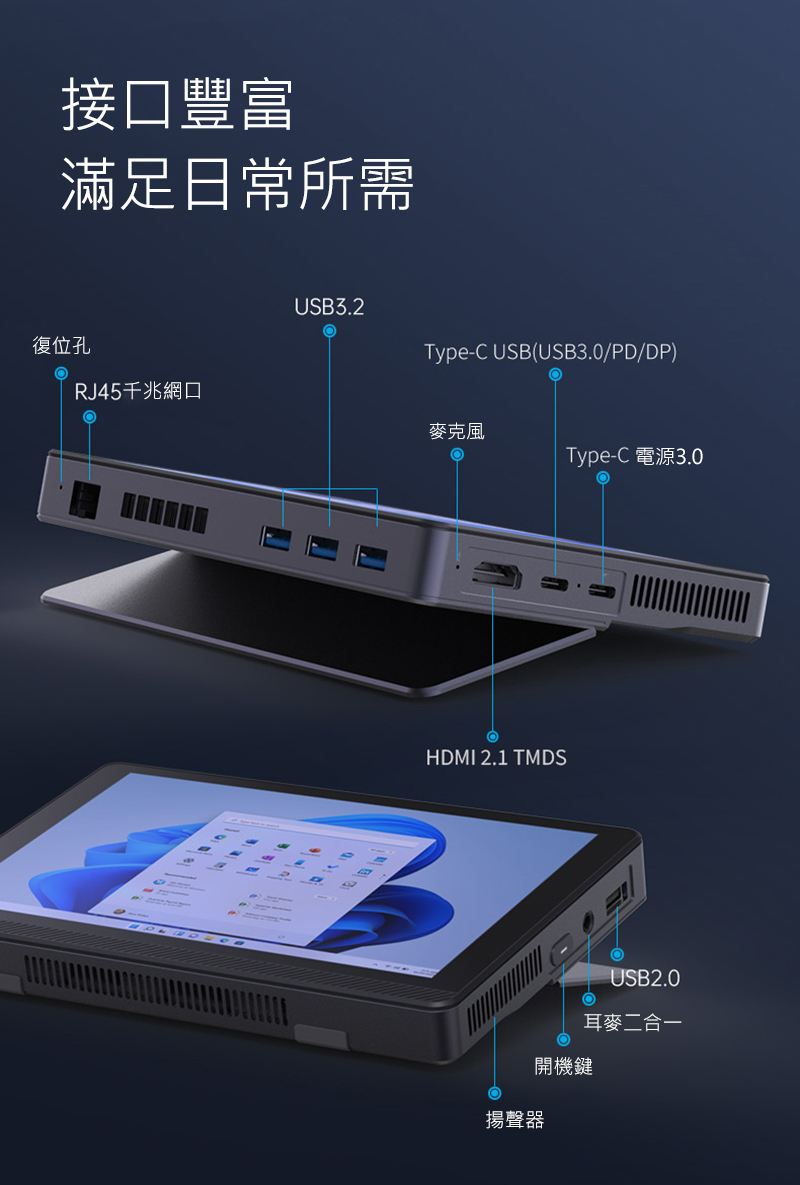 .接口:USB 3.2*3、USB 2.0*1、HDMI 2.1*1、RJ45*1、耳麥二合一*1、Type-C*2(1孔僅供電使用)