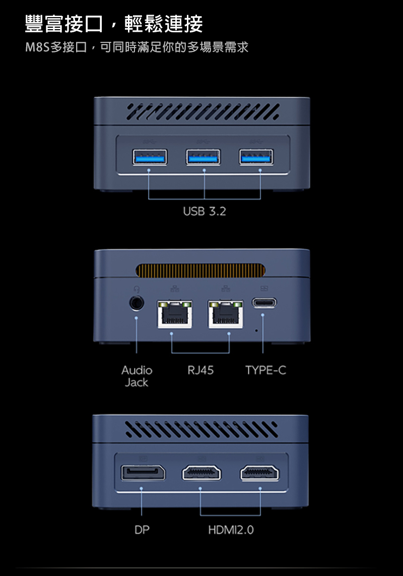 .連接埠:USB 3.2*3、HDMI*2、RJ45(1000M)*2、DisplayPort*1、Audio Jack*1、Type-C(僅充電)*1