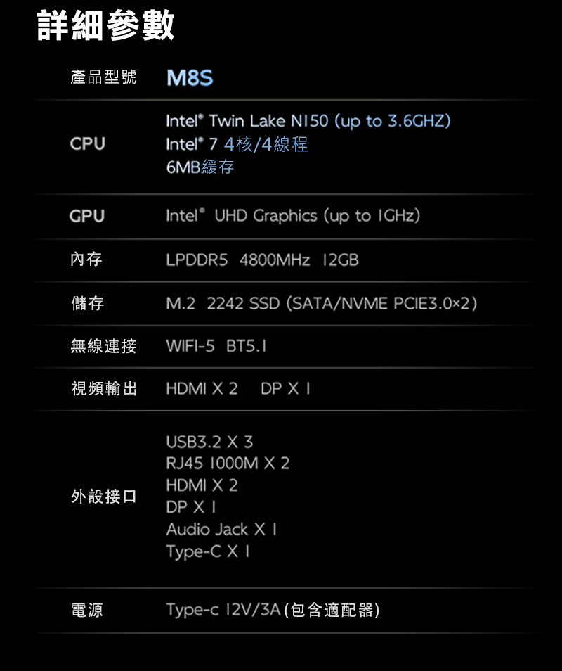 .內容物:M8S (升級版)迷你電腦(Intel N150 3.6GHz)*1、專用電源變壓器(100~240V)*1、HDMI線*1