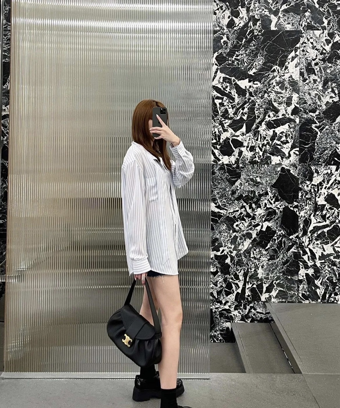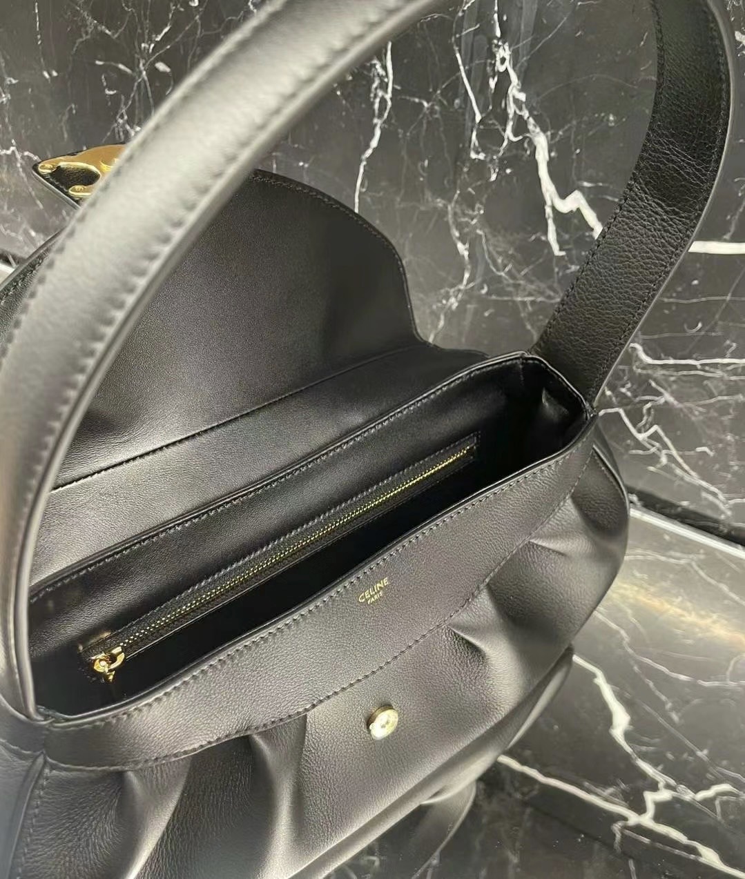 CELINE|黑色牛皮POLLY皺摺腋下包