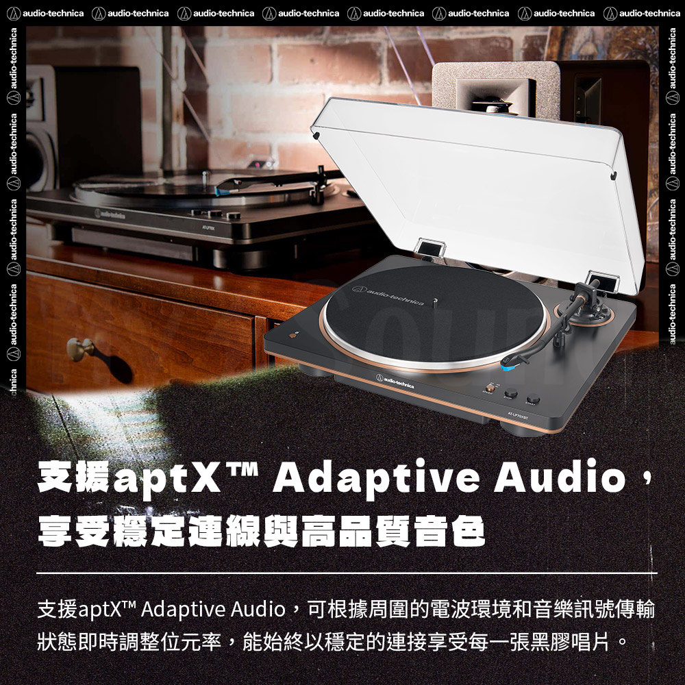 ▶能使用自身持有的無線喇叭或耳機聆聽黑膠唱片 ▶支援aptX™ Adaptive Audio,享受穩定連線與高品質音色 ▶只需按下開始鍵,從播放到暫停皆為全自動 ▶採皮帶驅動方式,提供33-1/3轉、45轉之兩種轉速切換 ▶搭載高精密DC直流馬達 ▶鋁合金壓鑄唱盤與唱片墊 ▶精密的三件式防共振底盤結構可抑制不必要的共振,改善音質 ▶附屬凝聚多年技術的VM型立體聲唱頭 ▶採用鐵三角傳統的J字形唱臂 ▶可降低移動時損壞唱針風險的唱臂鎖定夾 ▶內建唱頭等化器及PHONO/LINE輸出 ▶低噪訊電路設計,採用 AC 變壓器的外部電源系統 ▶黑+銅、白+銀的雙色搭配選擇