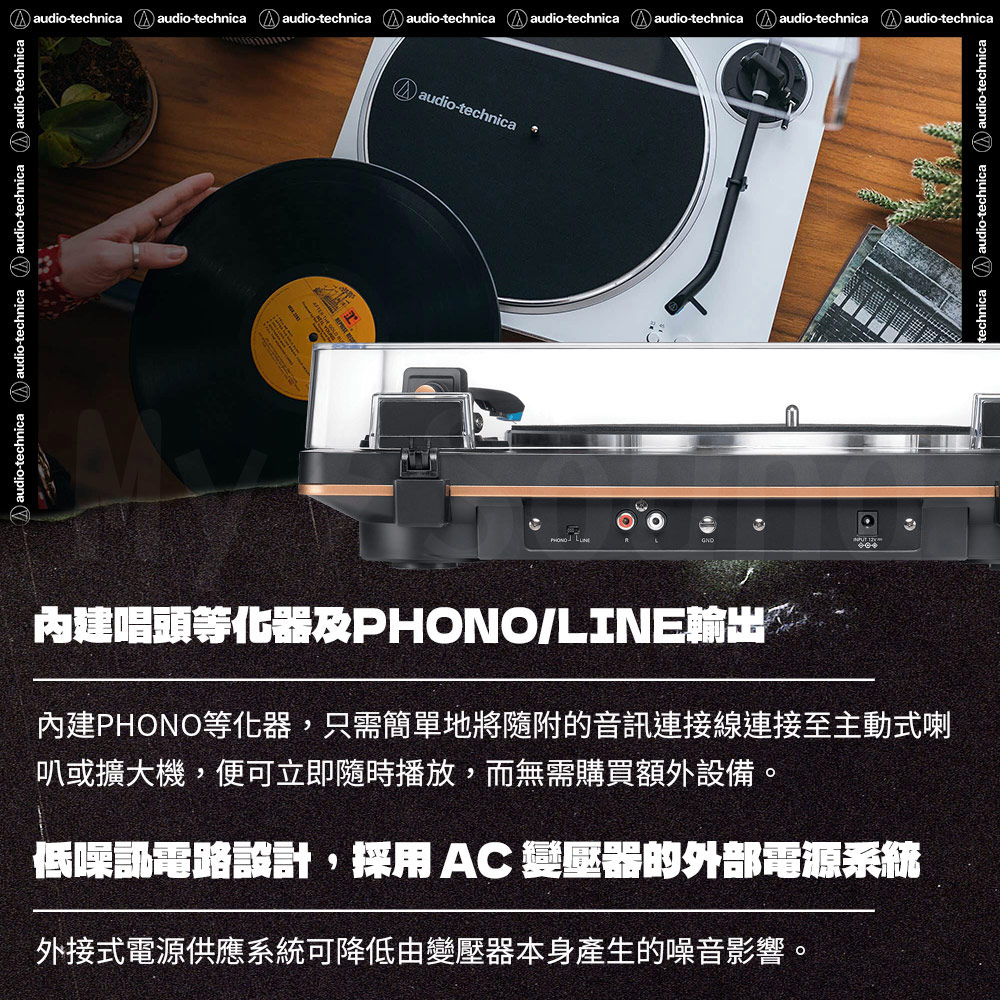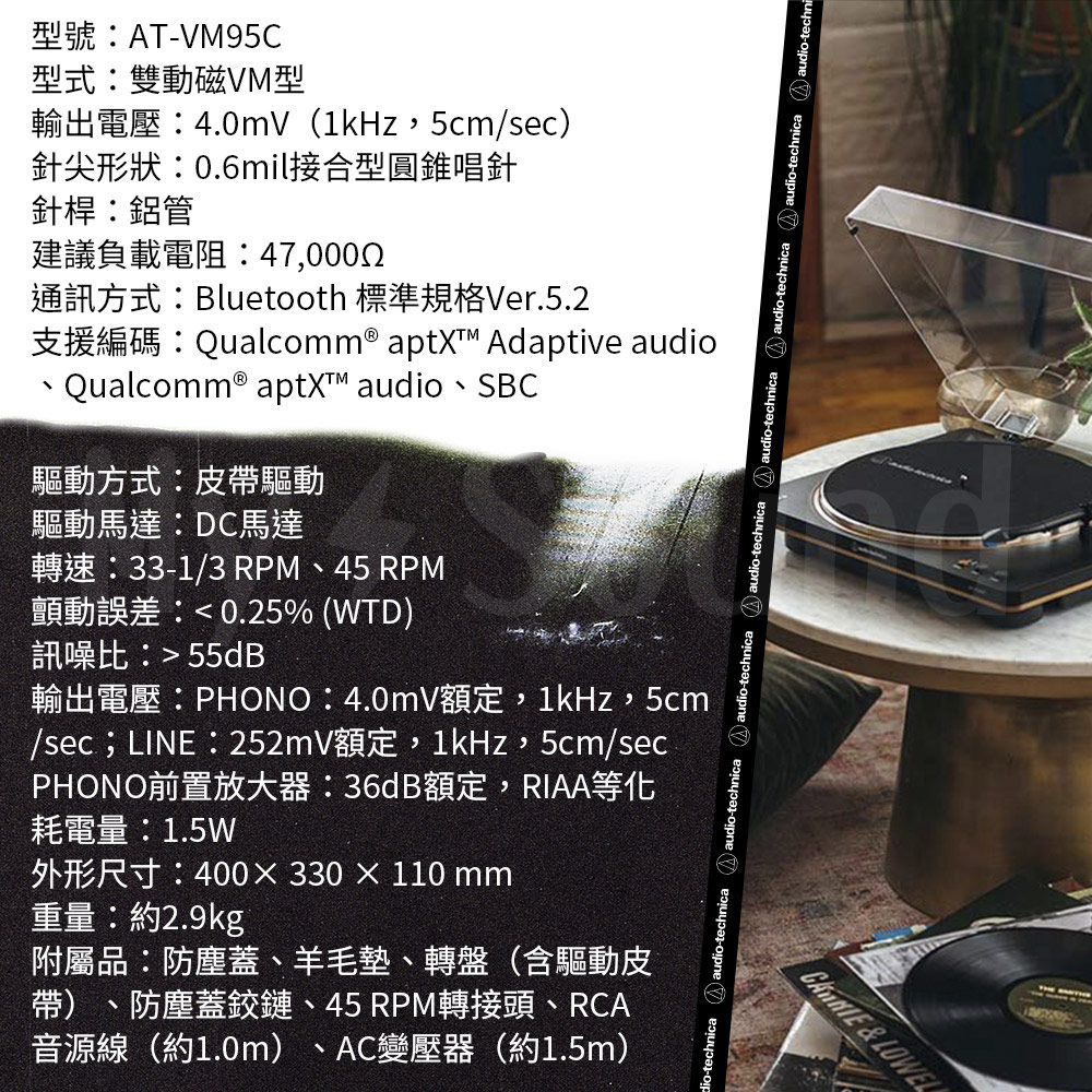 ‧附屬品:防塵蓋、羊毛墊、轉盤(含驅動皮帶)、防塵蓋鉸鏈、45 RPM轉接頭、RCA音源線(約1.0m)、AC變壓器(約1.5m)