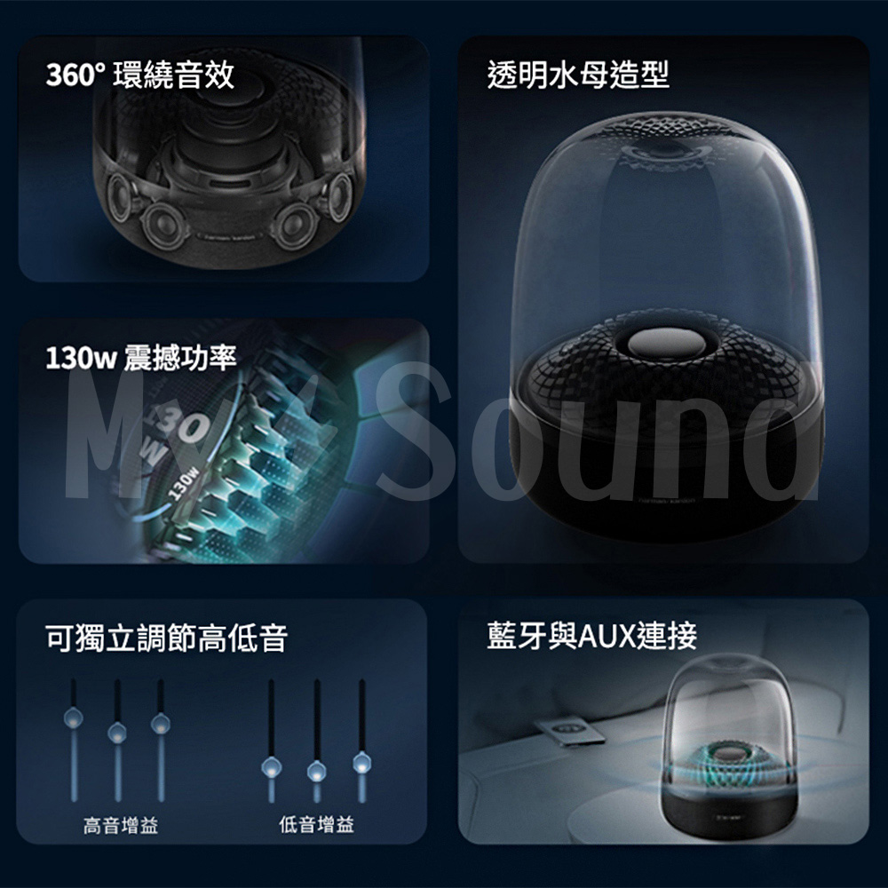 ▶經典透明水母造型,宛若現代藝術精品 ▶130mm低音單體,低音下潛深且震撼 ▶360° 環繞立體音效,6個40mm中高頻單體 ▶3段高/低音EQ調整 ▶全新5種可調鑽石波紋動態燈光效果,360° LED呼吸燈 ▶藍牙4.2連接、便利音頻AUX輸入接口