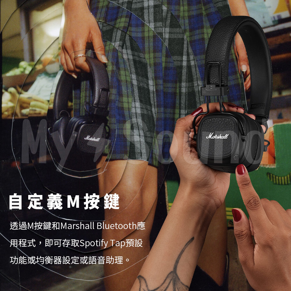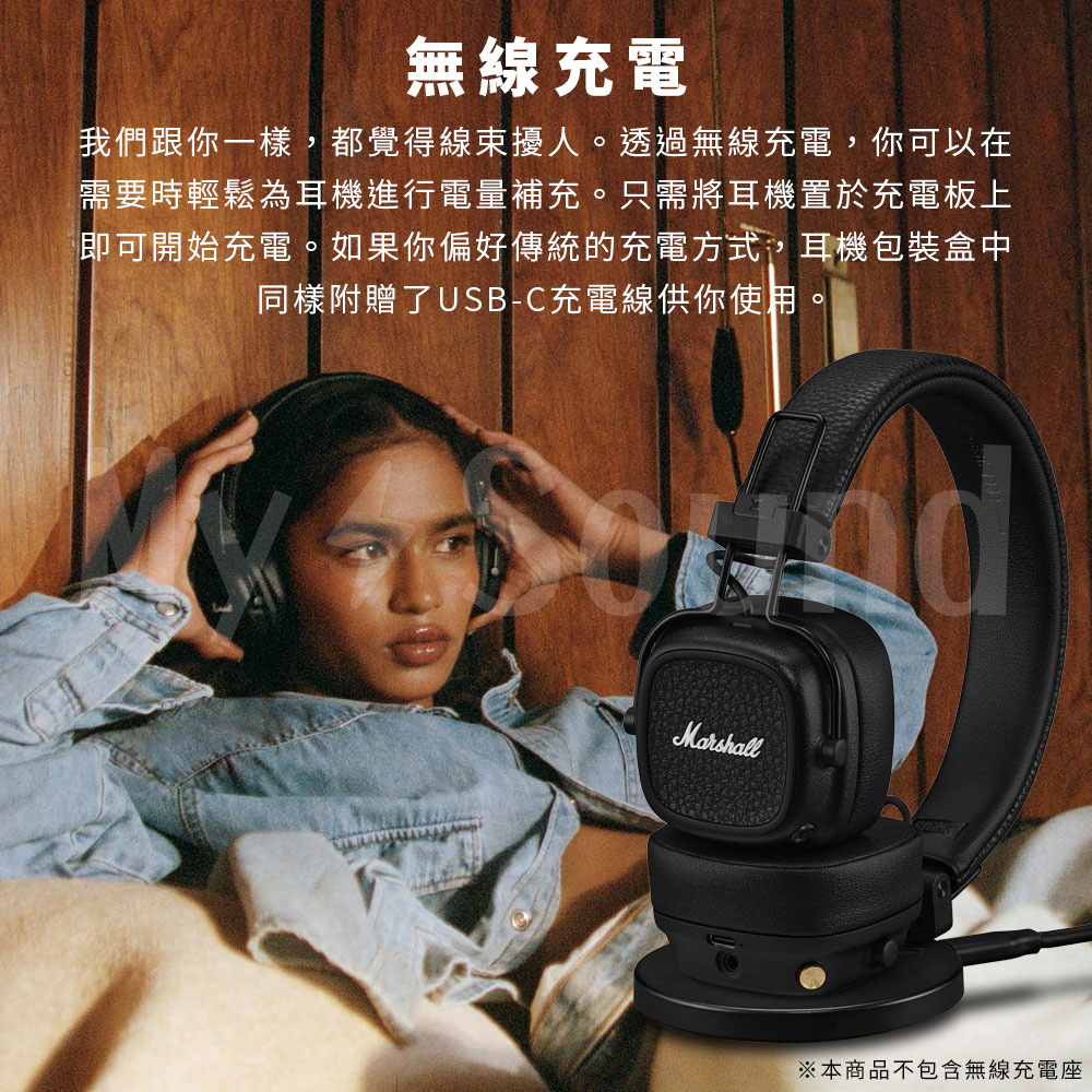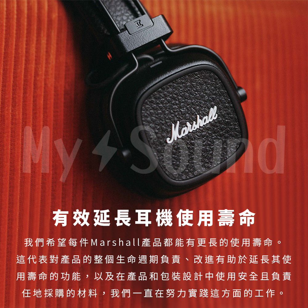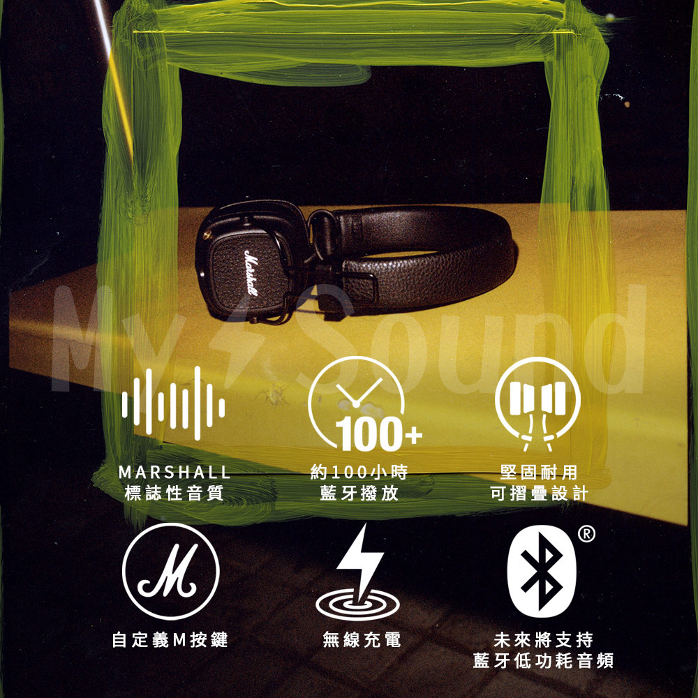 ▶MARSHALL標誌性音質 ▶約100小時藍牙播放 ▶可折疊的堅固設計 ▶自定義M按鍵 ▶無線充電 ▶未來將支持藍牙低功耗音頻 ▶有效延長耳機使用壽命