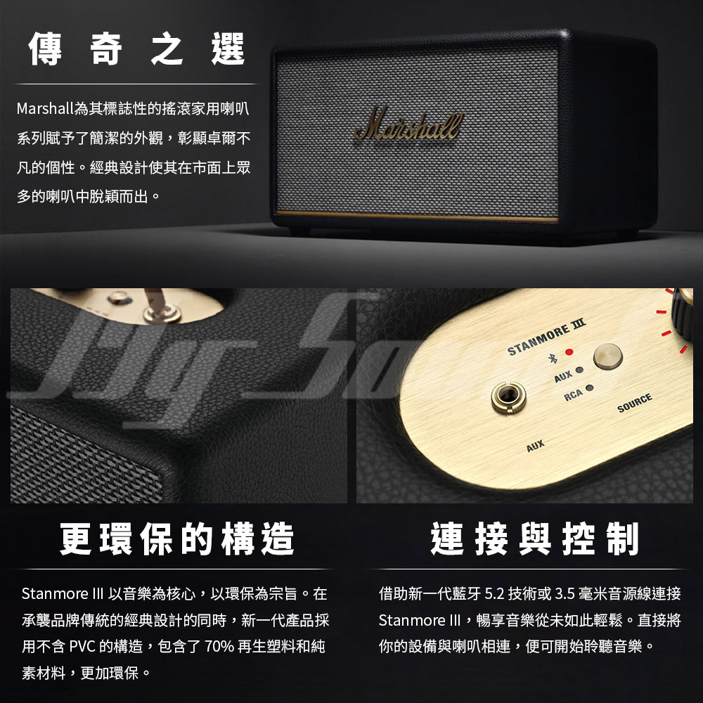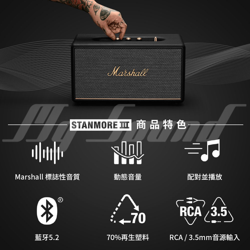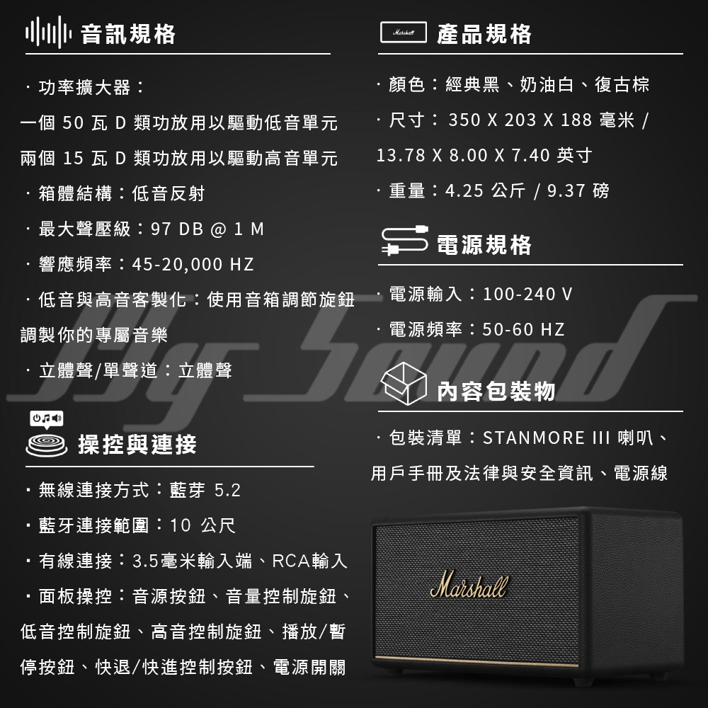 ‧包裝清單:Stanmore III 喇叭、用戶手冊及法律與安全資訊、電源線