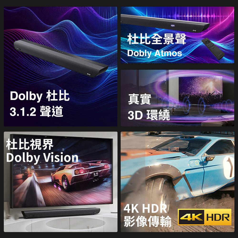 ▶杜比全景|3.1.2 Dolby Atmos杜比全景聲環繞音效 ▶一體聲霸|內建低音聲道及天空聲道 ▶家庭劇院|內建6個喇叭真實3D環繞 ▶低音調節|BASS±6範圍內任意調整 ▶杜比視界|HDMI傳輸杜比視界及4K HDR影像傳輸 ▶對話增強|對話增強技術人聲更為清晰 ▶五種模式|標準、電影、音樂、聲音、夜間模式 ▶多樣連接|多種有線音訊輸入及藍芽5.0 ▶遙控操作|可透過遙控器遠端操作 ▶融入居家|多種擺放方式融入居家設計