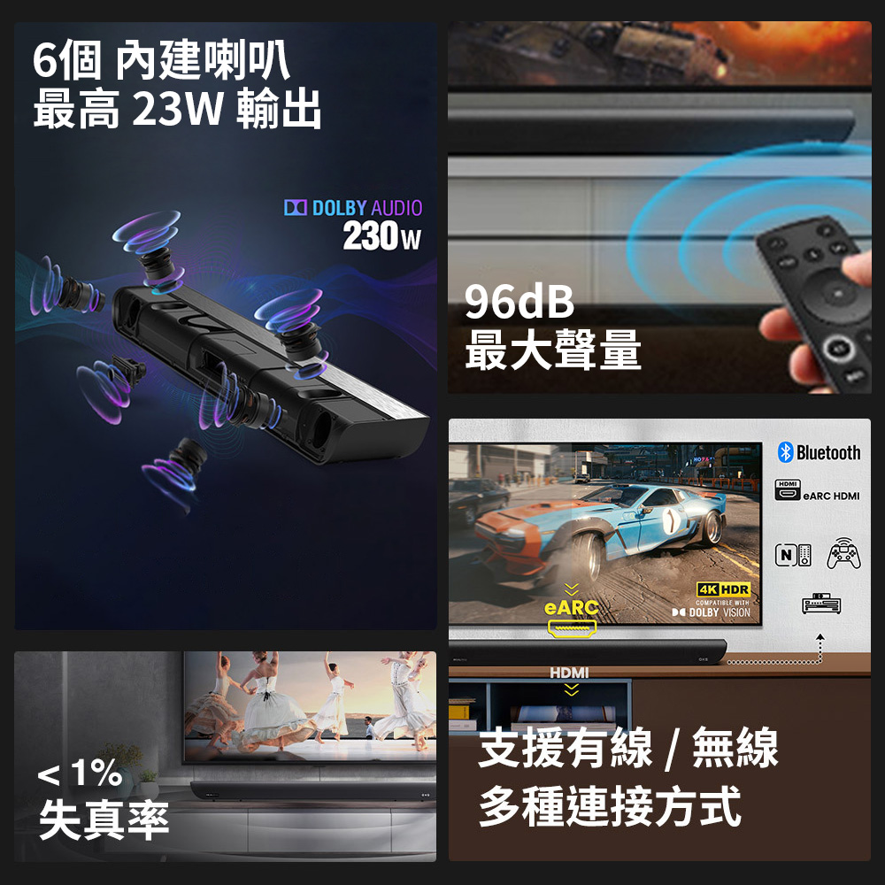 ‧連接方式:藍牙、3.5mm音源線、AUX、Optical 、HDMI (eARC) & HDMI In、USB (支援格式.WAV .MP3)