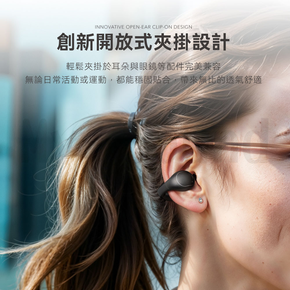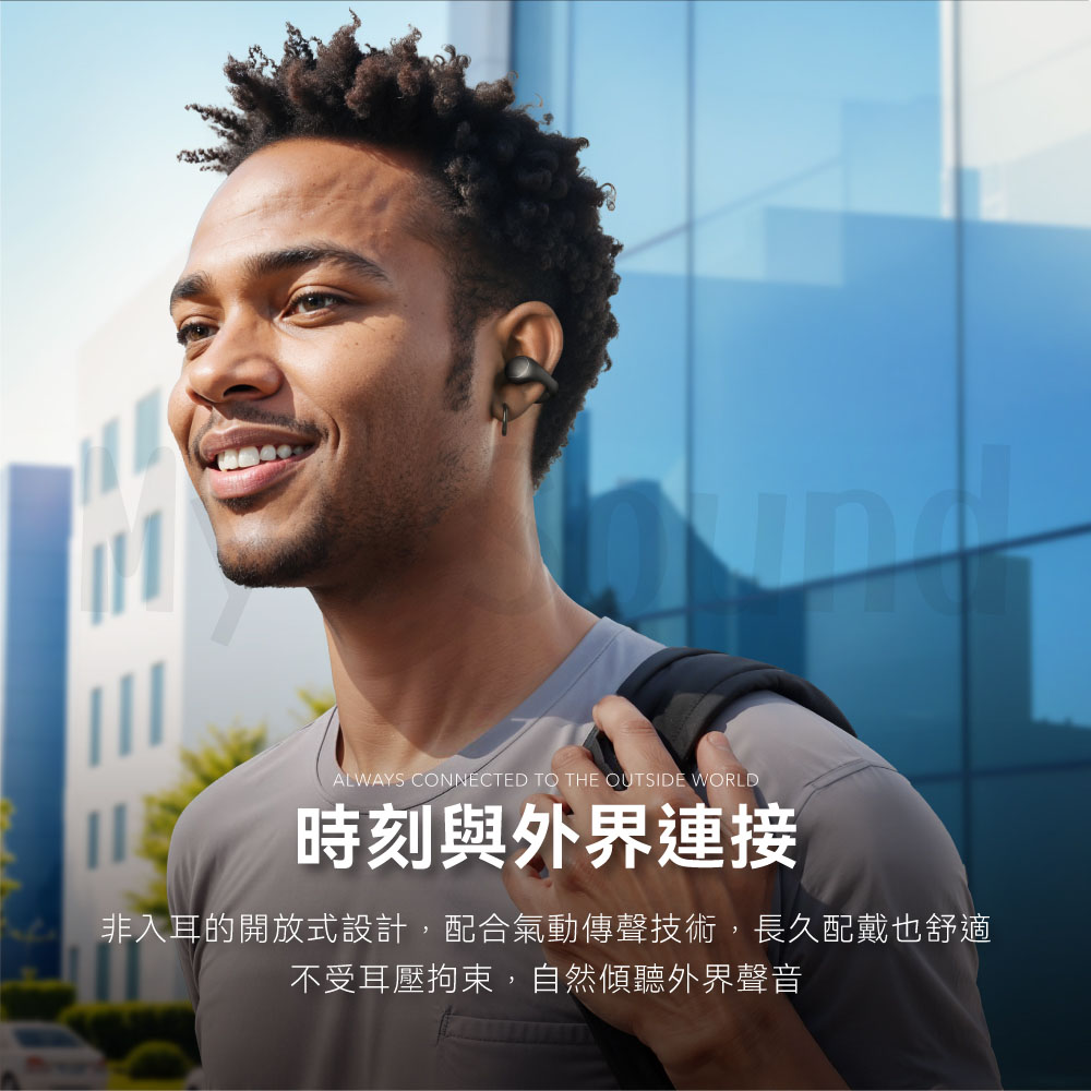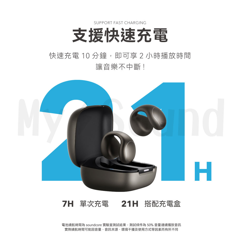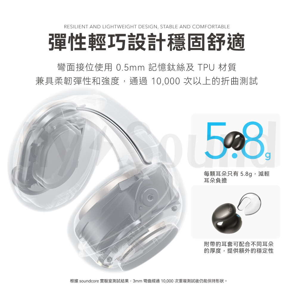 ▶耳夾設計 靈活貼合 C 型耳夾可輕鬆夾掛於耳朵,與眼鏡等配件完美兼容。 ▶久戴舒適 傾聽自然 非入耳的配戴方式,減輕耳壓感,輕鬆聆聽外界聲音。 ▶輕巧配戴 柔軟耐用 採用 0.5mm 記憶鈦金屬與柔軟 TPU 材質,重新定義舒適與耐用度。 ▶清晰音質 純淨音效 12mm x 17mm 橢圓驅動單元,低音有力、高音清晰。 ▶定向聲學 音樂獨享 20 度角喇叭設計,讓聲音精準傳遞至耳內,防止漏音。 ▶快速充電 持久續航 快速充電 10 分鐘,享受 2 小時續航;最高總續航達 21 小時。 ▶自在通話 清晰暢談 CAI 通話降噪演算法,搭配雙降噪麥克風,確保聲音清晰響亮。 ▶最新藍牙 多點連線 搭載最新藍牙 5.4 版本,不同裝置間無縫切換,穩定不斷線。 ▶生活防水 無懼潑濺 IPX4 防水認證,有效防範水花噴濺、汗水、小雨,戶外活動隨時享有穩定音質。 ▶直覺操作 輕鬆控制 實體按鍵控制,亦支援 soundcore APP,豐富功能一指掌握。