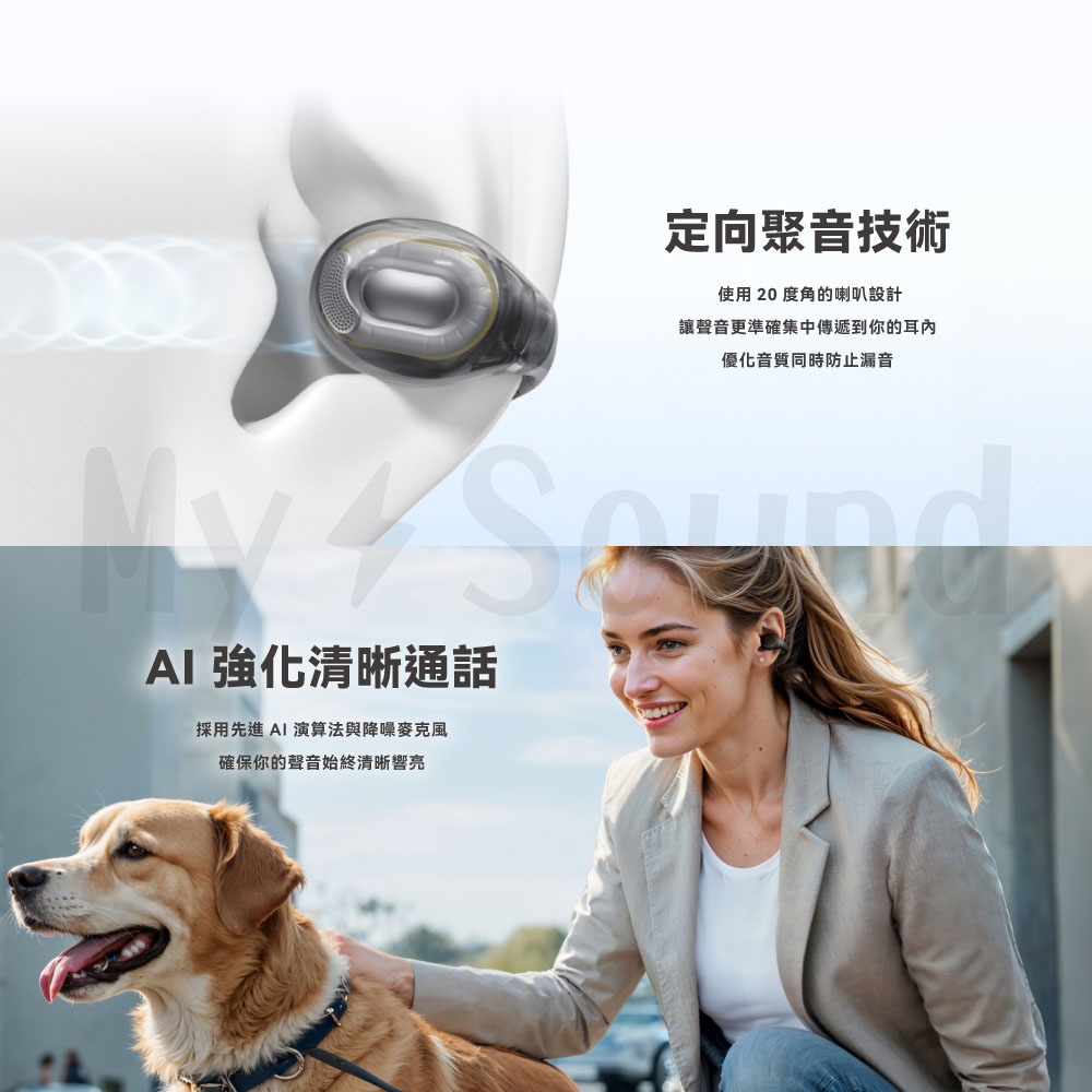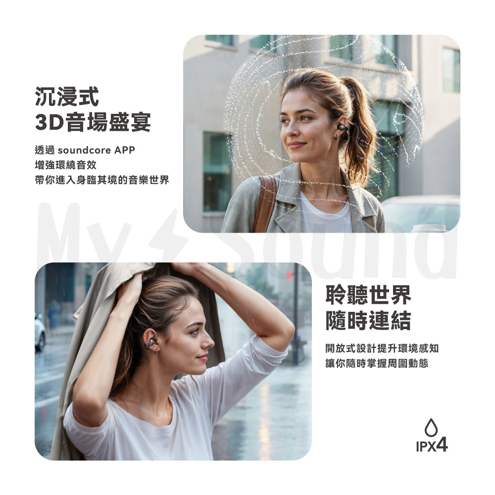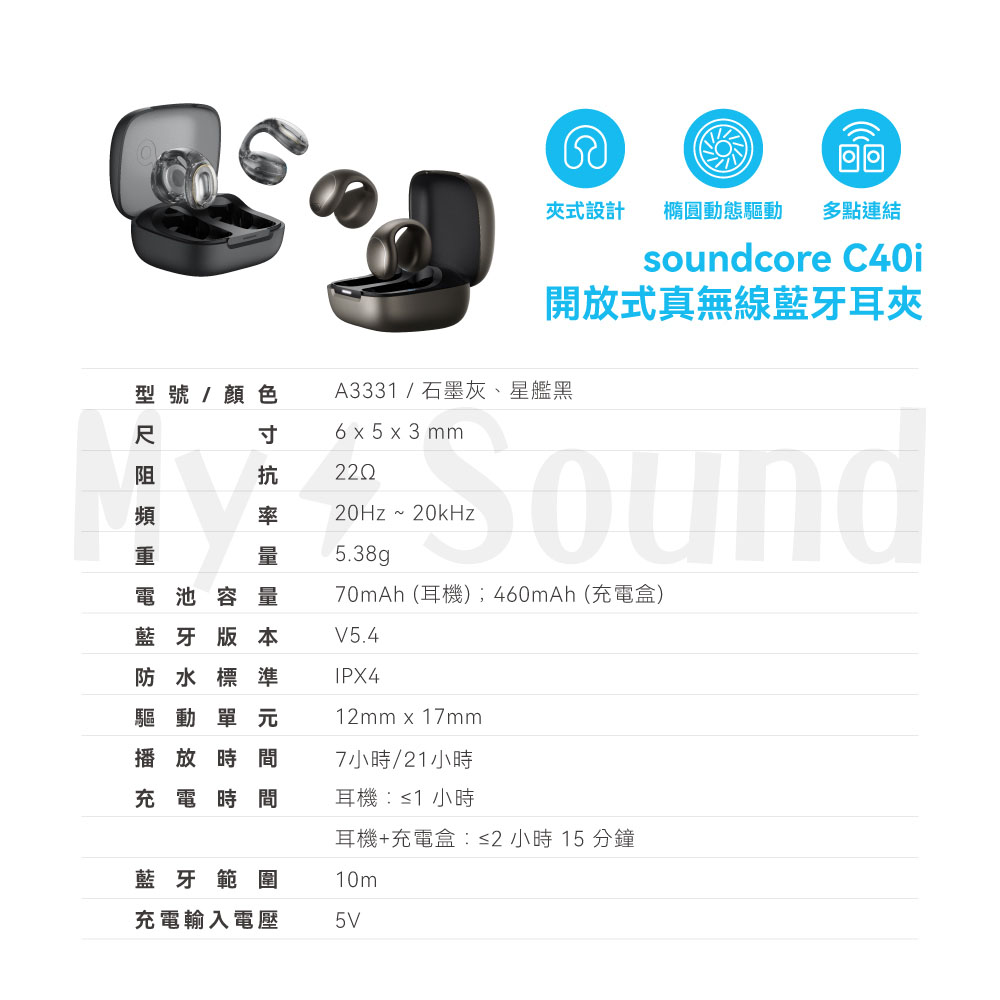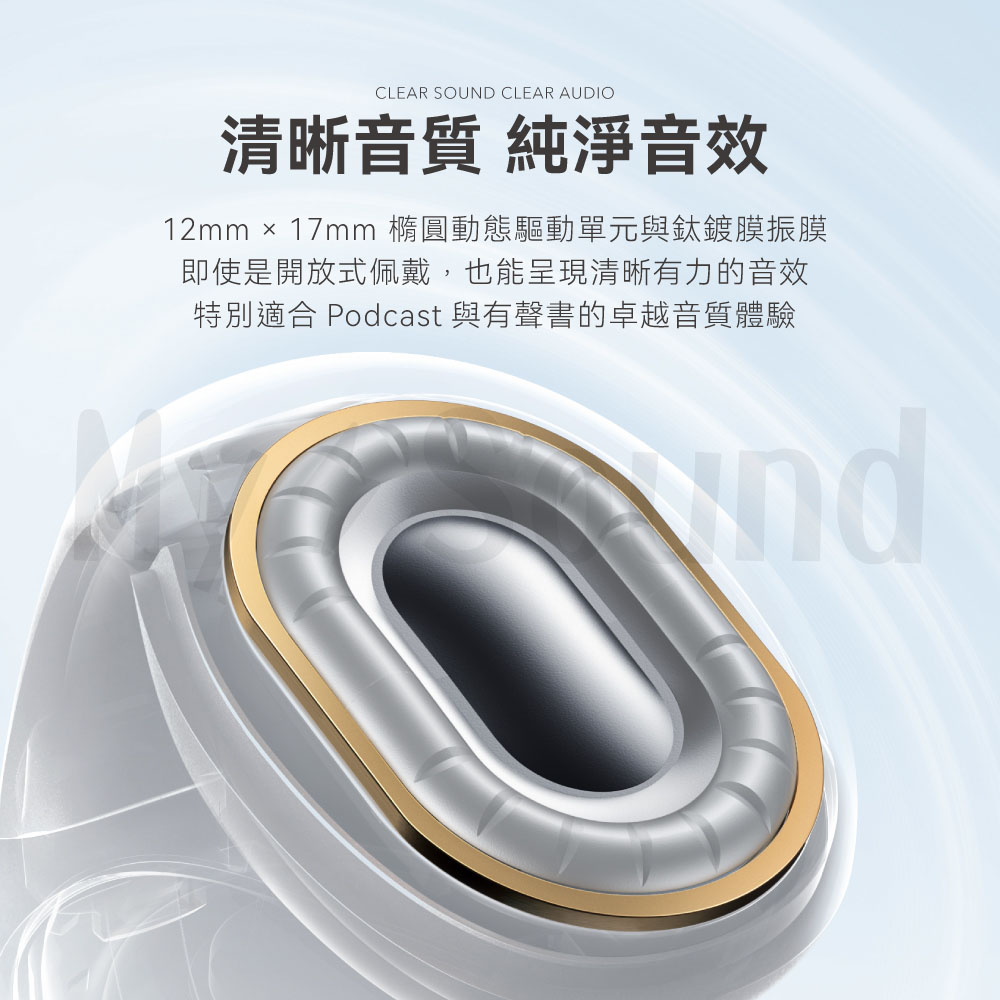 ▶耳夾設計 靈活貼合 C 型耳夾可輕鬆夾掛於耳朵,與眼鏡等配件完美兼容。 ▶久戴舒適 傾聽自然 非入耳的配戴方式,減輕耳壓感,輕鬆聆聽外界聲音。 ▶輕巧配戴 柔軟耐用 採用 0.5mm 記憶鈦金屬與柔軟 TPU 材質,重新定義舒適與耐用度。 ▶清晰音質 純淨音效 12mm x 17mm 橢圓驅動單元,低音有力、高音清晰。 ▶定向聲學 音樂獨享 20 度角喇叭設計,讓聲音精準傳遞至耳內,防止漏音。 ▶快速充電 持久續航 快速充電 10 分鐘,享受 2 小時續航;最高總續航達 21 小時。 ▶自在通話 清晰暢談 CAI 通話降噪演算法,搭配雙降噪麥克風,確保聲音清晰響亮。 ▶最新藍牙 多點連線 搭載最新藍牙 5.4 版本,不同裝置間無縫切換,穩定不斷線。 ▶生活防水 無懼潑濺 IPX4 防水認證,有效防範水花噴濺、汗水、小雨,戶外活動隨時享有穩定音質。 ▶直覺操作 輕鬆控制 實體按鍵控制,亦支援 soundcore APP,豐富功能一指掌握。