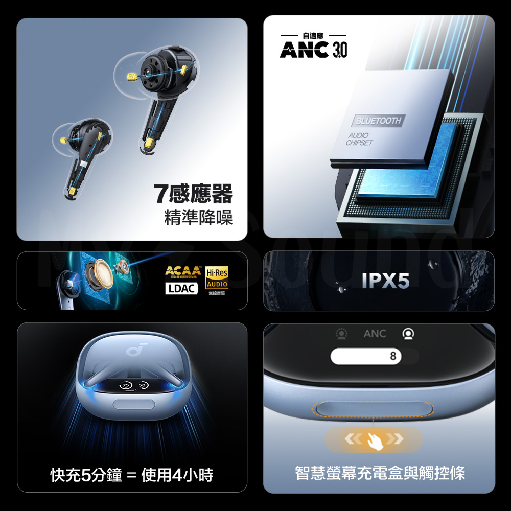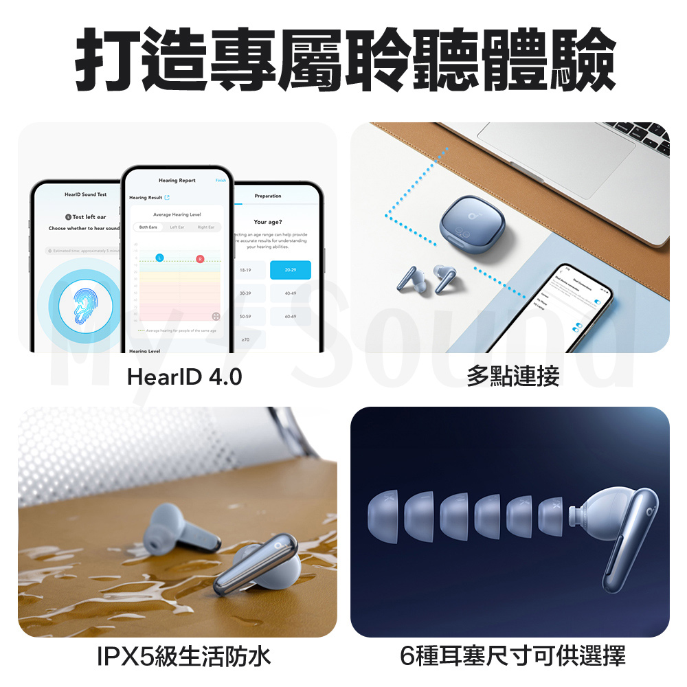 ▶旗艦降噪 聰明體感 雙耳搭載 7 個感應器,精準有效降噪,為 soundcore 歷來最強大的降噪耳機 ▶分秒校正 嶄新靜界 最新 Adaptive ANC 3.0 自適應降噪技術,每0.3秒重新校正降噪曲線,創造完美降噪強度及舒適度 ▶雙重單體 獨家調音 ACAA™4.0 同軸雙動圈+數位分頻技術+響應頻率 14Hz~40kHz,精彩還原細膩聲響 ▶金標認證 聽見細節 通過 Hi-Res Wireless 小金標認證,搭載 LDAC™高音質編碼,近乎無損的發燒音質 ▶空間音訊 環繞體感 依據頭部擺動即時追蹤演算,加倍聲音臨場感,營造3D空間聆聽體驗 ▶多種功能 量身訂做 支援 HearID 調音、多段通透模式,根據個人需求隨時改變,待你輕鬆自訂 ▶智慧觸控 可見螢幕 創新觸控條與智慧充電盒內顯示螢幕,輕鬆掌握電量、降噪/通透模式 ▶極速快充 隨充隨用 快充 5 分鐘可用 4小時/支援 Qi 無線充電,單次 10 小時/最長 40 小時續航力 ▶自在通話 不受限制 6 波束成形麥克風搭配 AI 降噪演算法,飛機、捷運、公車上聲音都可清晰傳達 ▶多點連線 快速穩定 藍牙 5.3 支援多點連線、Google Fast Pair,無縫於多種裝置中快速切換音源 ▶完整App 操控自如