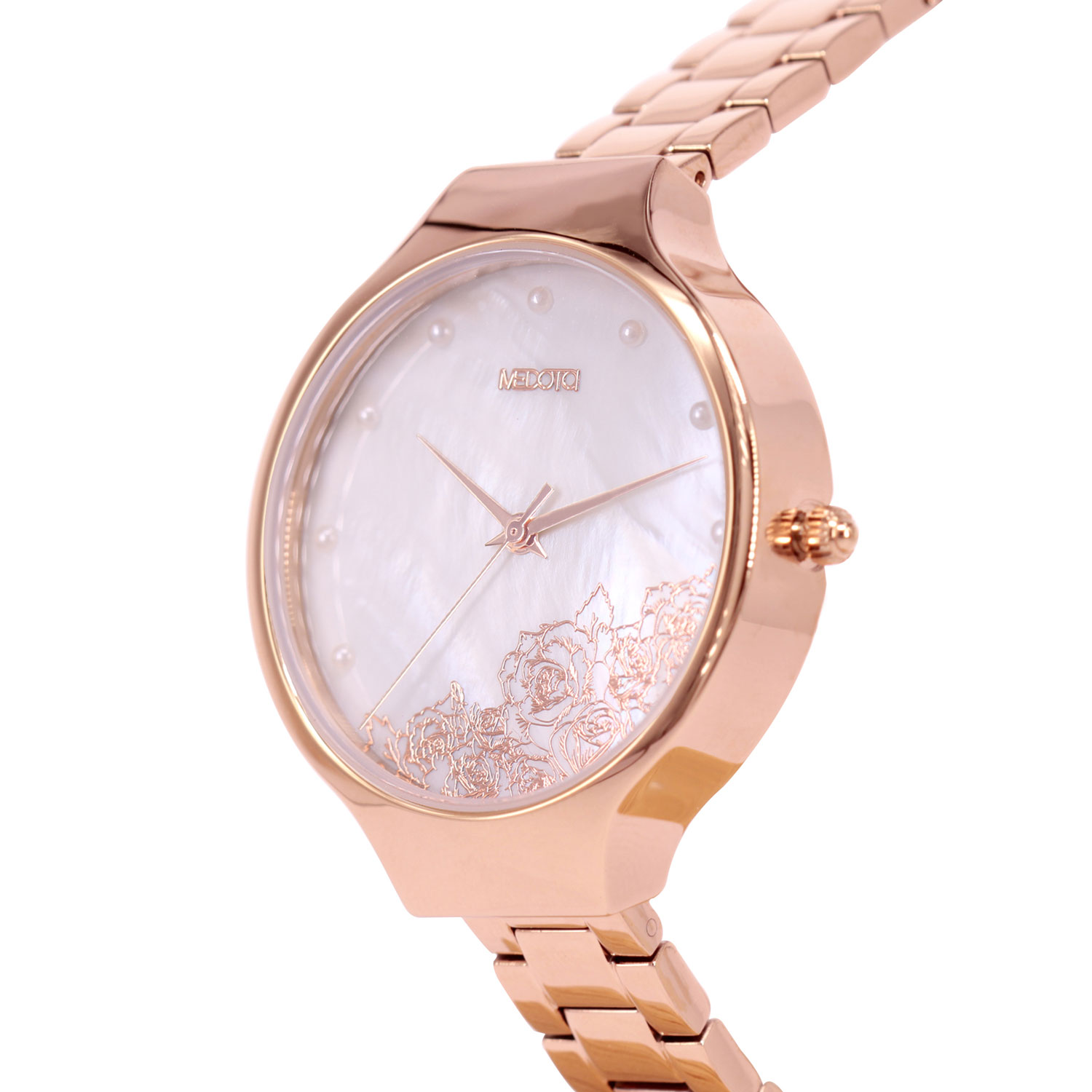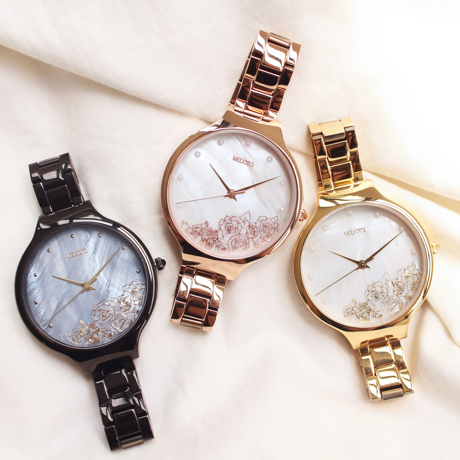 精緻的玫瑰雕花、純白的珍珠時位、浪漫的貝殼錶面