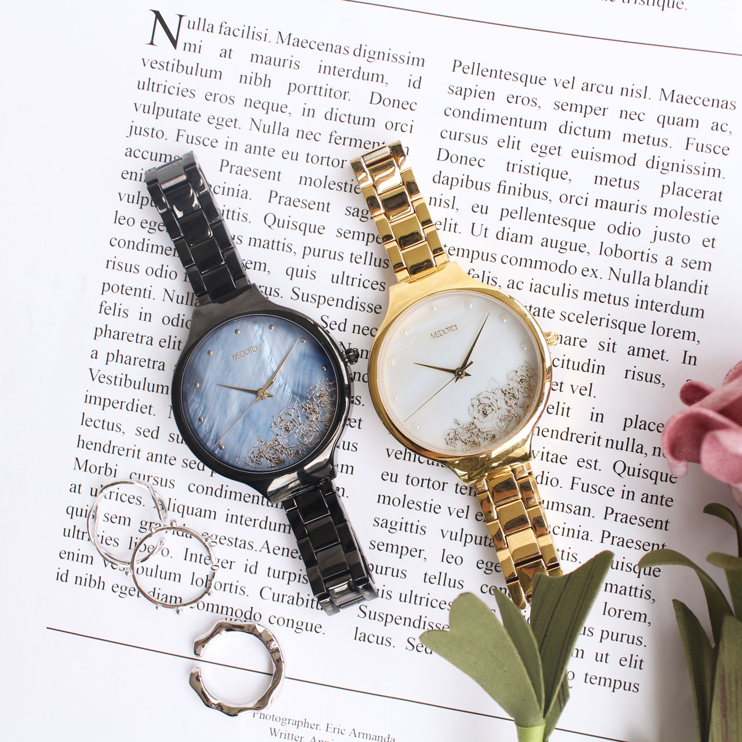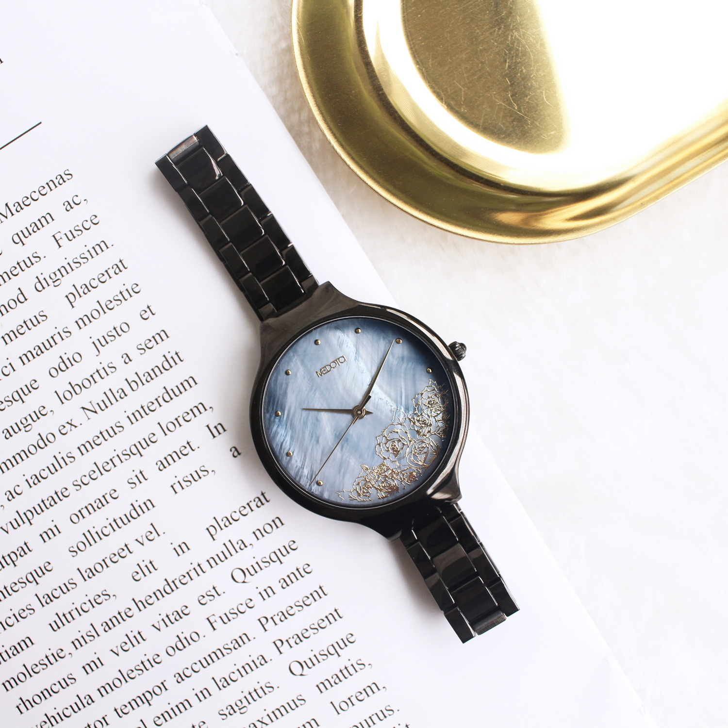 精緻的玫瑰雕花、純白的珍珠時位、浪漫的貝殼錶面