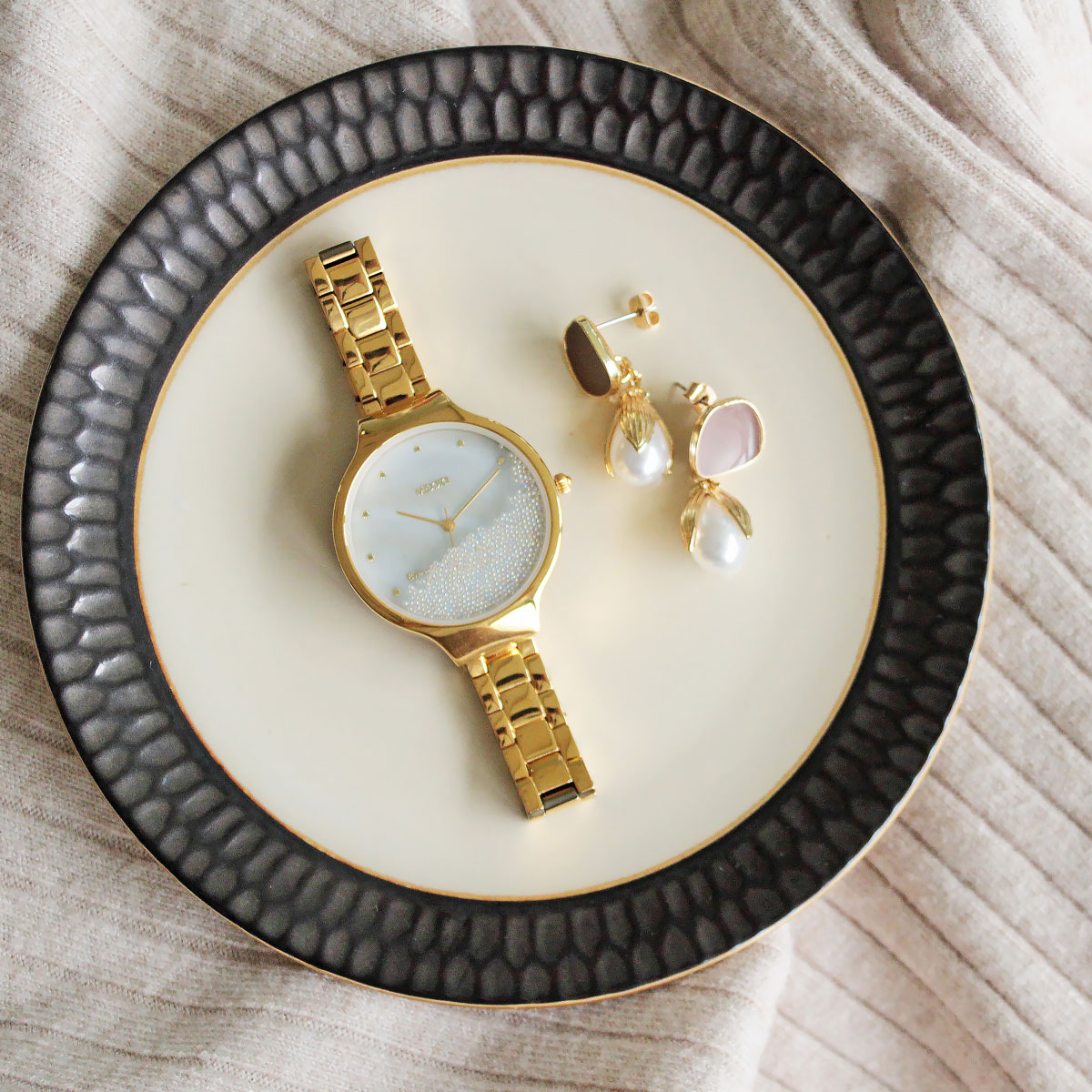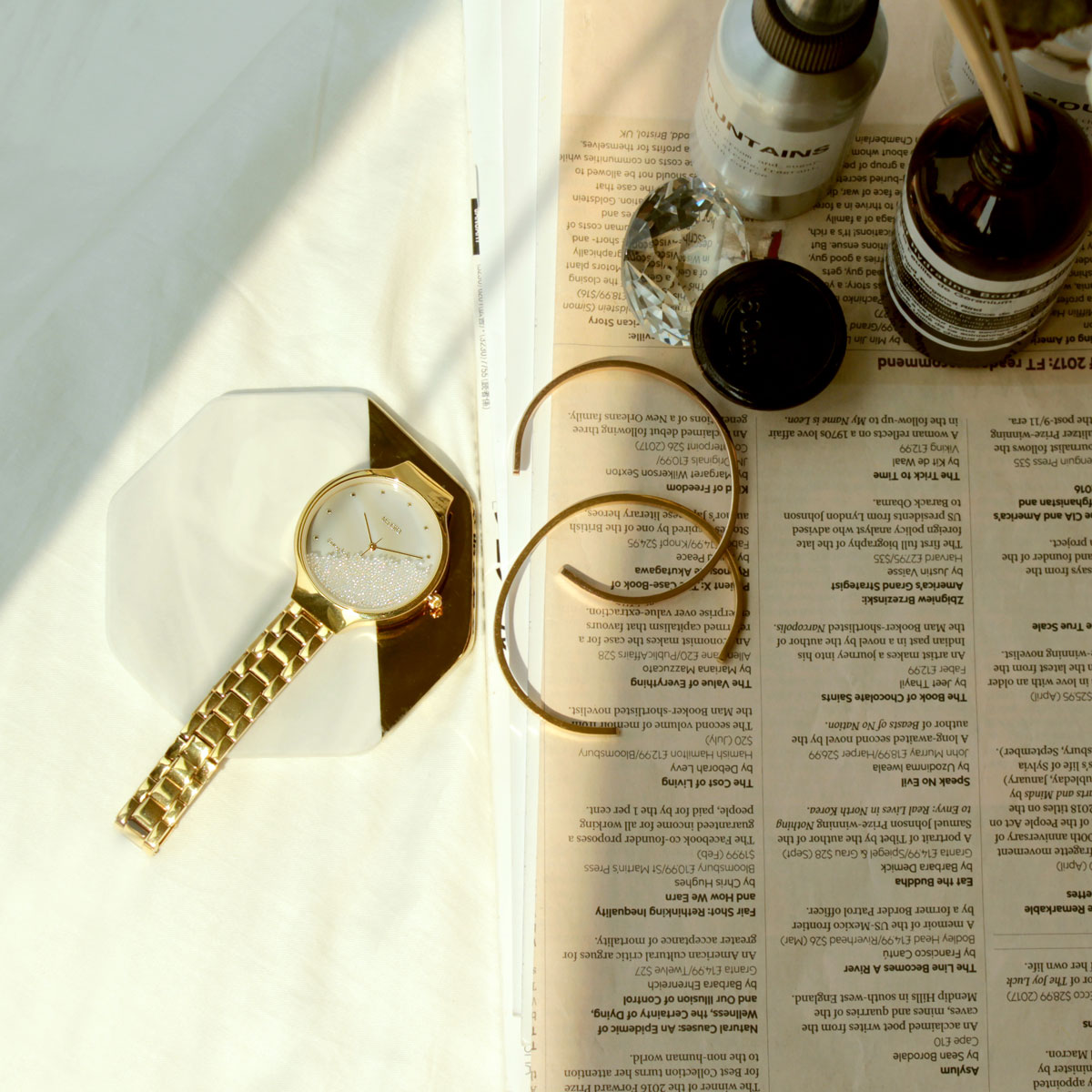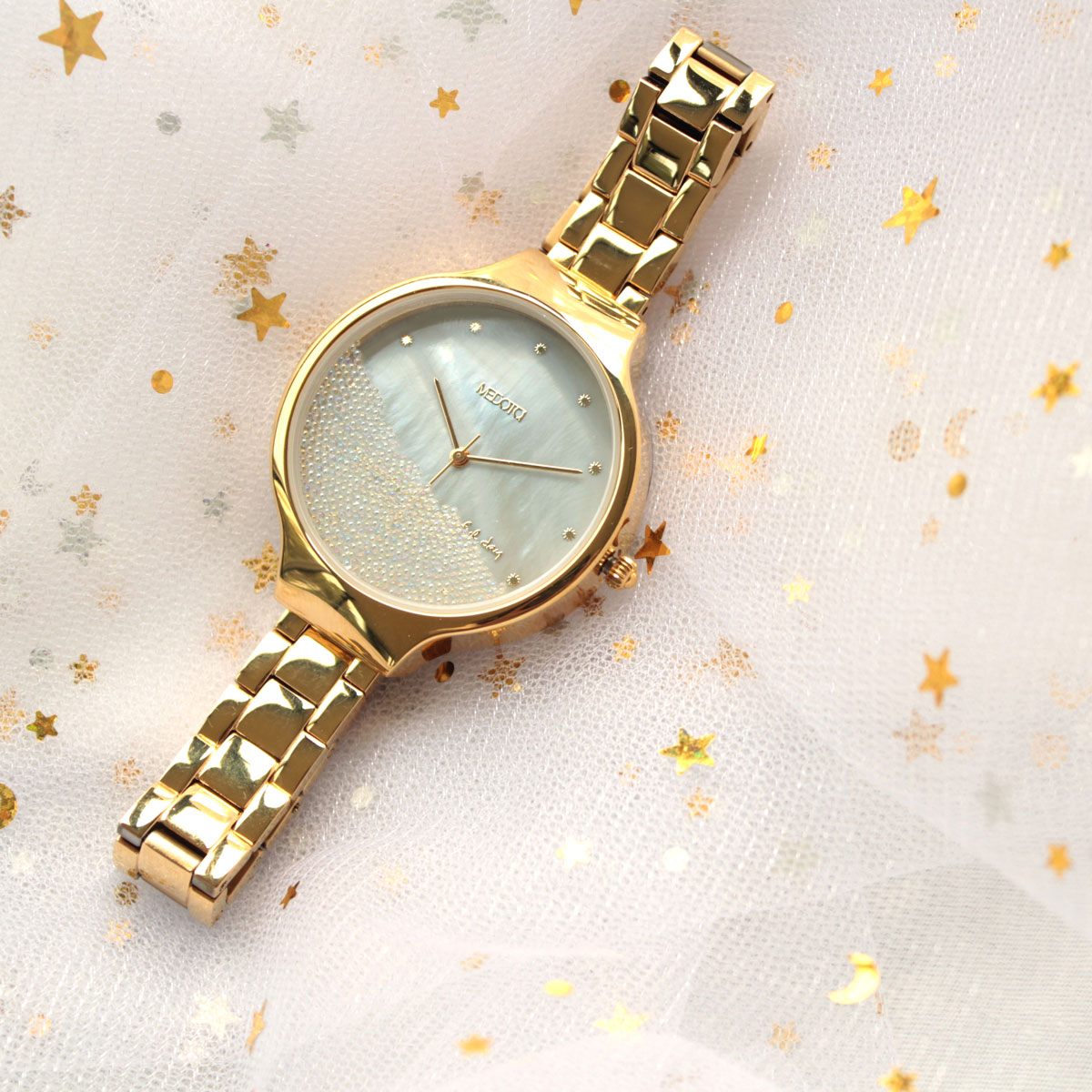 整體錶身以精緻的玫瑰金色(金色/黑色)為主搭配上特殊的雙層錶殼設計,使夢幻的透明珠子能流動於典雅的天然貝殼錶面中,就如同女孩們浪漫的夢想隨著時間一點一滴成真。而於天然貝殼錶面上,我們也送給妳特殊的驚喜,希望當妳遇到挫折能時時刻刻告訴自己