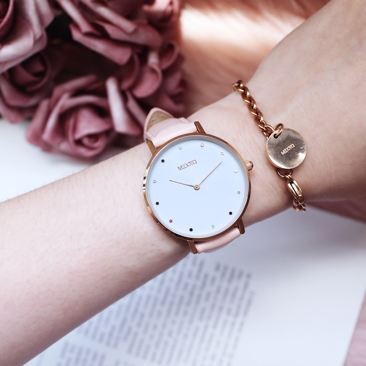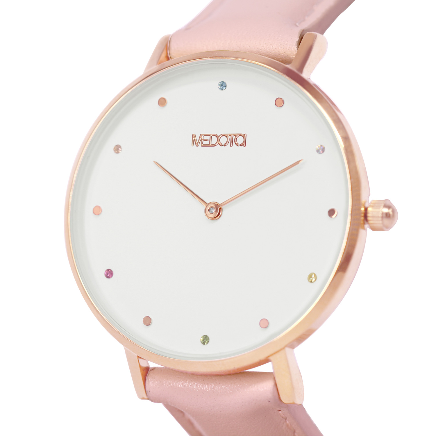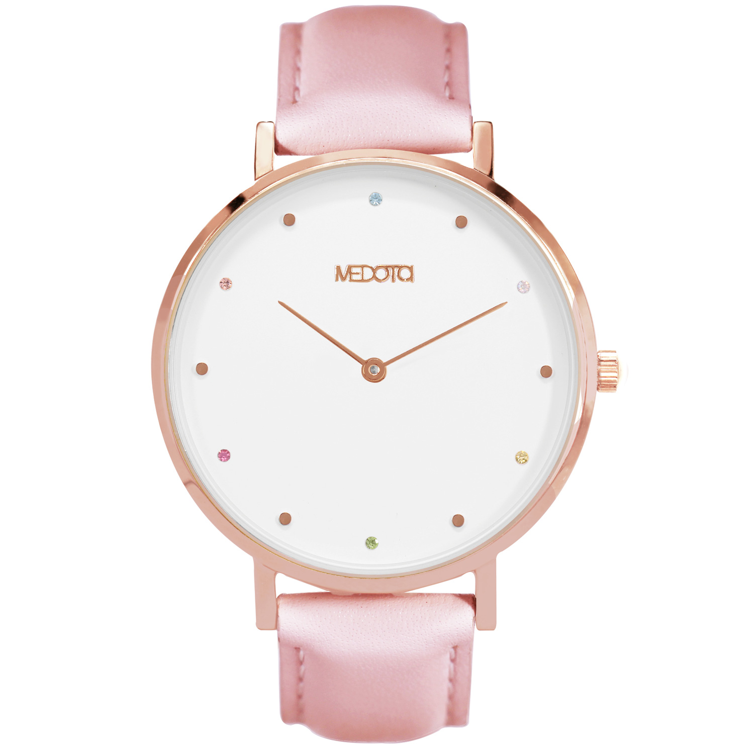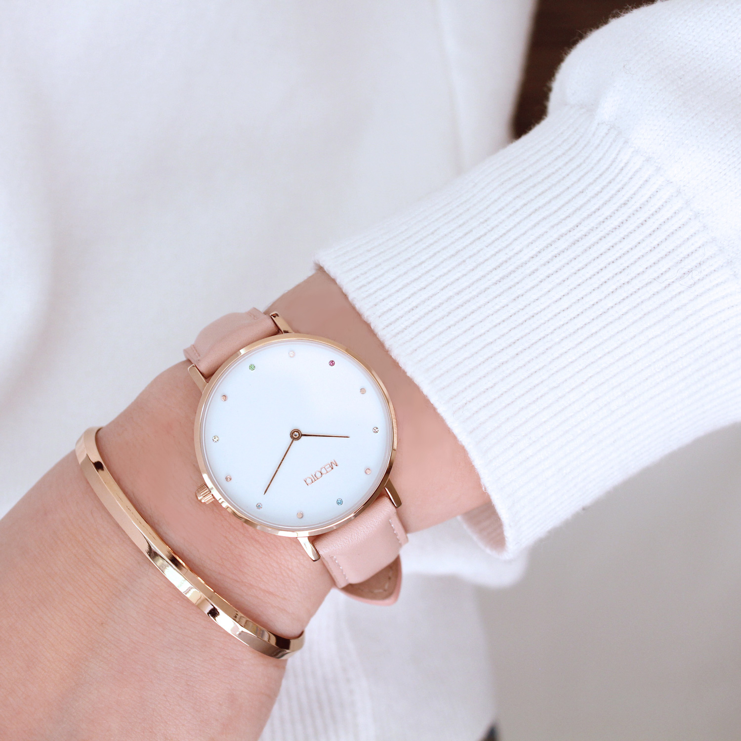 RAINBOW系列採用進口捷克鑽石,以小巧可愛的圓形點綴於潔白的錶面 上,搭配上粉色真皮錶帶,散發出濃烈的少女感