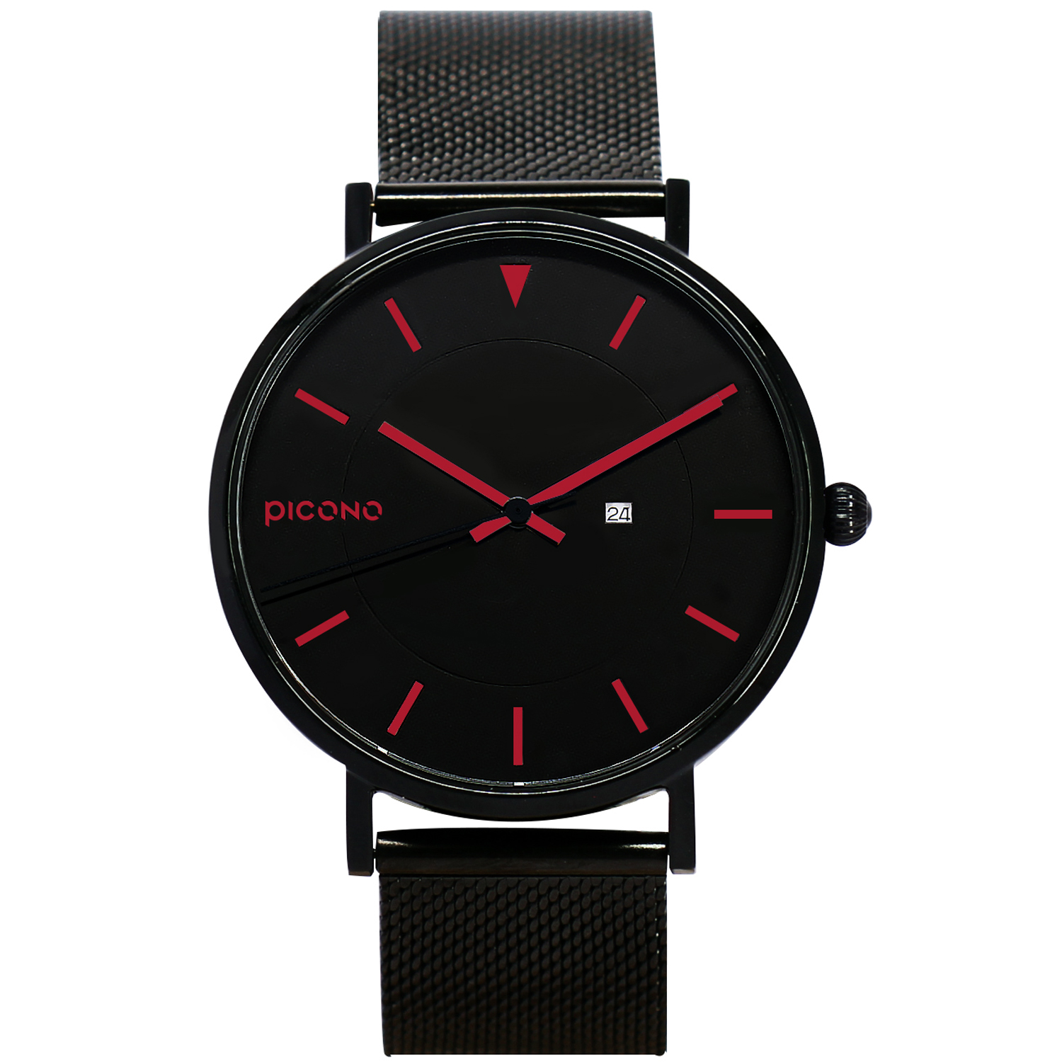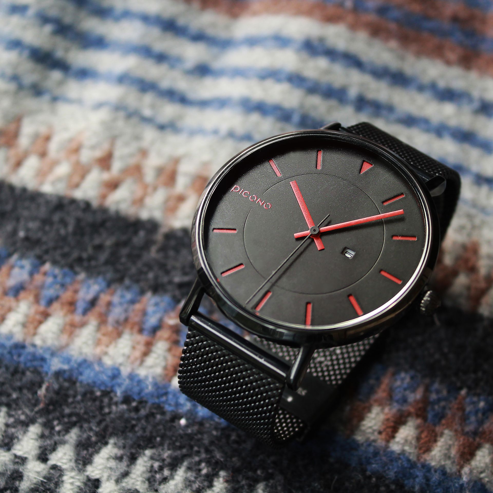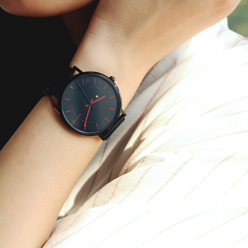 此次同時也是PICONO第一支不鏽鋼網帶錶款,以相同色系的黑色搭配,為錶錶款增添更多整體和諧感。