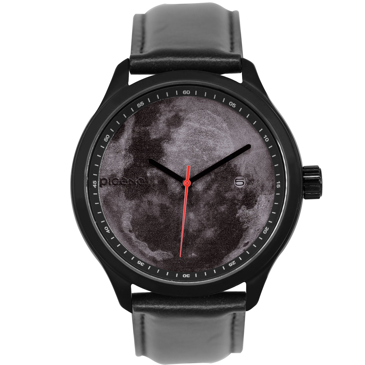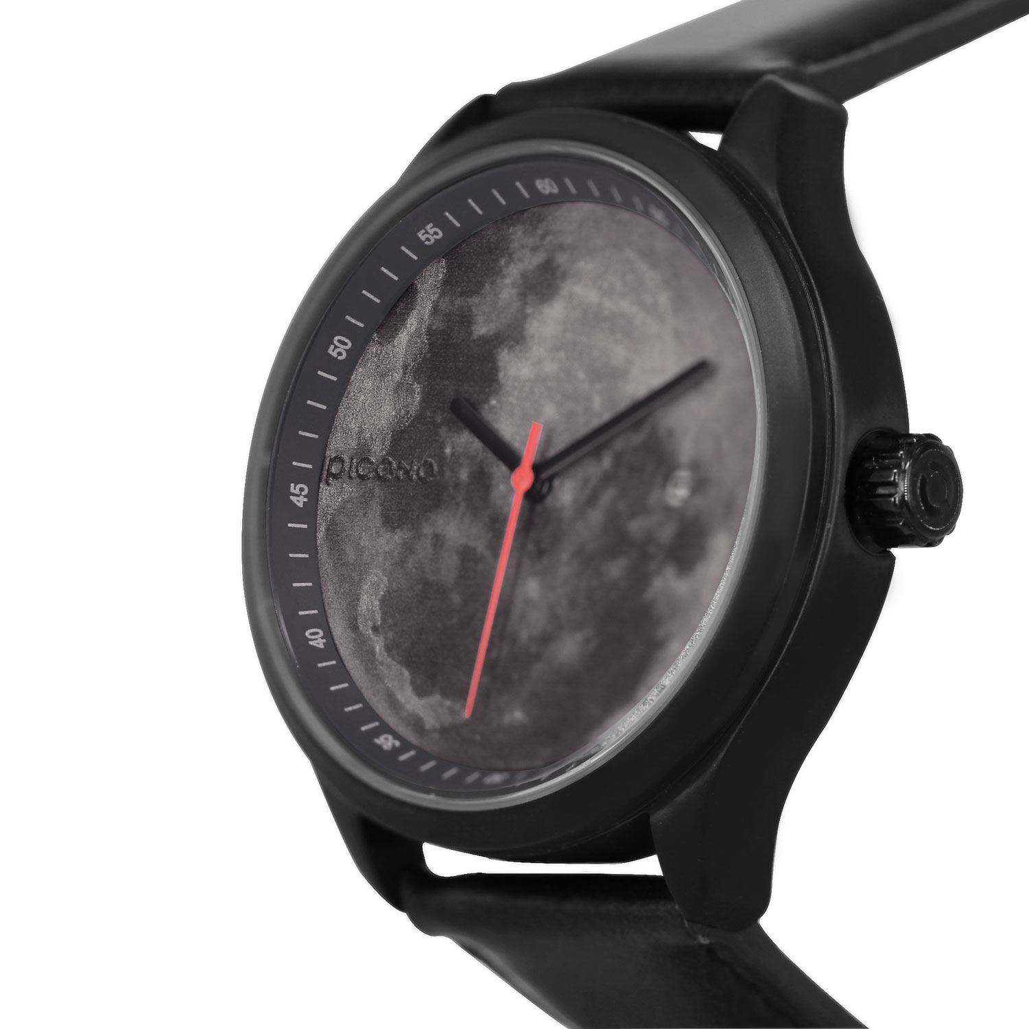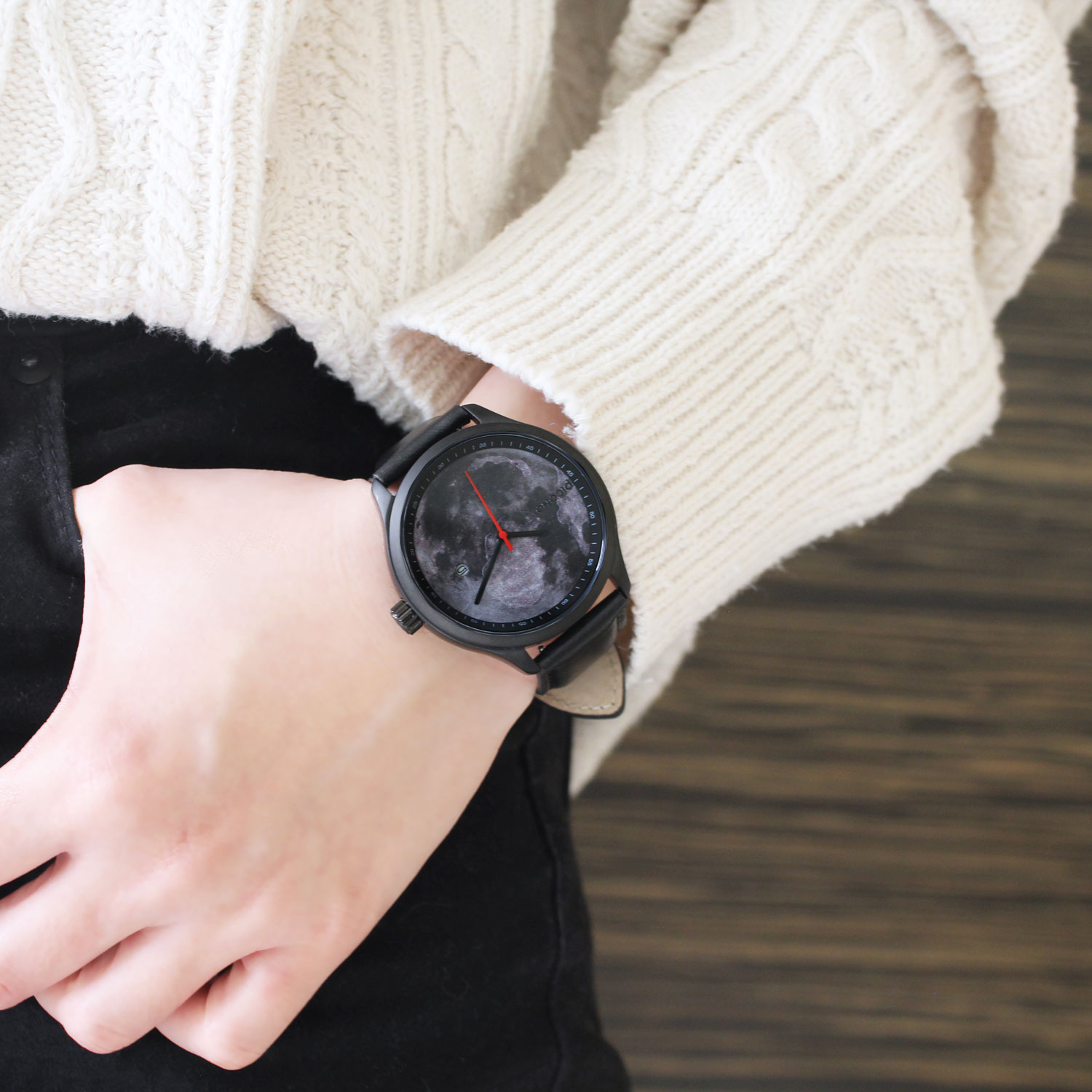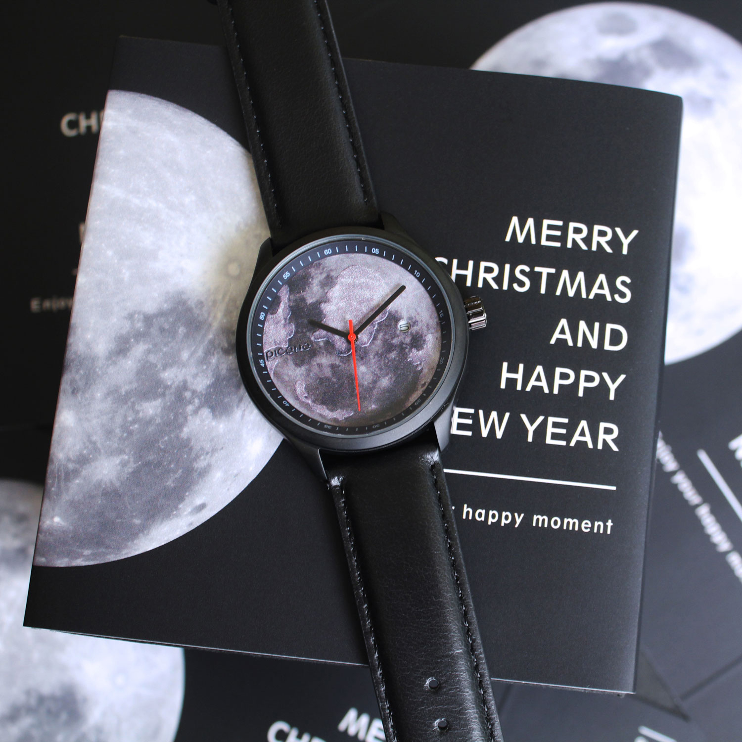 Space X'mas 系列簡約黑色真皮中性錶 - 微立體月球 / MT-10801
