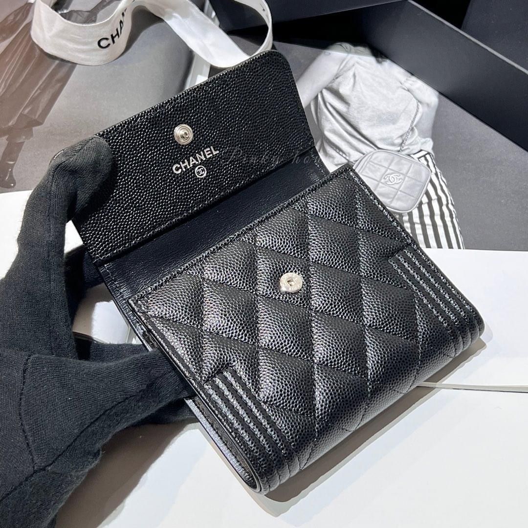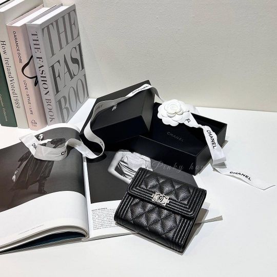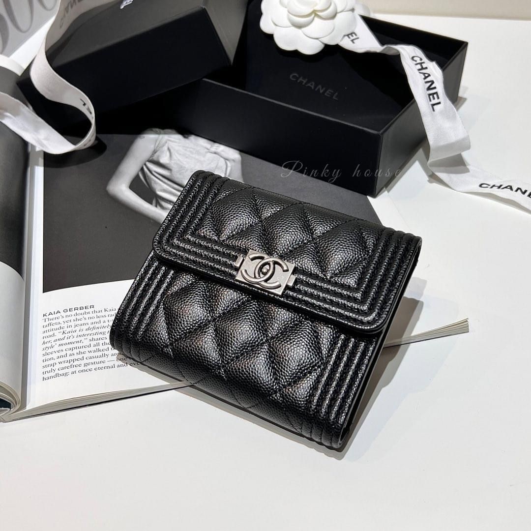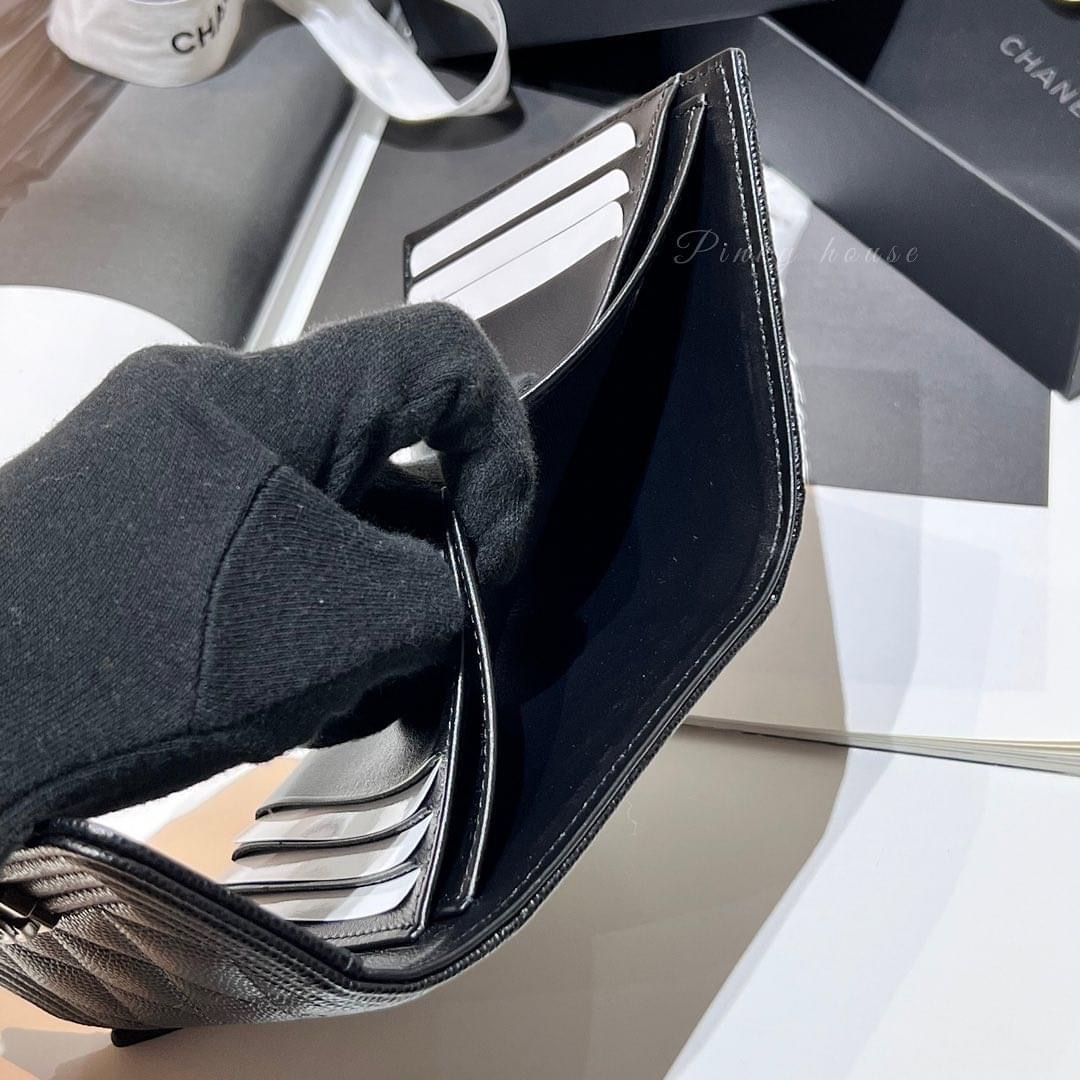 Chanel boy 荔枝牛皮黑復古銀扣3折短夾