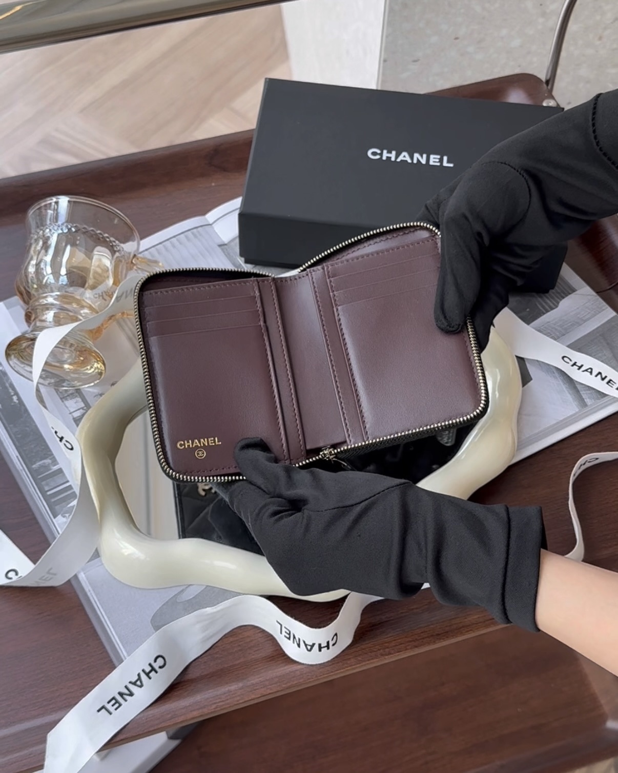【CHANEL】荔枝拉鏈式對開短夾 黑色