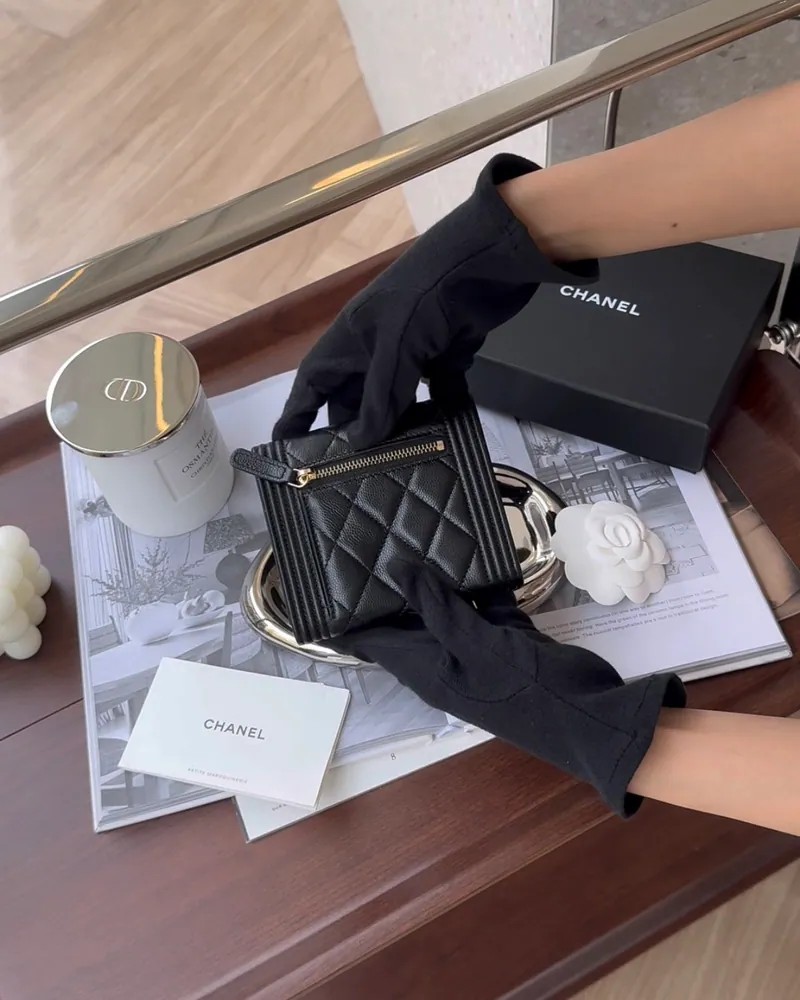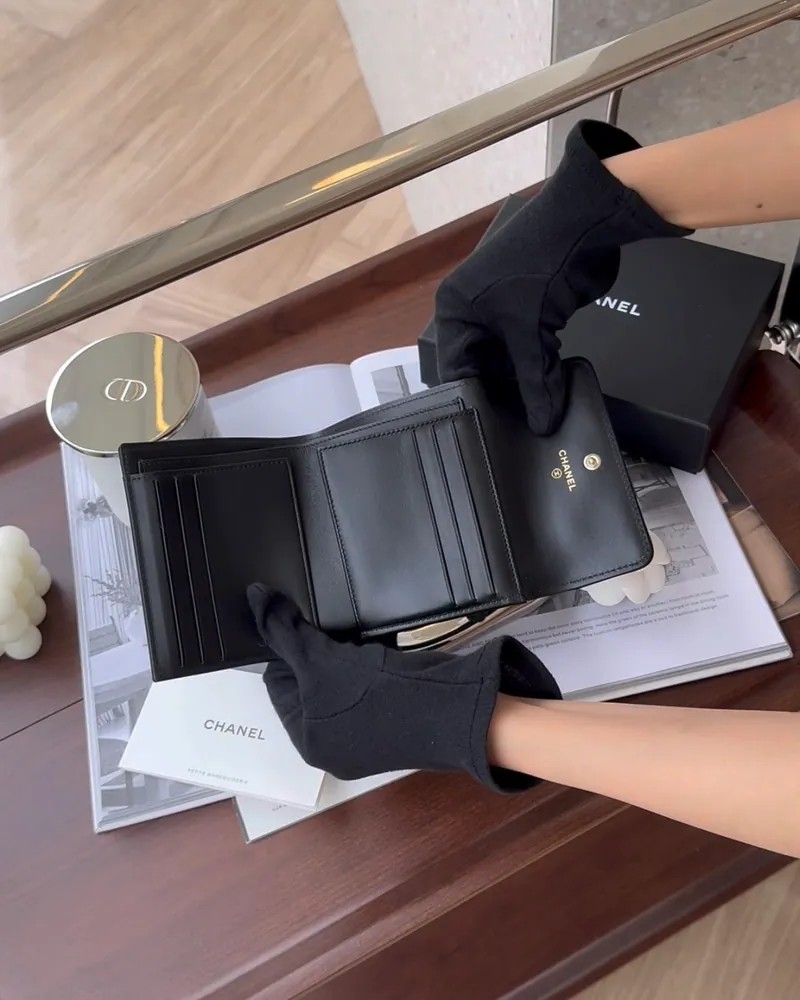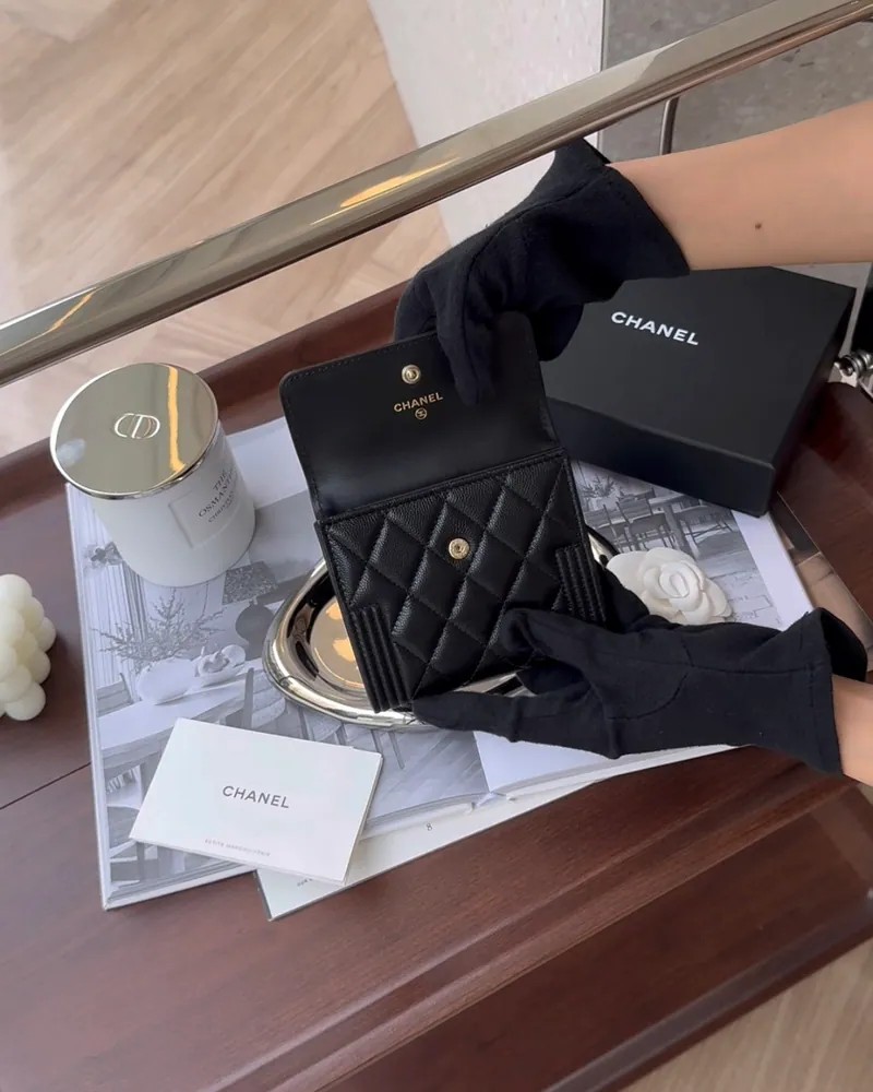 【CHANEL】荔枝BOY 三折短夾 背拉款 黑淡金(亮面LOGO)