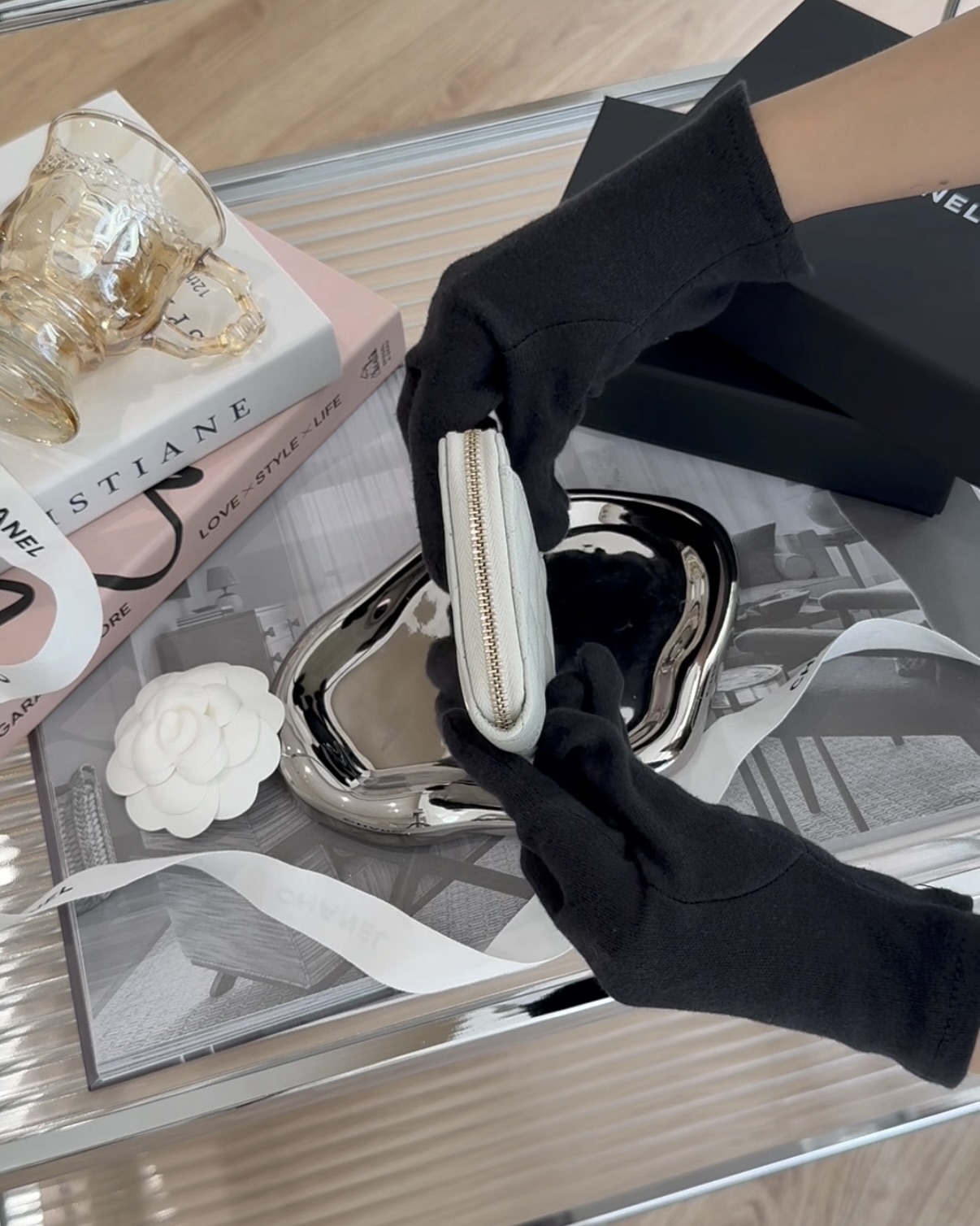 【CHANEL】荔枝L拉鍊短夾 淺灰色