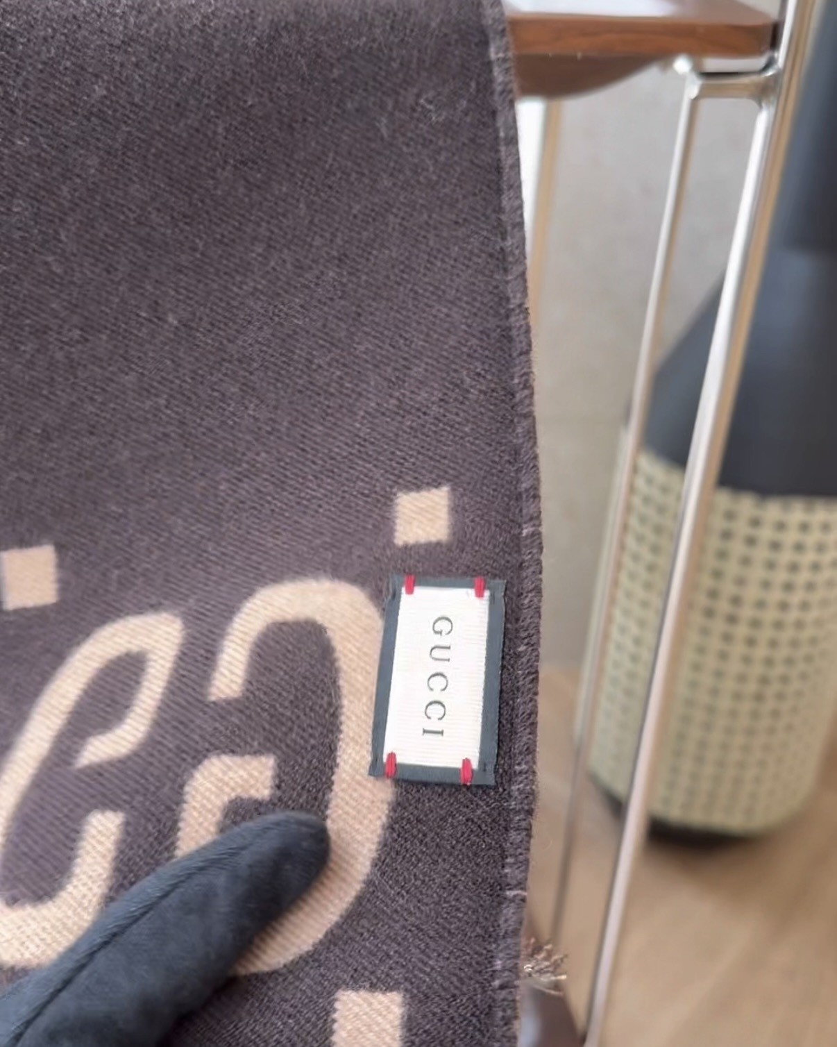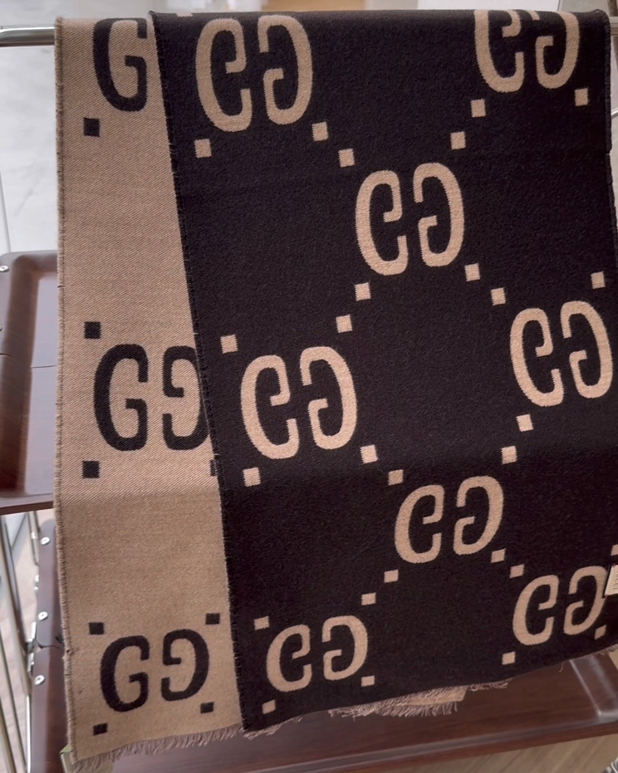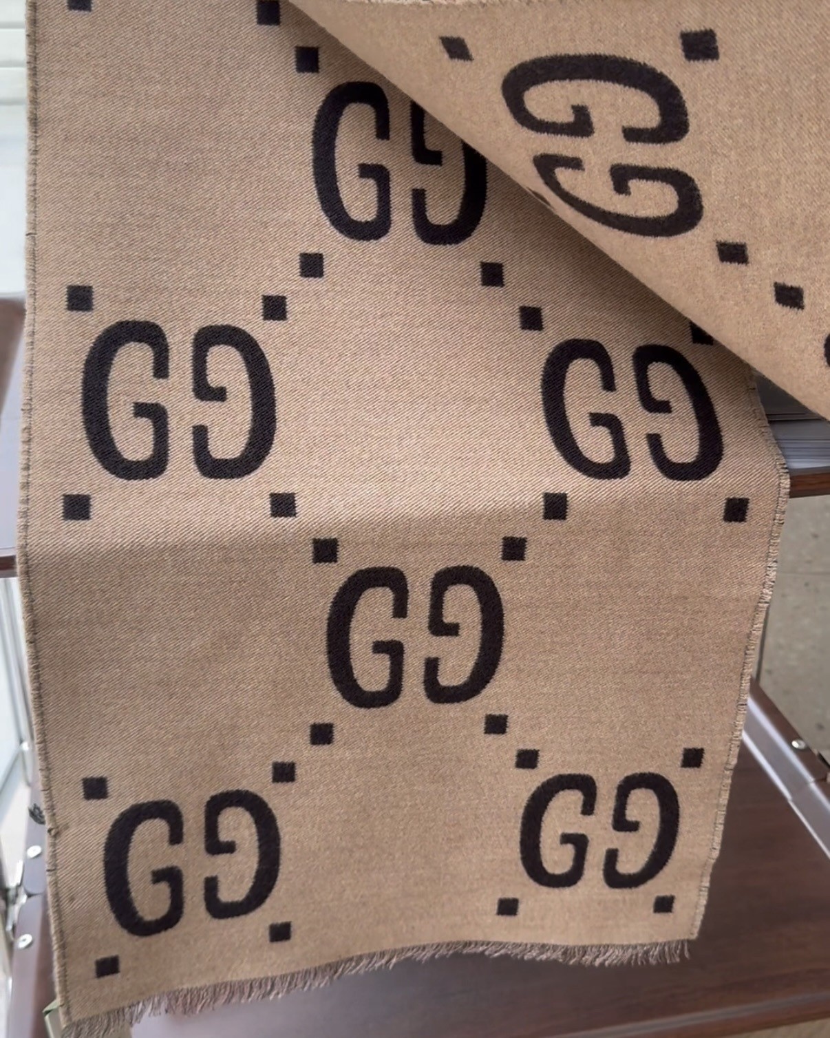 【GUCCI】提花羊毛絲圍巾 棕色/米色