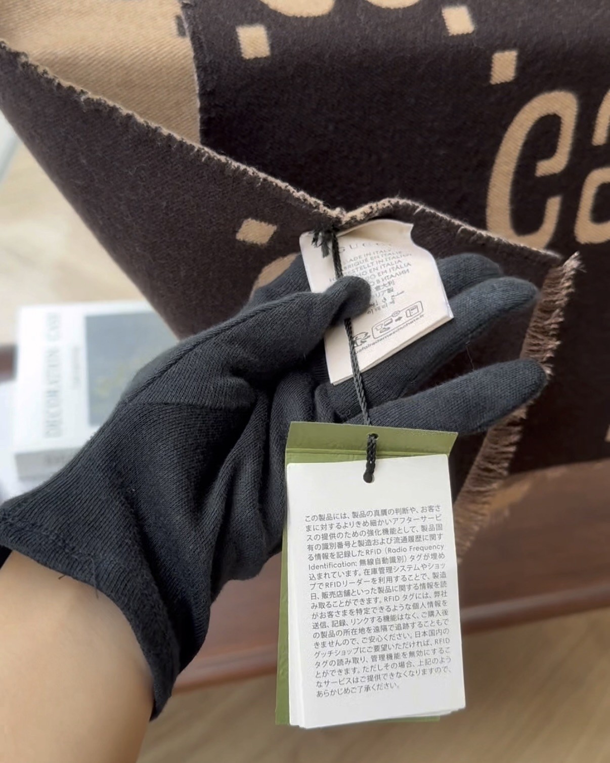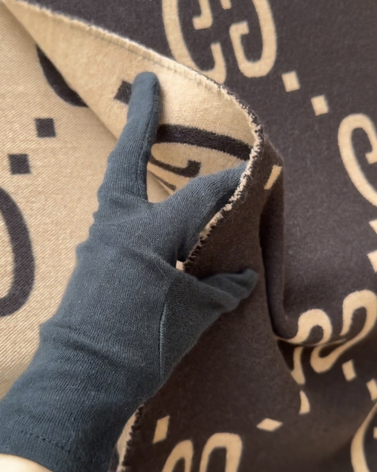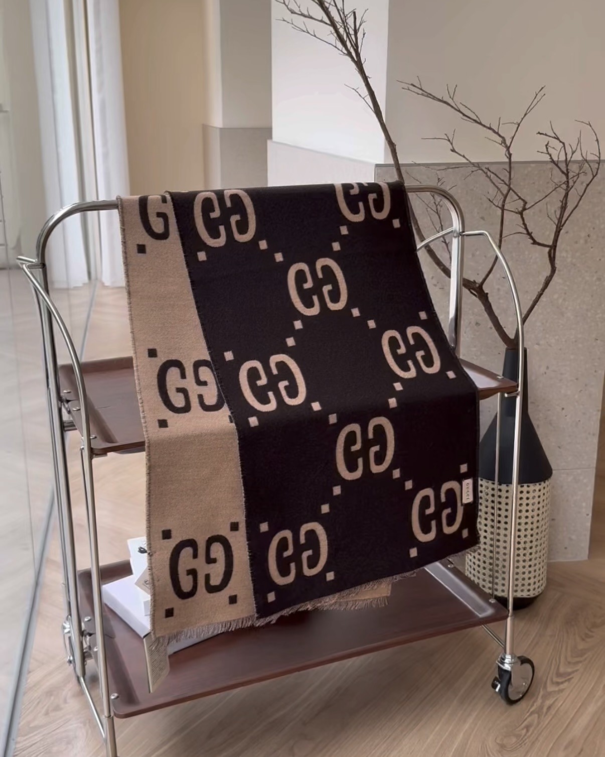 【GUCCI】提花羊毛絲圍巾 棕色/米色