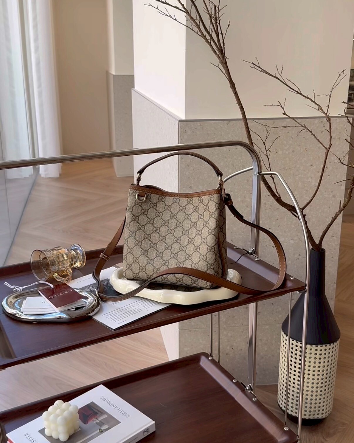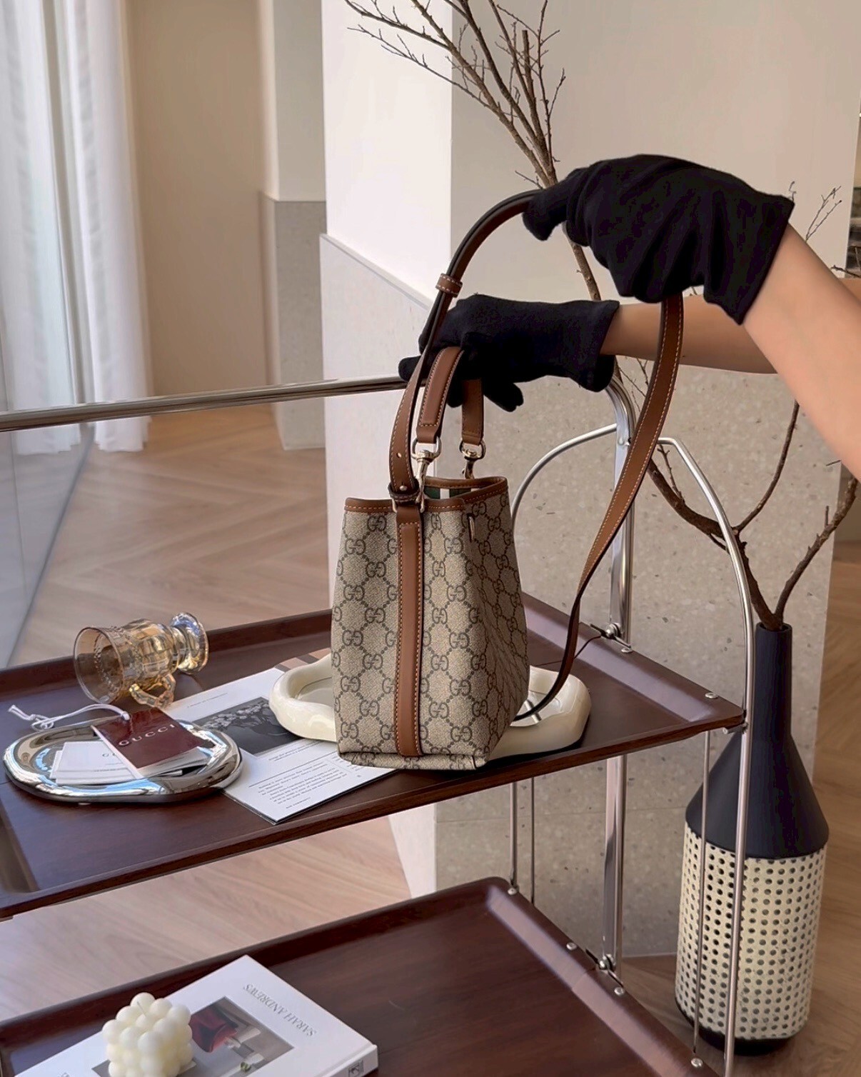 【GUCCI】GG EMBLEM 迷你水桶包 棕色老花
