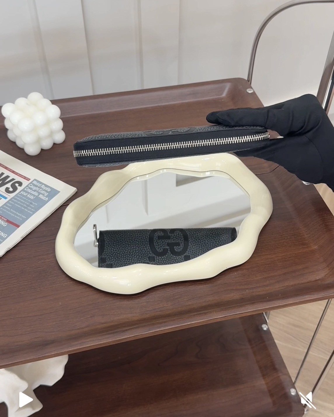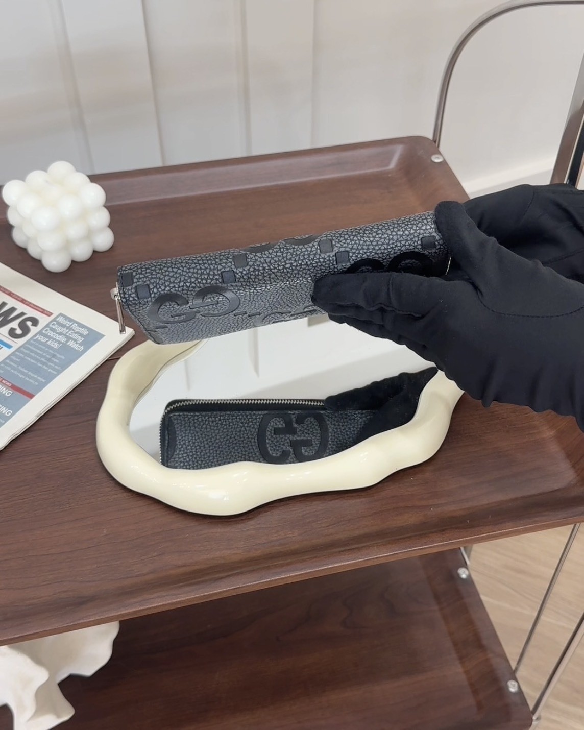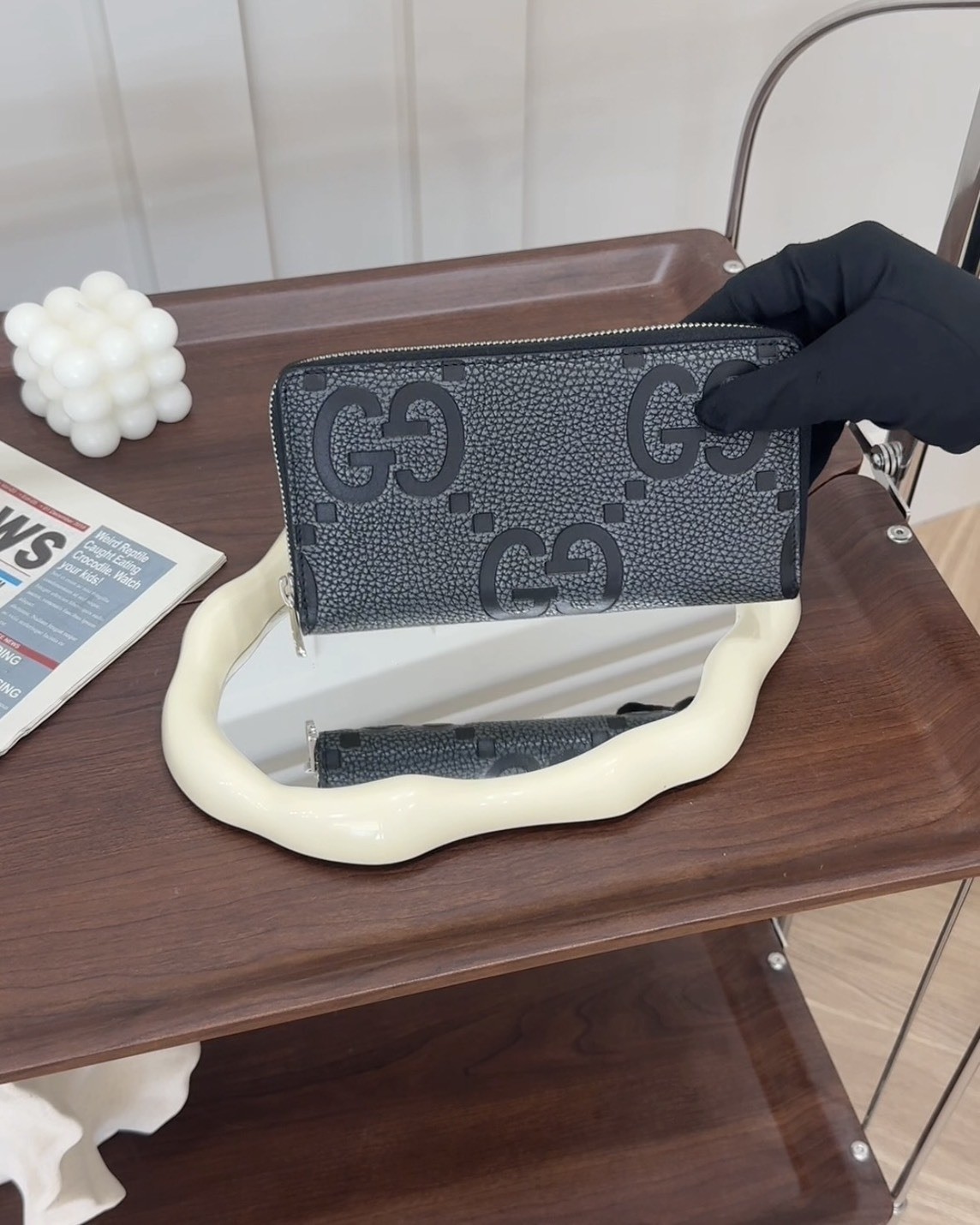 【GUCCI】MAXI GG 拉鍊長夾 深灰拼黑色