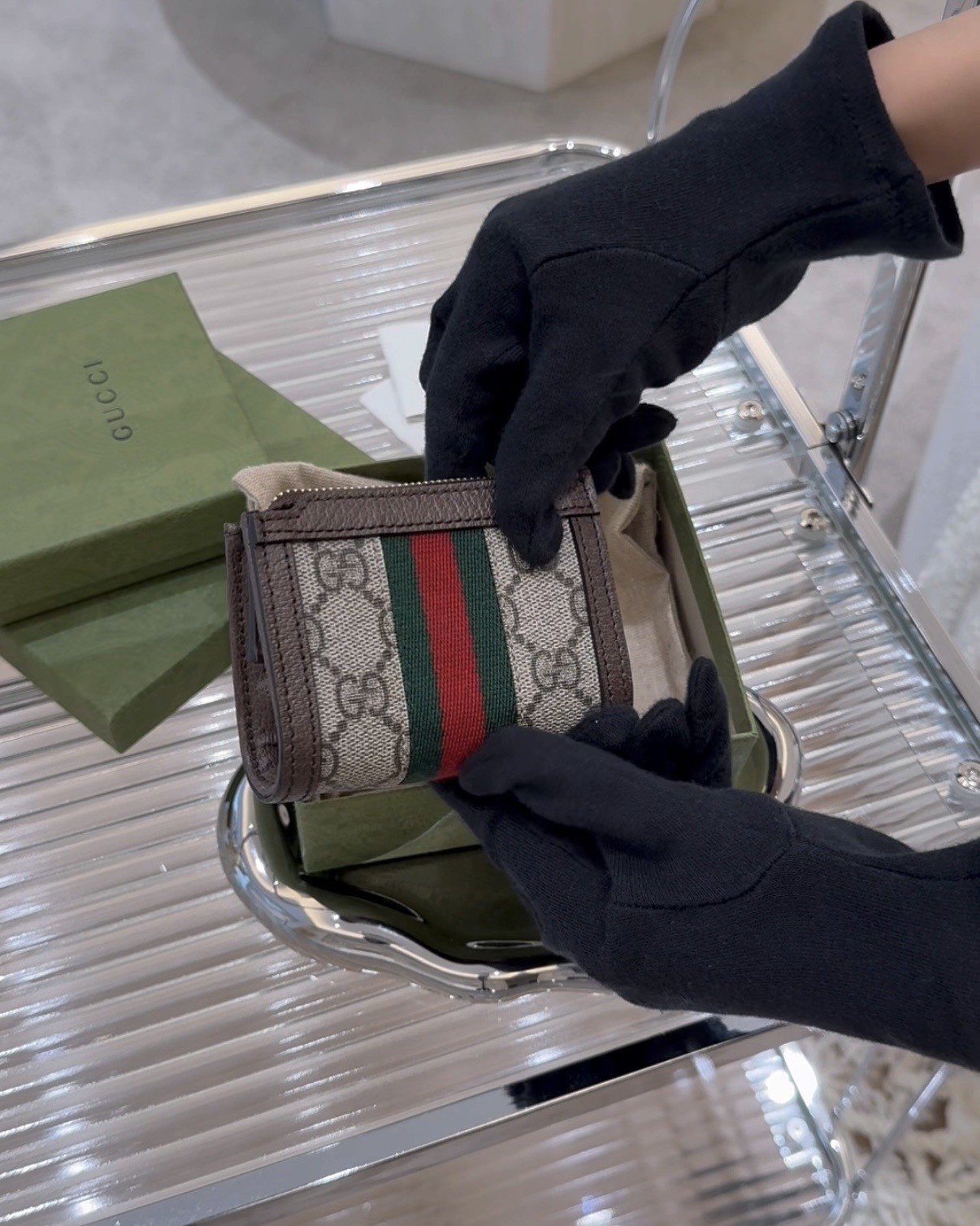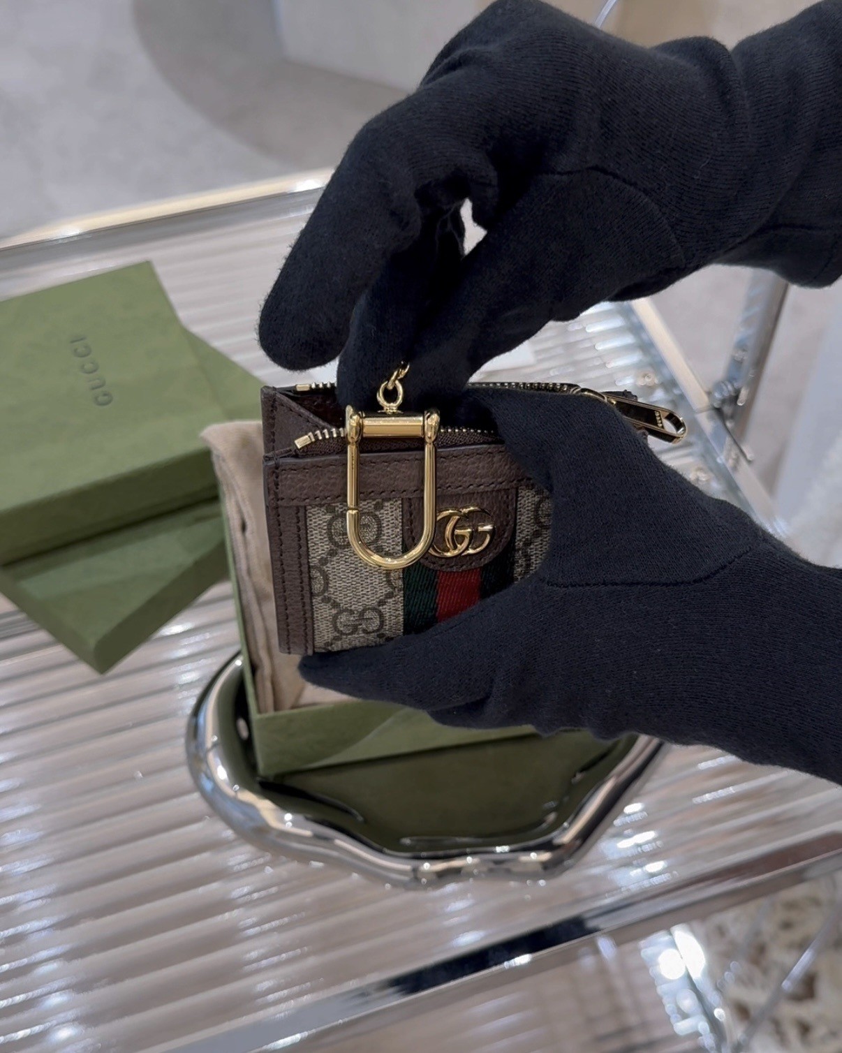 【GUCCI】OPHIDIA 拼皮革拉鍊零錢包 棕色老花