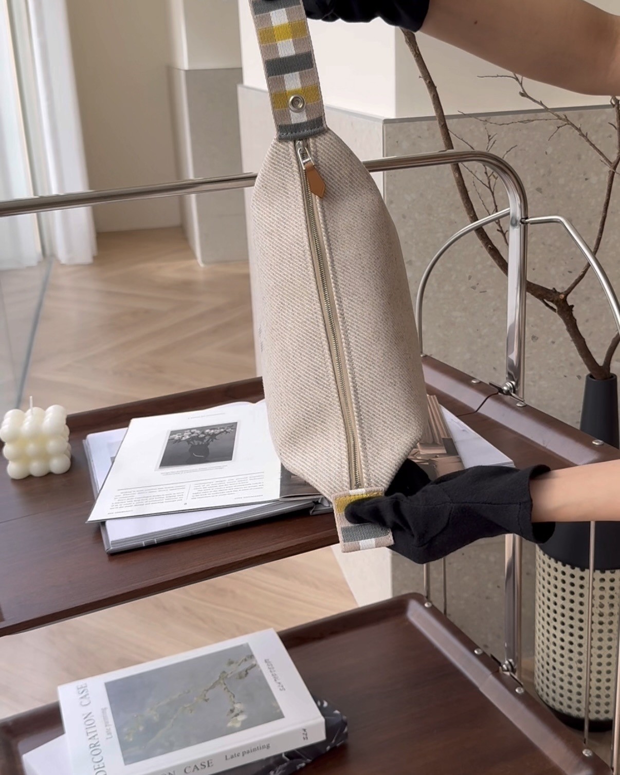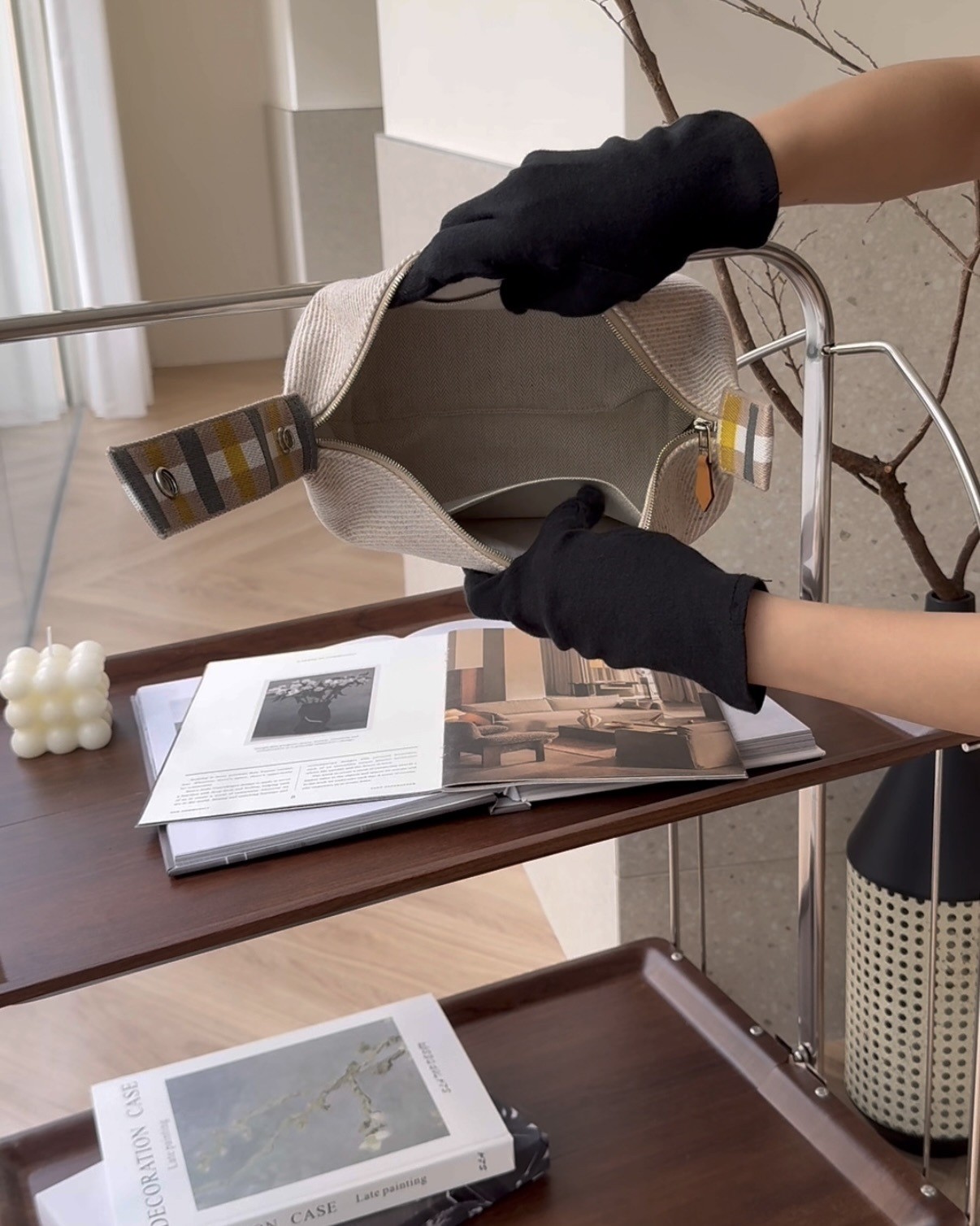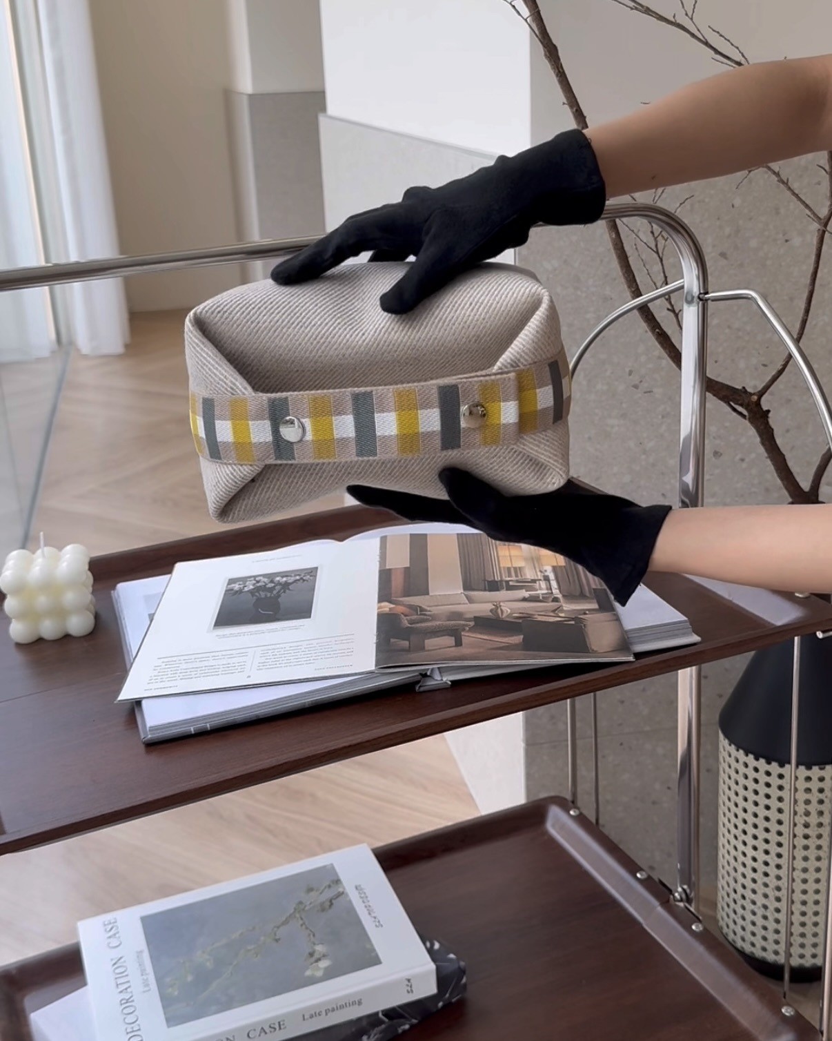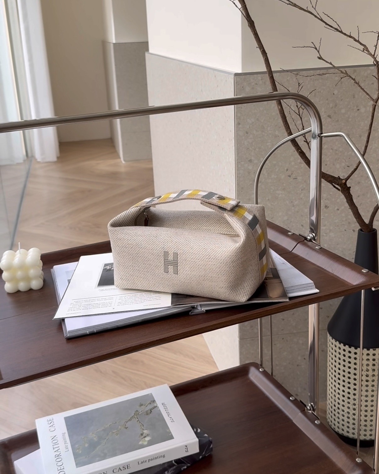 【HERMES】格紋帆布小號飯盒包 米色