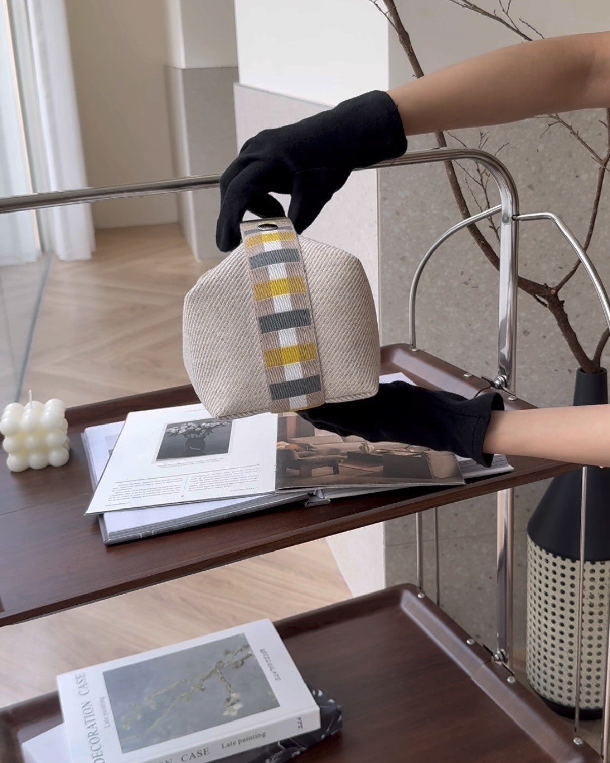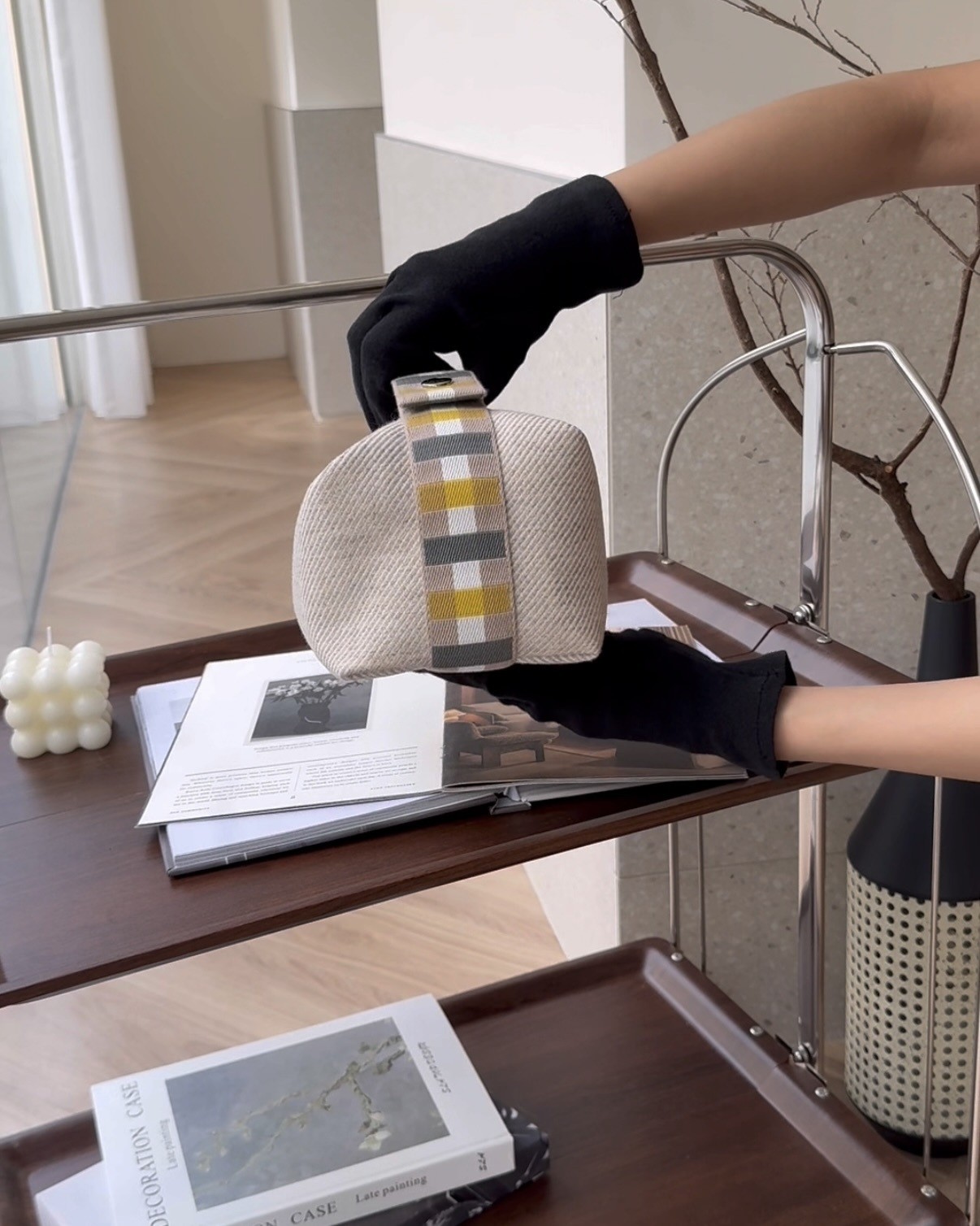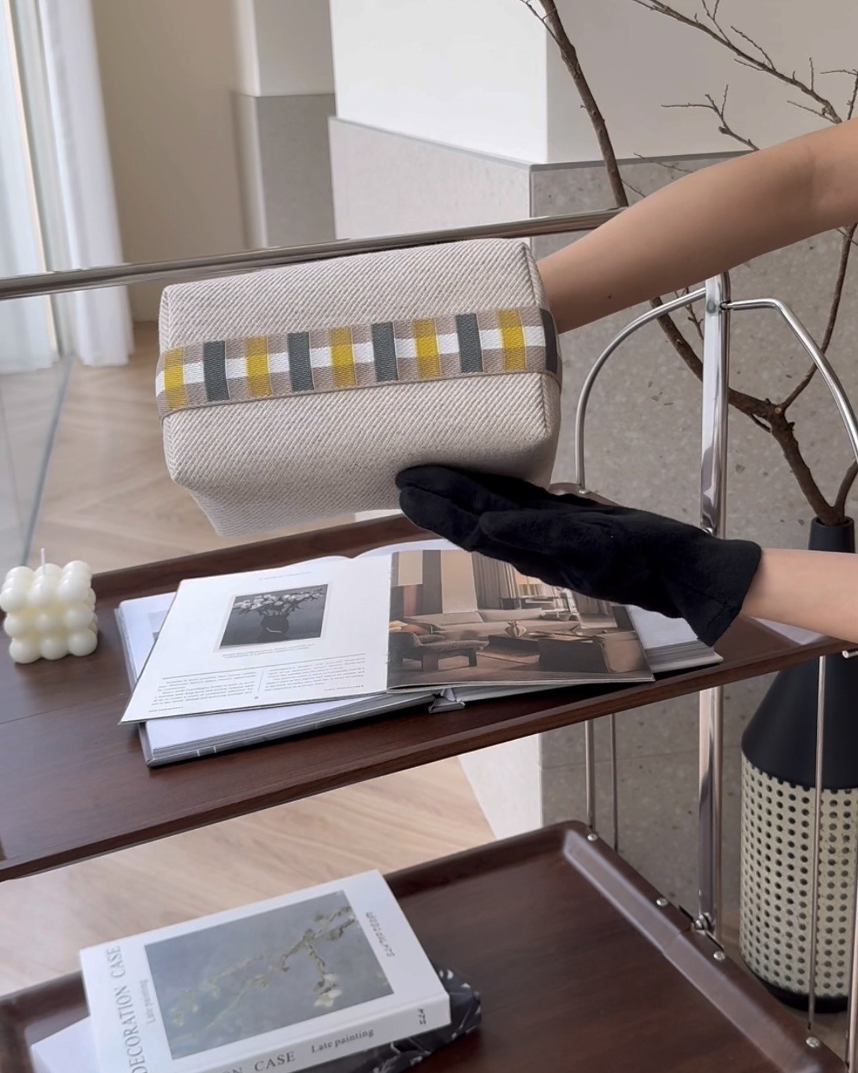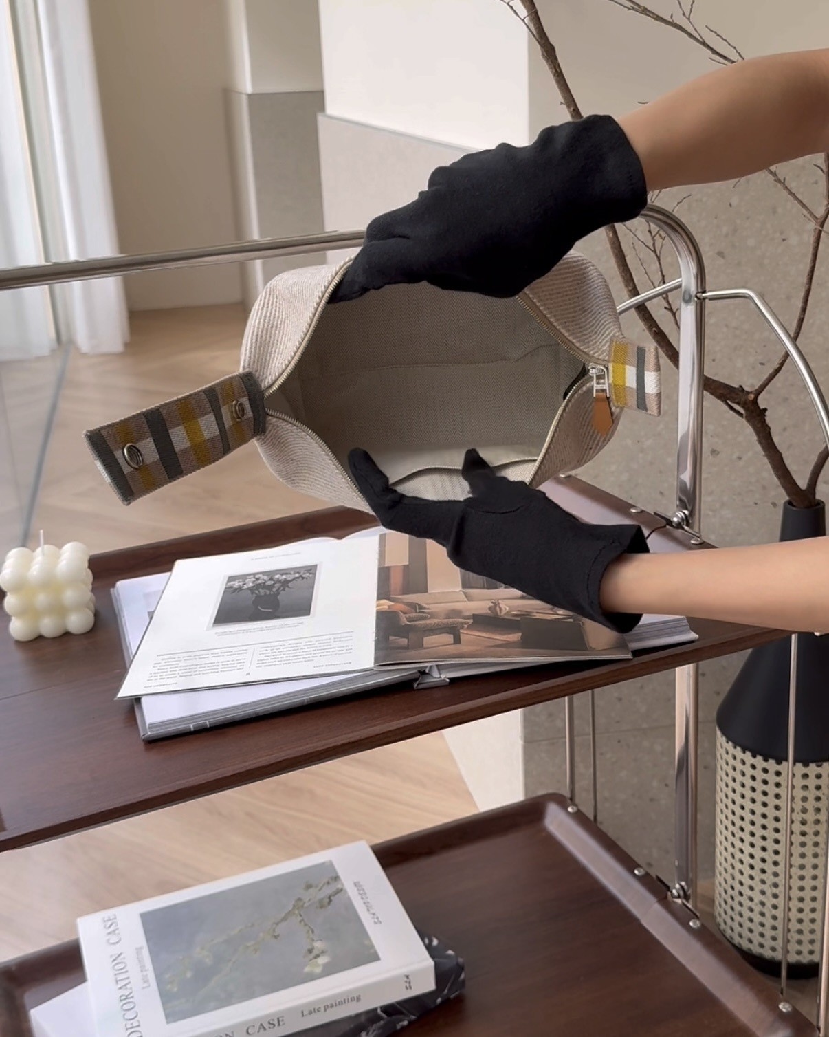【HERMES】格紋帆布小號飯盒包 米色