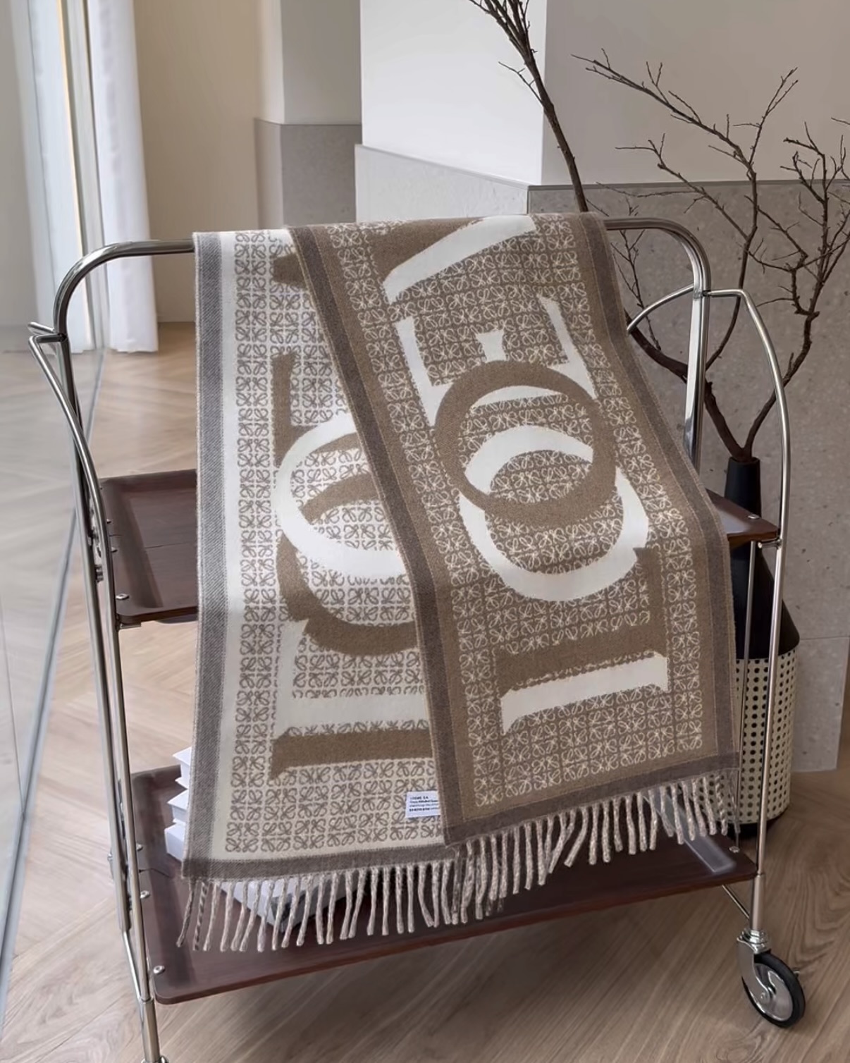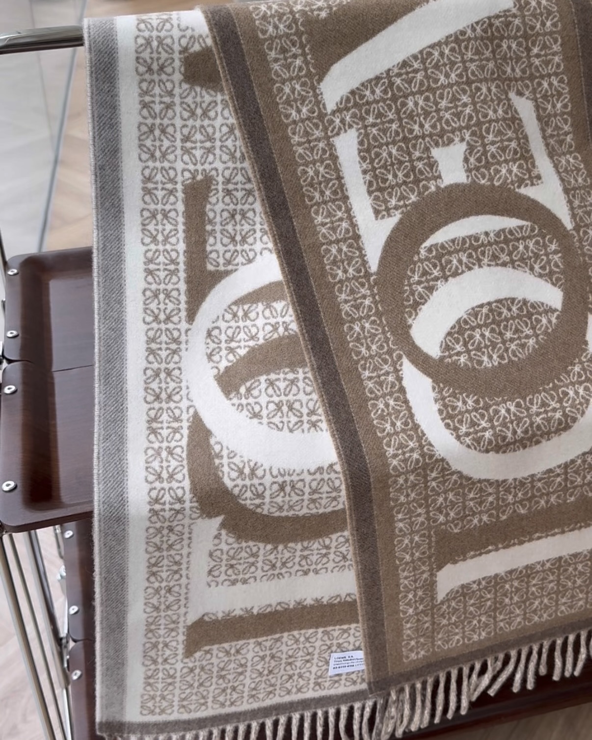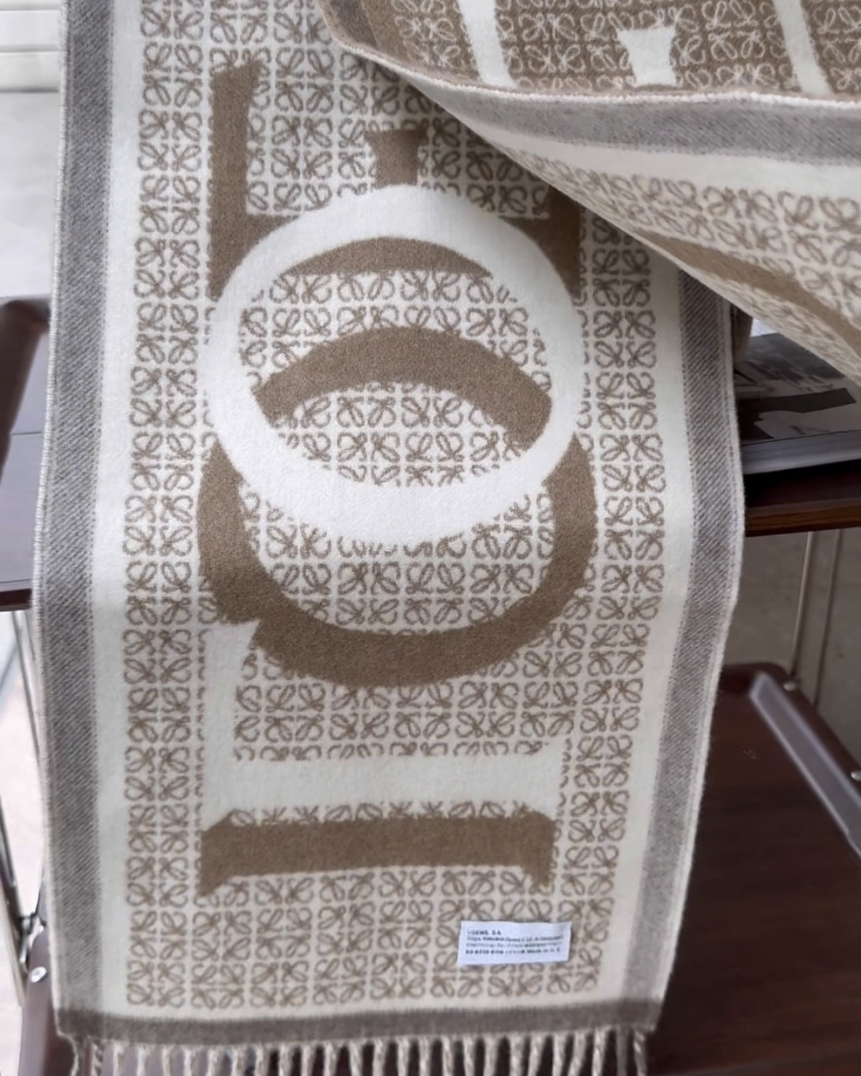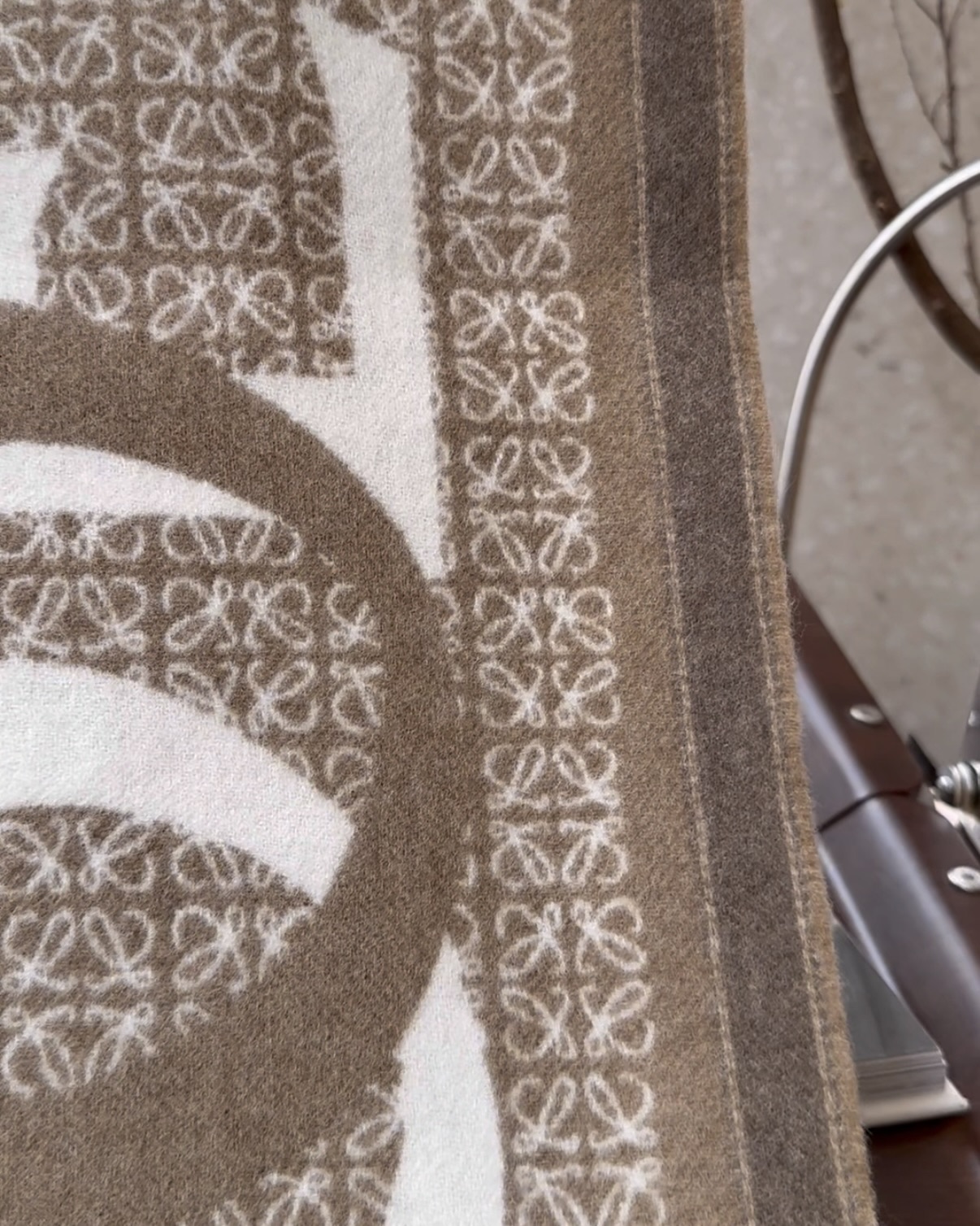 【LOEWE】羊絨羊毛雙面字體圍巾 奶茶色
