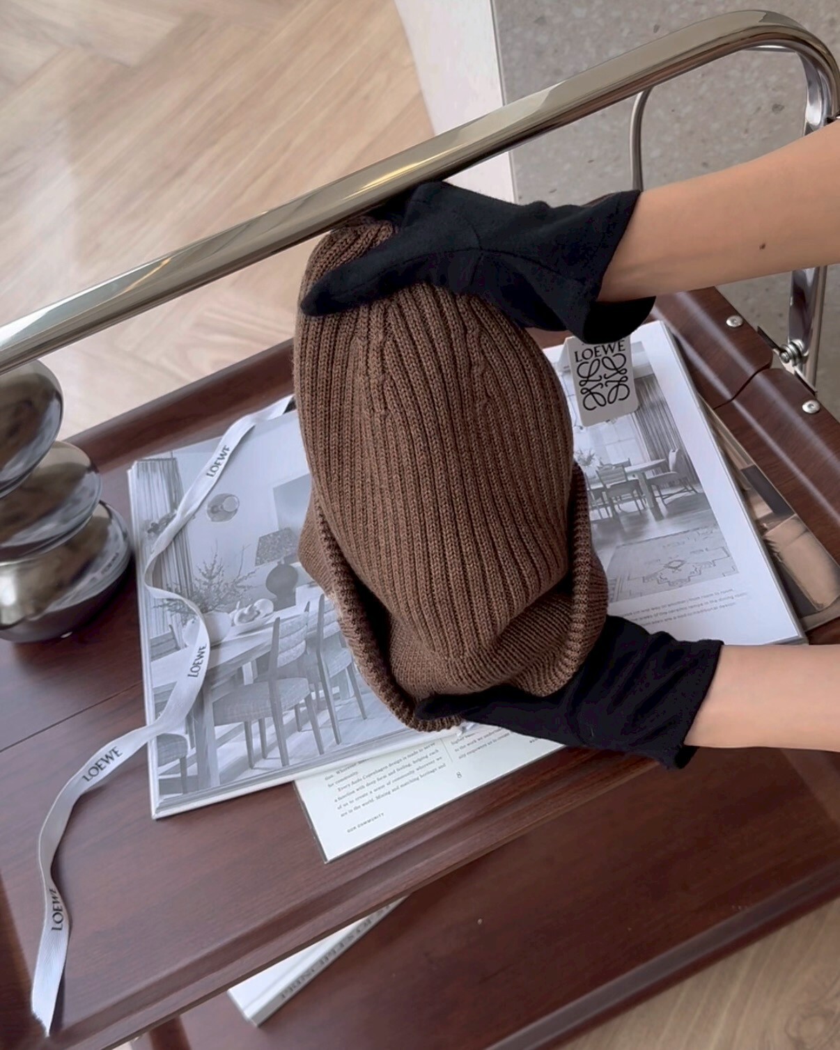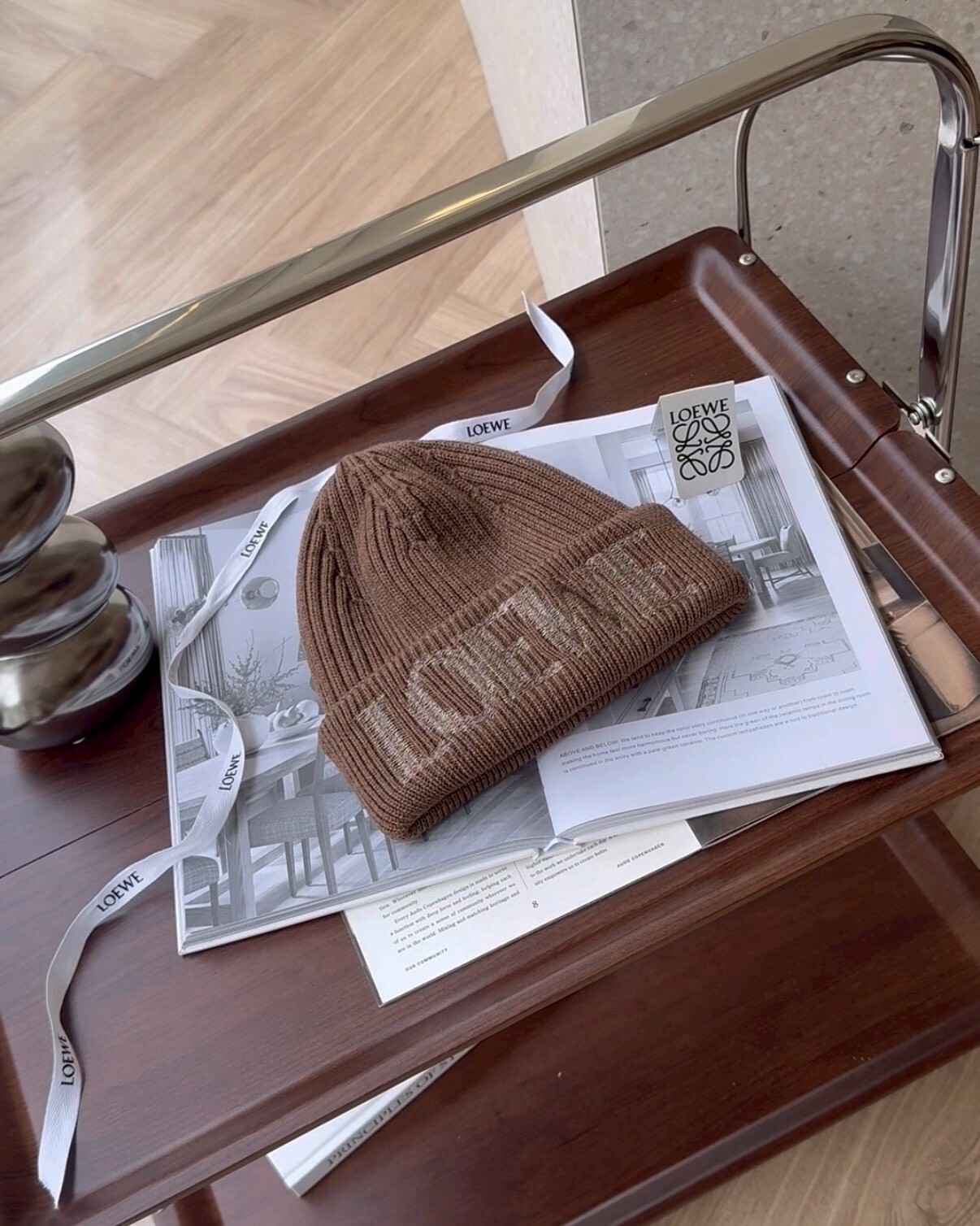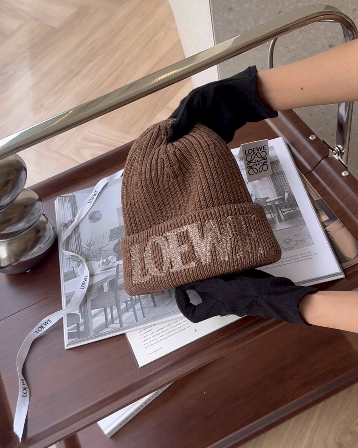 【LOEWE】LOGO刺繡羊毛毛帽 淺棕色