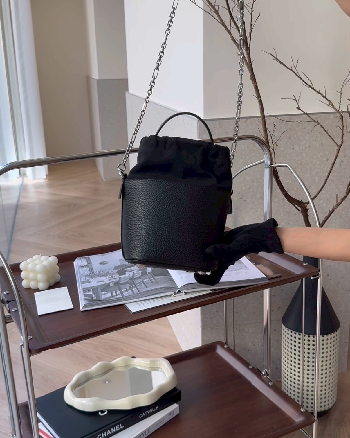 【 MAISON MARGIELA】5AC 拼接抽繩水桶包 黑色