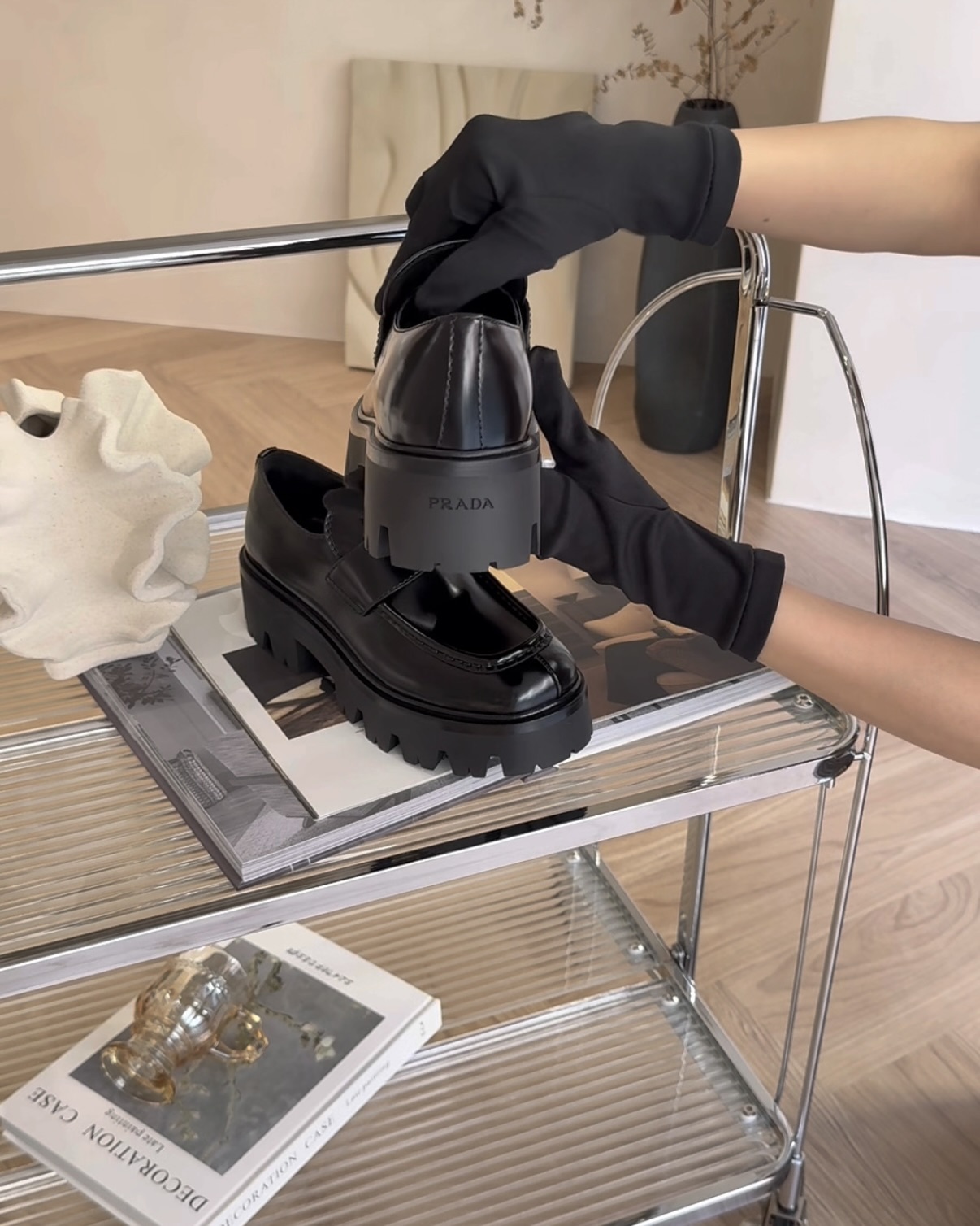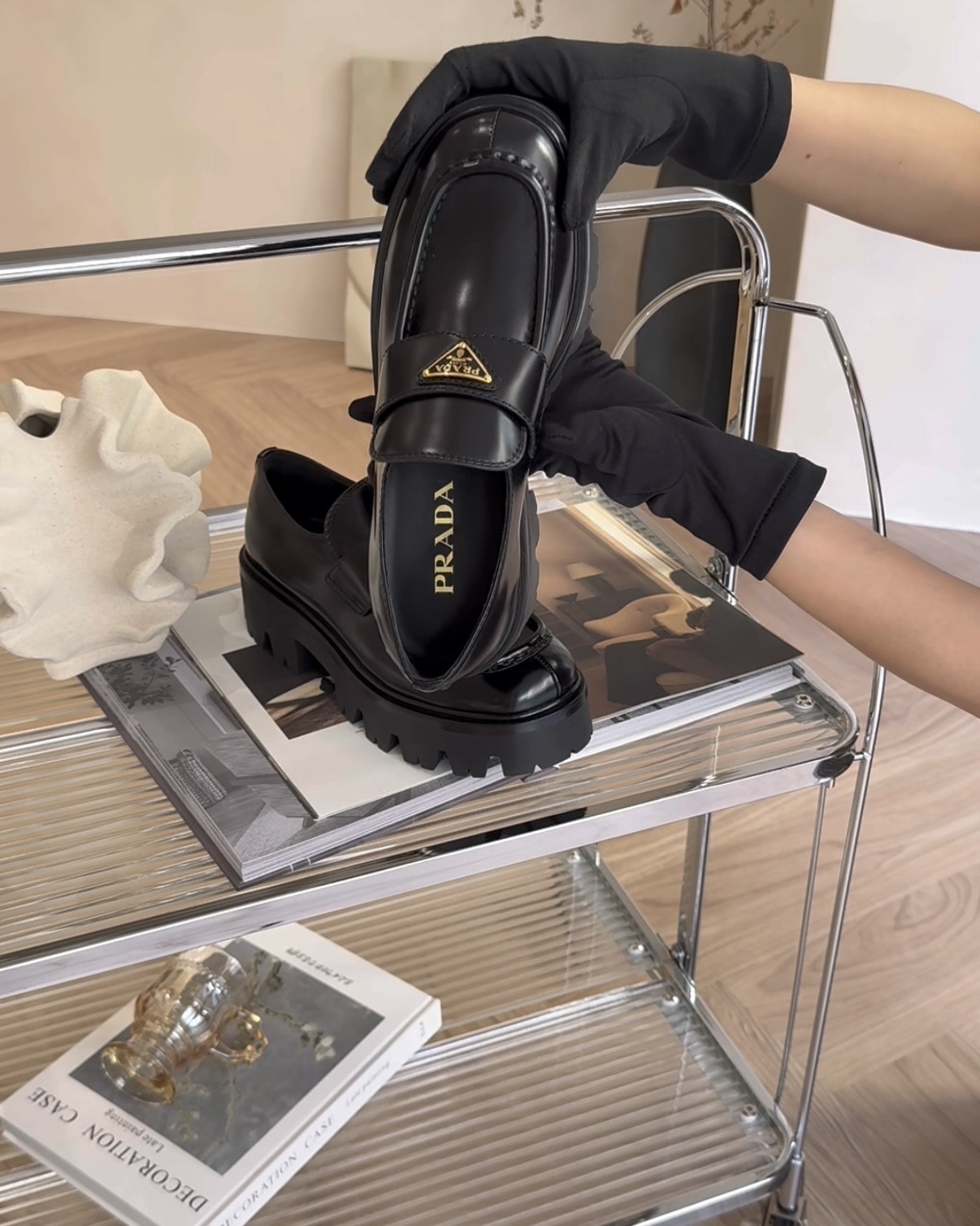 【PRADA】亮面皮革樂福鞋 黑色 三角形金色