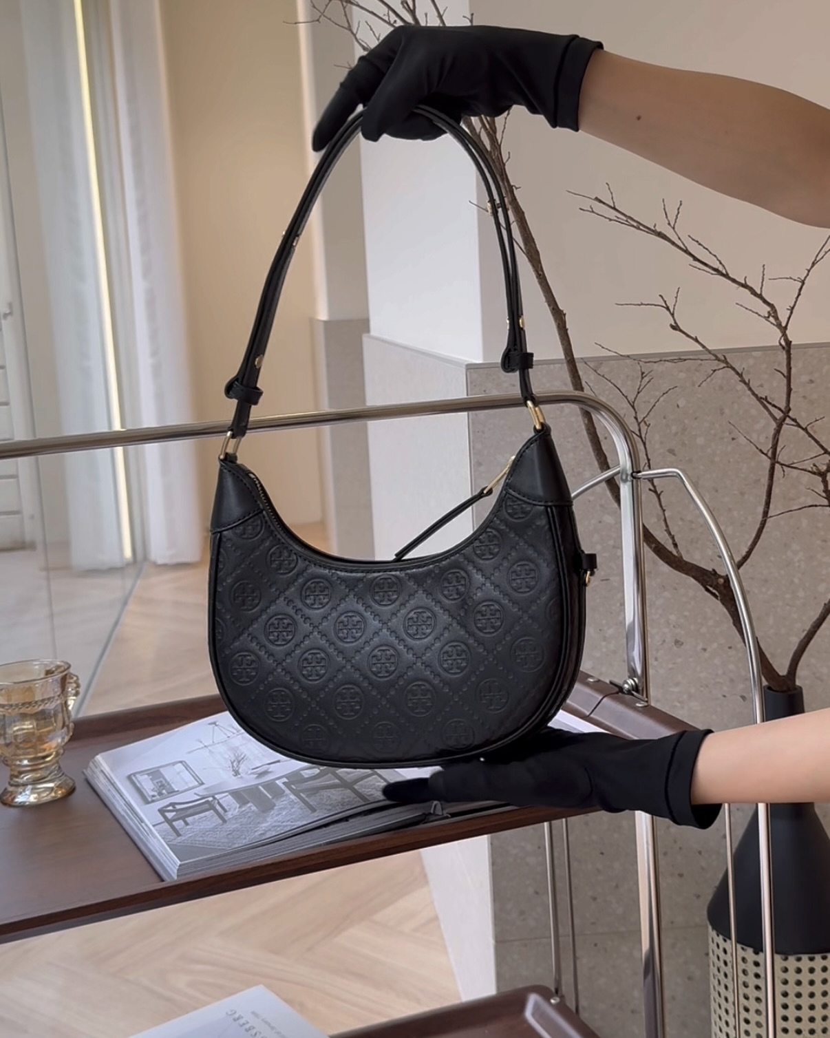 【TORY BURCH】T MONOGRAM LEATHER 半月包 黑色