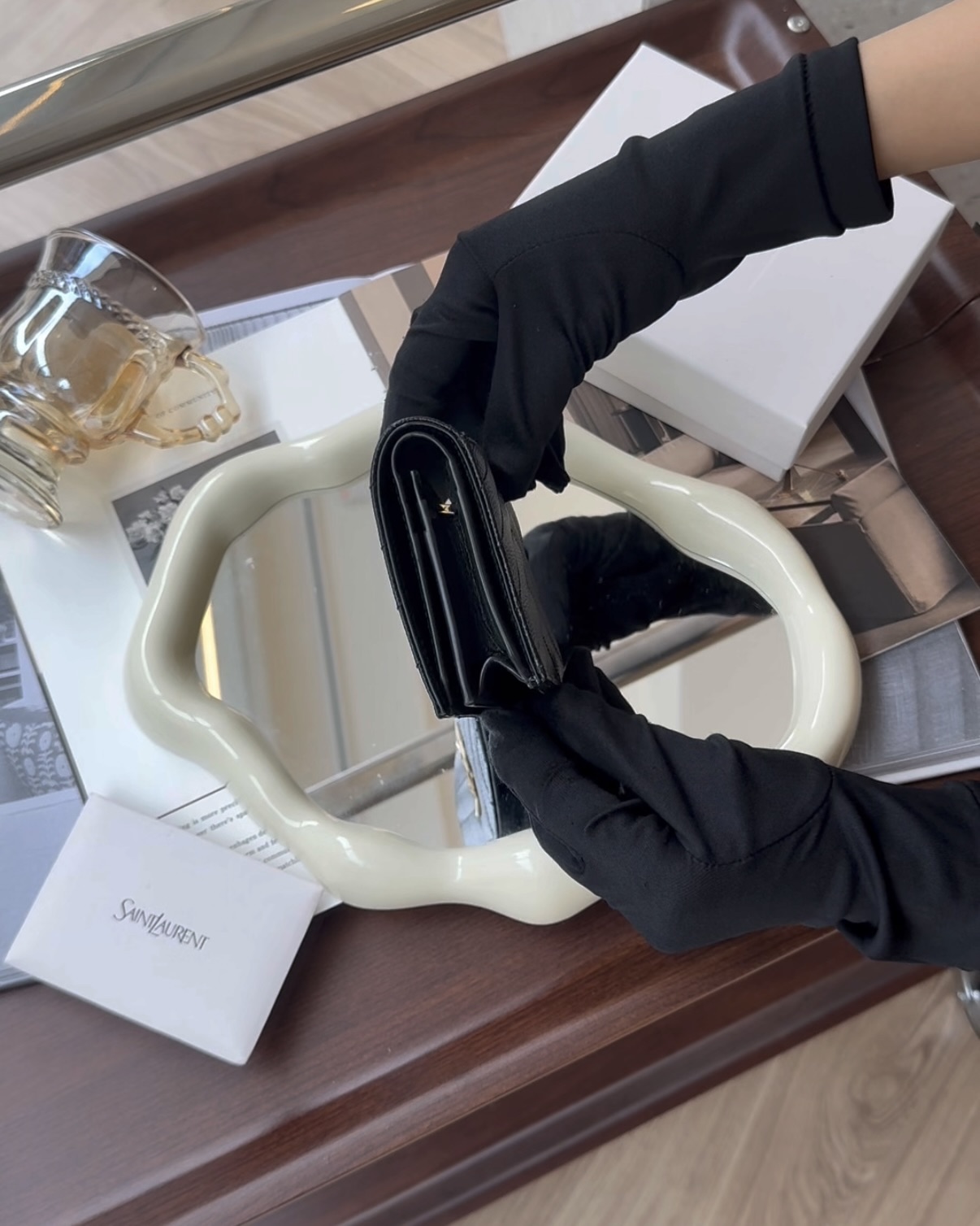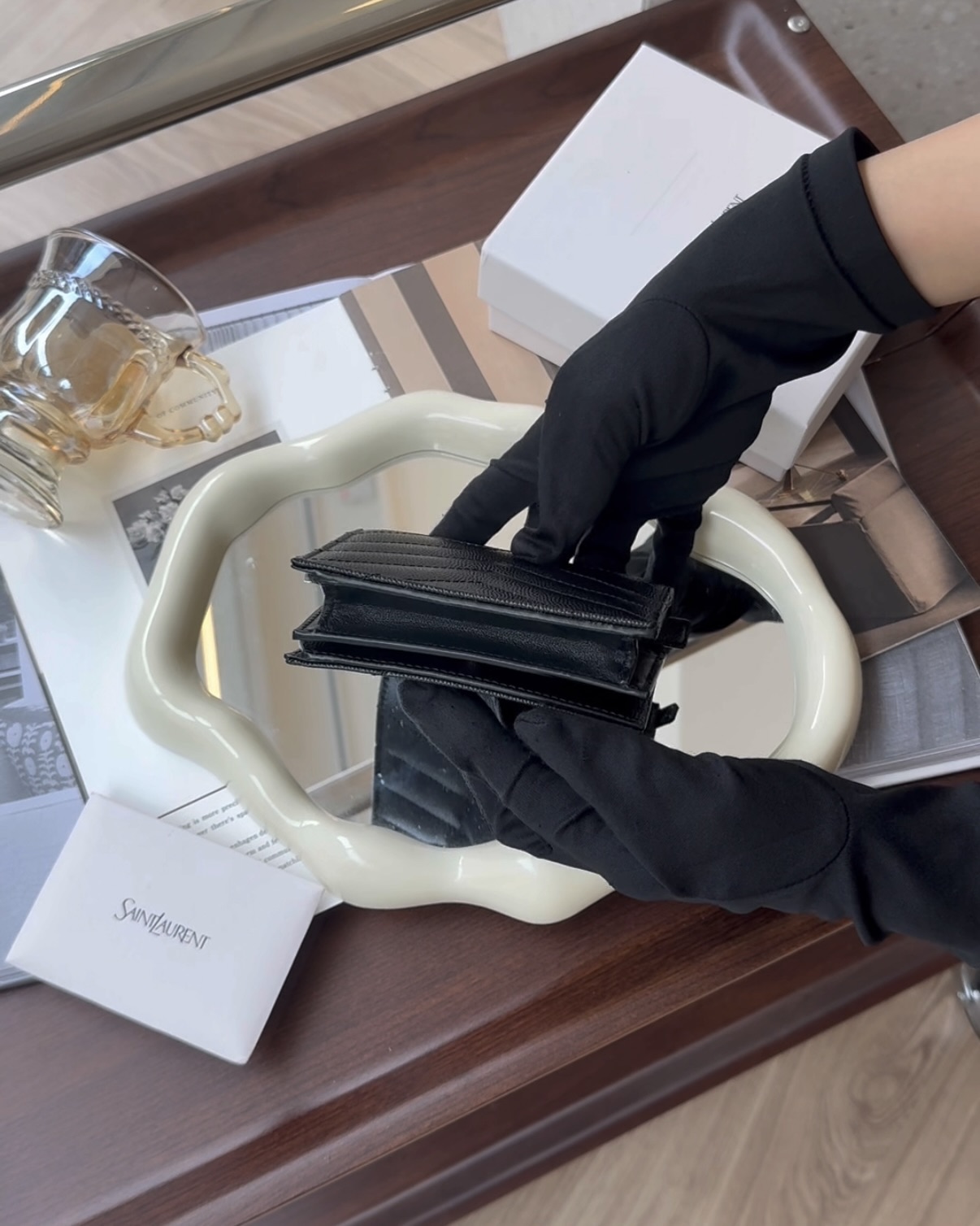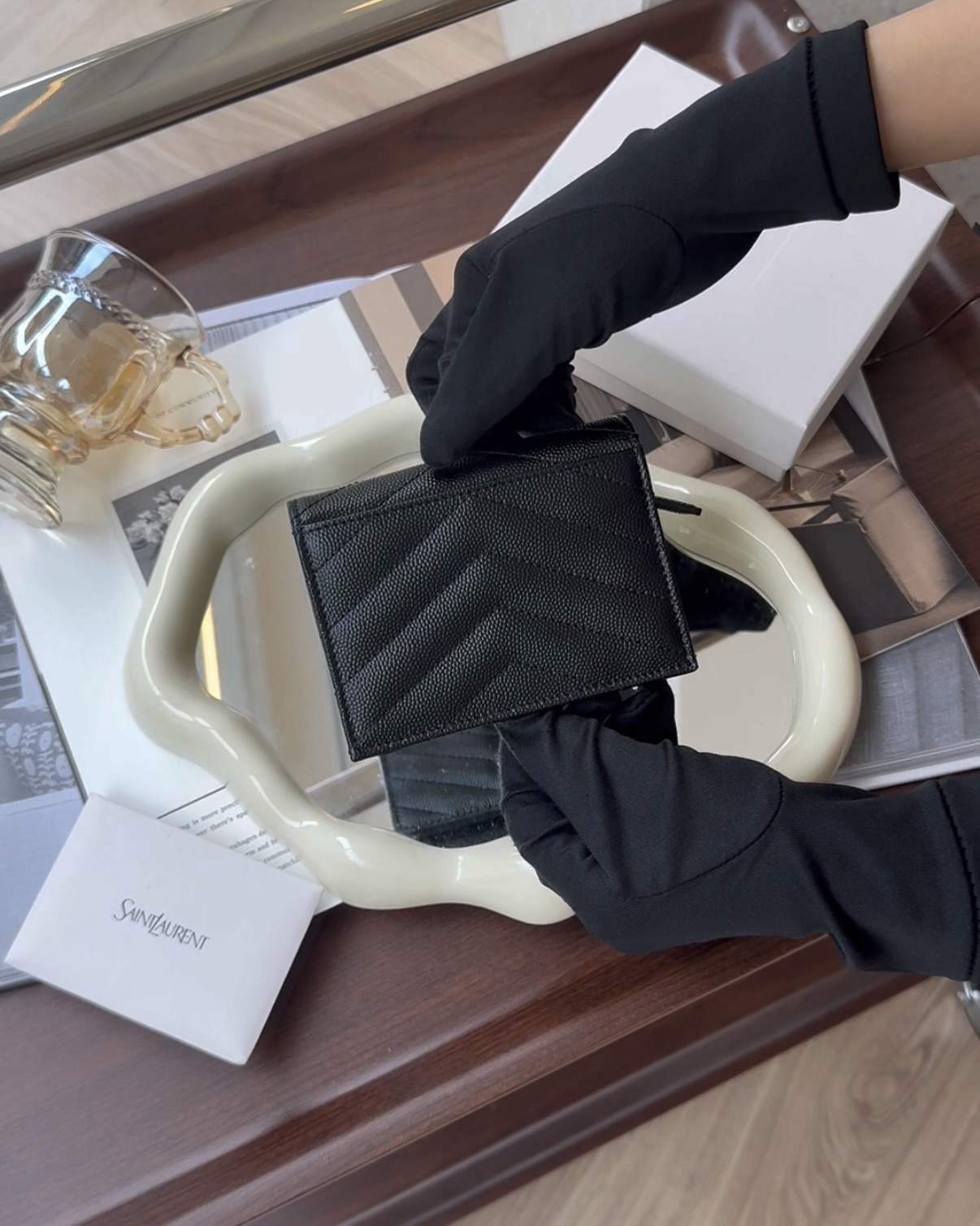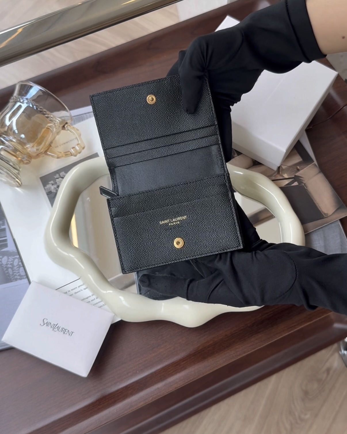 【YSL】魚子醬對開零錢短夾 黑金