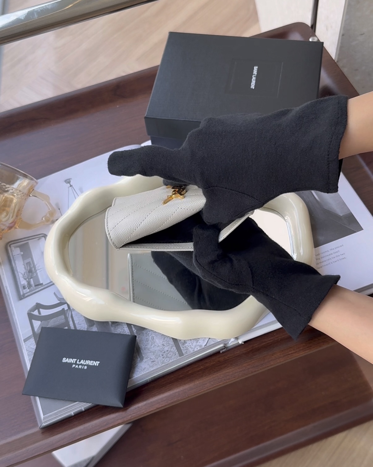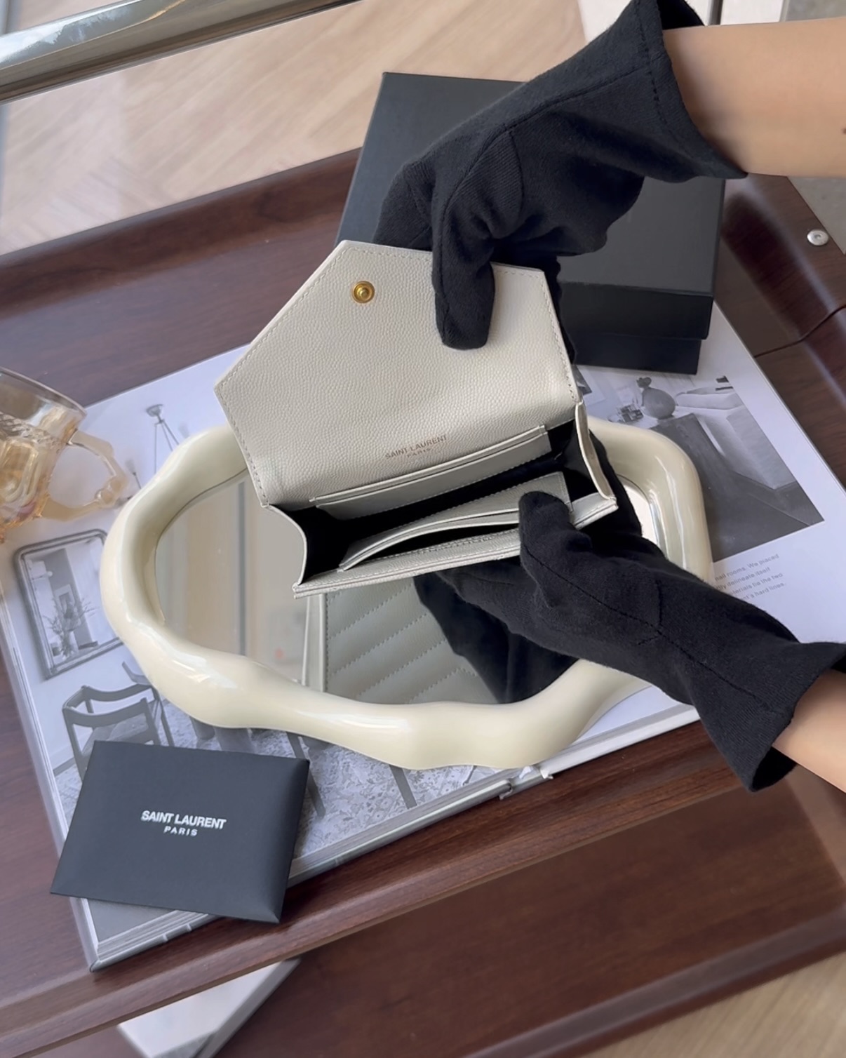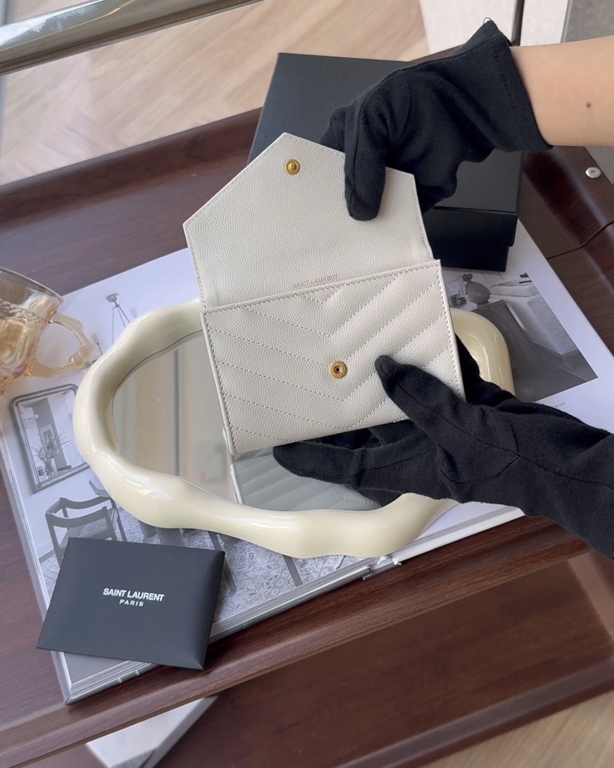 【YSL】MONOGRAM 粒面壓紋皮革卡包 復古白