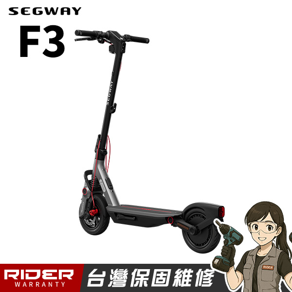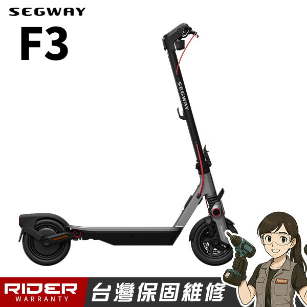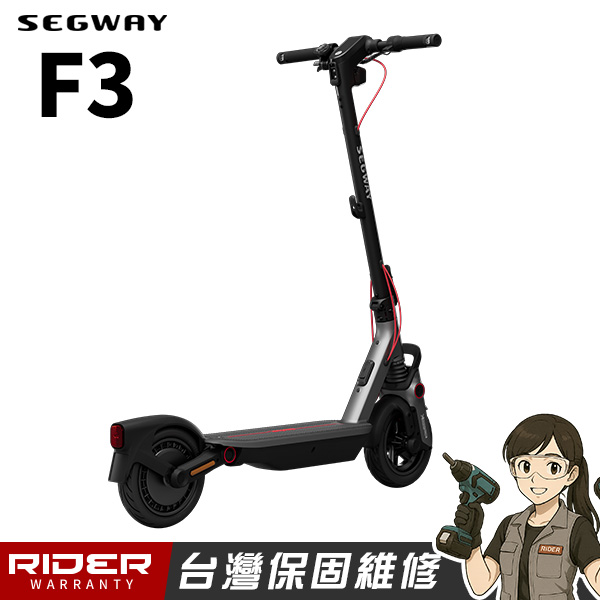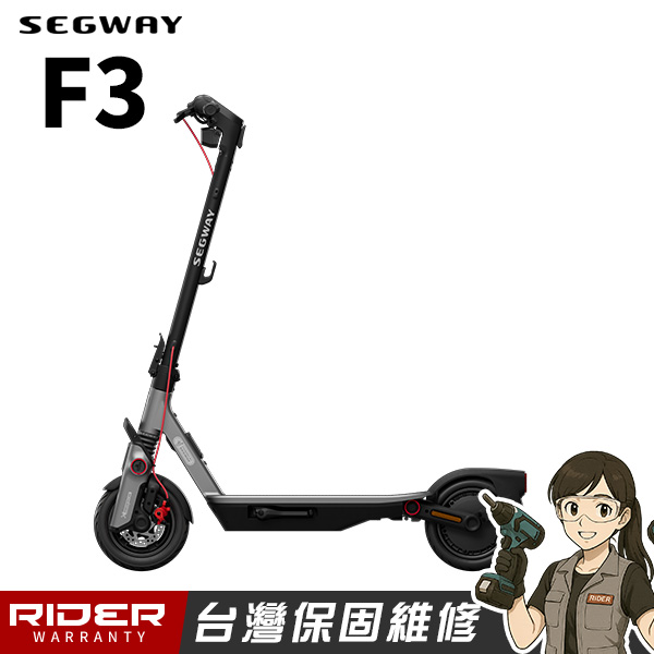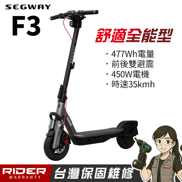 F3是SEGWAY 2025 年主打的全新智慧型電動滑板車,雖然被歸在F系列,但它和F2有極大的差異,反倒更像是G3的精簡版,定位介於旗艦款與入門款之間,功能齊全但價格較低,完美適合日常通勤與週末休閒使用。它搭載 450W 高效率無刷馬達(峰值可達 1000W),最高時速約 32 公里,最大爬坡可達 20%,續航力最長可跑到30-70 公里。和F2系列不同,F3採用鋁合金車架,搭配 10 吋無內胎真空輪胎,並配備前液壓避震+後懸吊避震,騎起來明顯較F2舒適,尤其在市區這種坑坑洞洞的路,差很多。