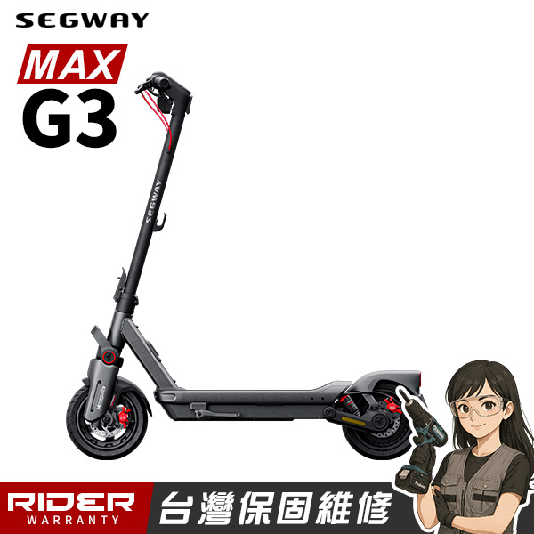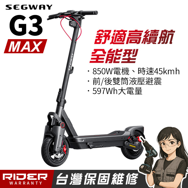 為確保騎乘舒適性,MAX G3配備前雙液壓避震和後雙可調液壓避震系統,有效吸收各種路面震動。11吋自修復真空胎進一步提升抓地力和耐用性。