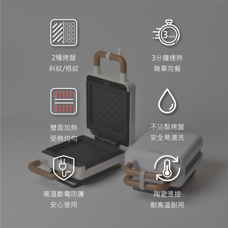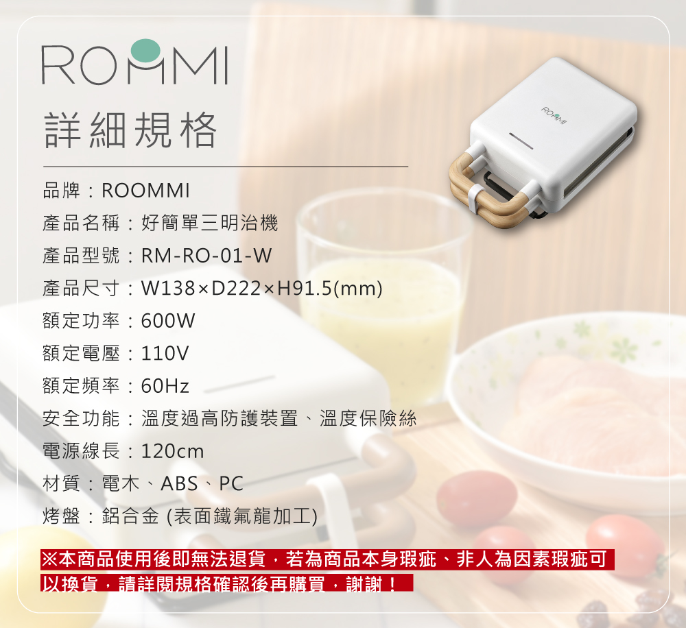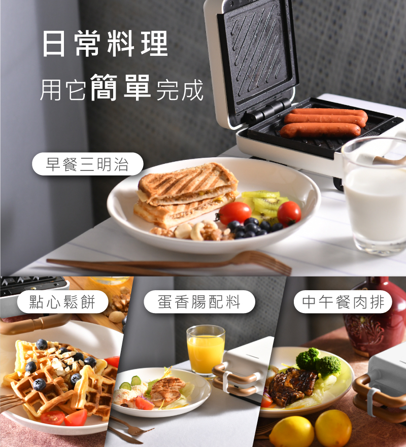 Roommi好簡單三明治機讓你3分鐘美味料理輕鬆上桌!兼具熱壓三明治機、鬆餅機的功能,輕輕一合,早餐三明治、熱狗、肉片、鬆餅就可完成,讓媽媽與小資族的你不用鍋子與瓦斯爐也能享受料理DIY的樂趣。