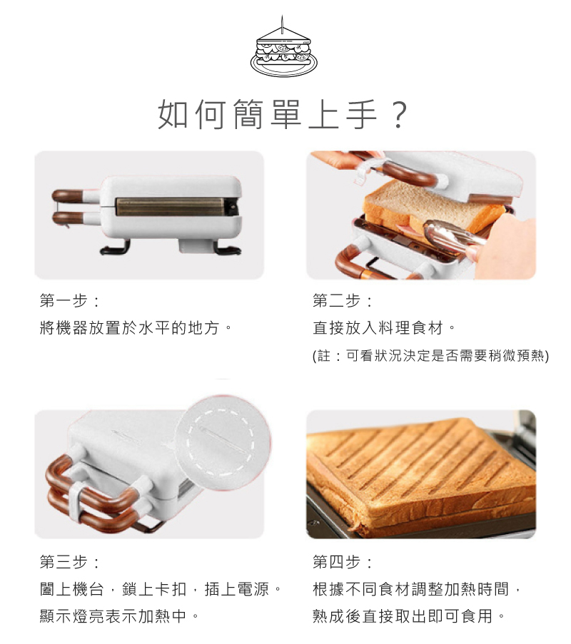 *好簡單三明治機使用後即無法退貨,若為商品本身瑕疵、非人為因素瑕疵可以換貨,請詳閱規格確認後再購買,謝謝!