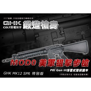 Mk 12 Mod 0 特別用途步槍 簡稱:Mk 12 SPR 全槍長: 1003 mm 槍管長:18.5英寸(457mm) 重量:3.820kg 初速:120m/s (使用0.2g BB彈 測試) 動力:瓦斯(建議使用12kg壓力) 美軍於持久自由行動和伊拉克行動中 把SPR SOPMOD特種用途機匣 作為狙擊步槍或精確射手步槍 PRI Gen III浮置式管狀護木 使護木不接觸槍管,消除槍管振動增加準確性 附三片專用魚骨片,方便射手加裝握把瞄具, 變更戰術布局 髮絲紋 鋁殼20發短匣 PRI上翻式準星 搭配GHK原廠鍛造CNC槍身 硬陽處理 更為貼近實槍外觀 標配加強型覆進簧及擊錘簧,擬真其操作手感 新版快調hop組+快調HOP工具 在射擊時能快速應彈重調整當下平順的彈道