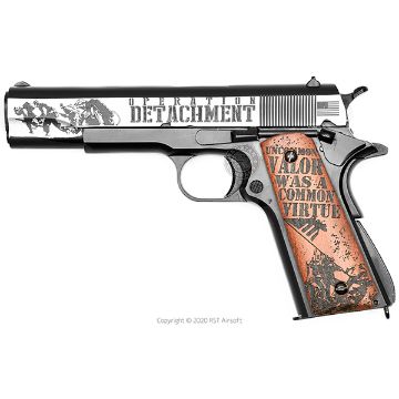 這是為硫磺島戰役 紀念性的造型 硫磺島戰役在1945年2月19日至3月26日期間,是美國軍事史上最艱難的一場勝利 滑套右側刻有"Iwo Jima"的字樣與日期;左側刻有“Operation Detachment”的字樣與戰斗場景 握把右側刻有鷹和錨;左側刻有切斯特海軍上將尼米茲(Nimitz)的名言“Among the men who fought on Iwo Jima, uncommon valor was a common virtue”,以及士兵於該島的摺鉢山上豎起了星條旗的場景