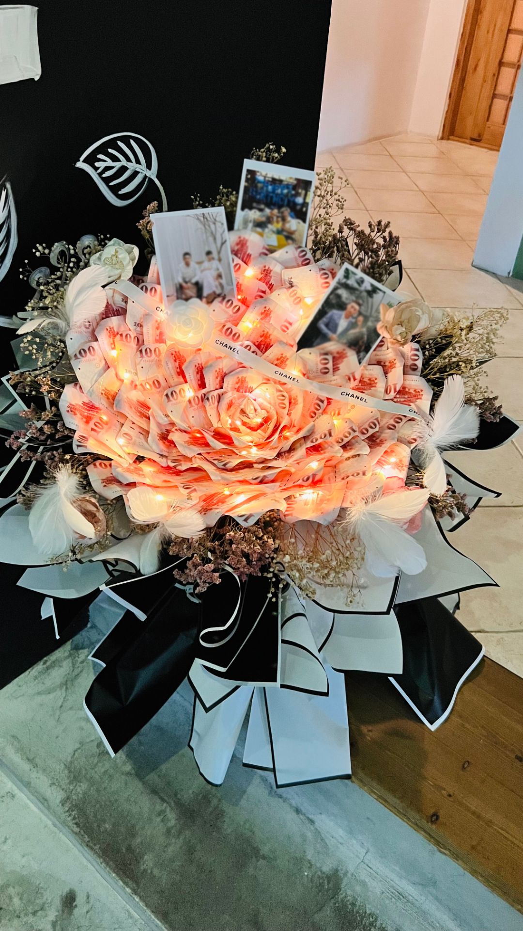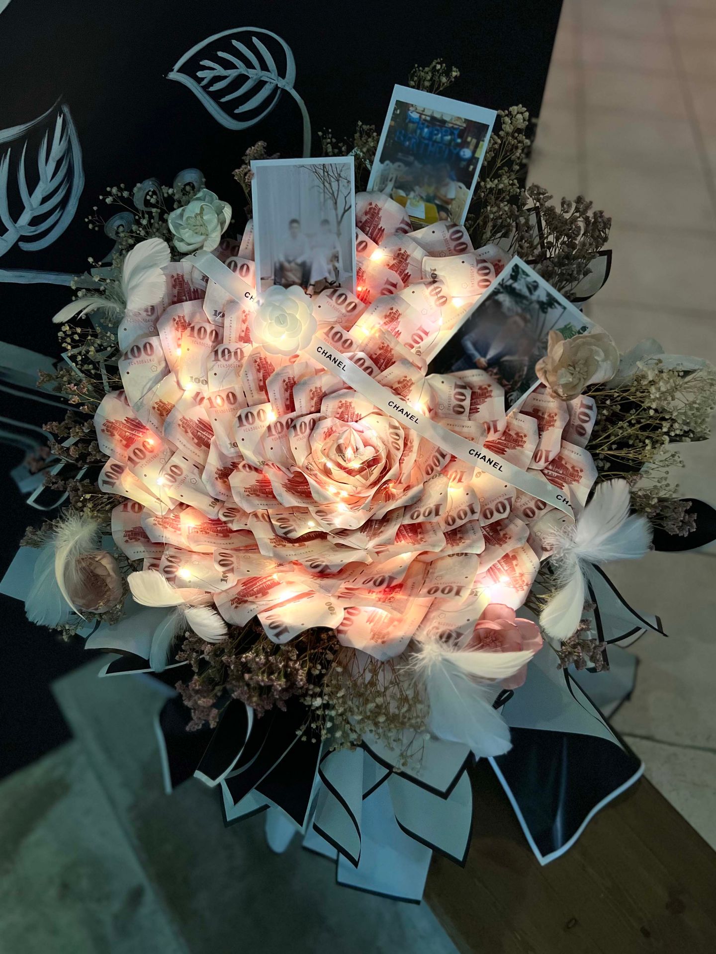 設計內容:黑白小香風雙層次包裝+黑白棉花內襯+星空led燈+羽毛+珍珠香氛花+索拉花+卡斯比亞+滿天星+品牌緞帶