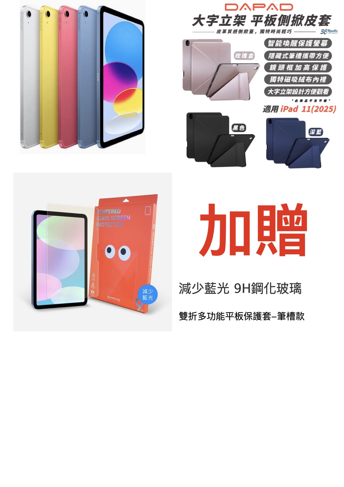 Apple iPad 11 (2025)Wi-Fi  加贈 9H藍光玻璃保護貼 + 大字立架平板側掀皮套 (台灣公司貨)